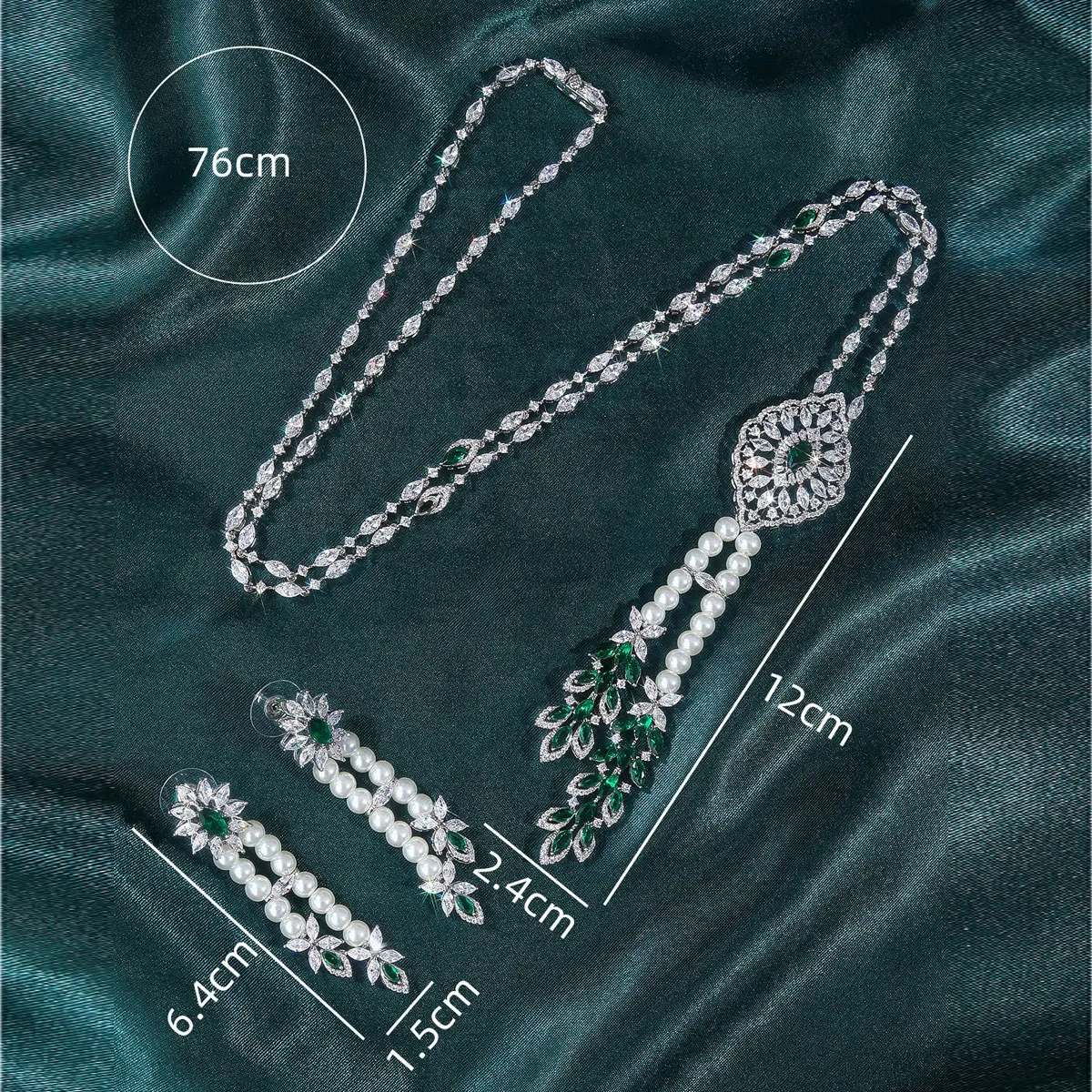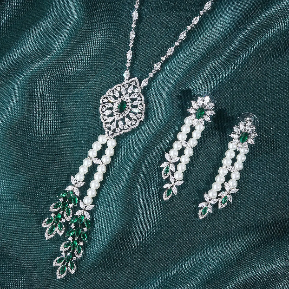 BRIDETALK Women's Classic Pearl Tassel Necklace Earrings Set Green Zircon Brass Inlaid for Banquets Parties Fashion Jewelry