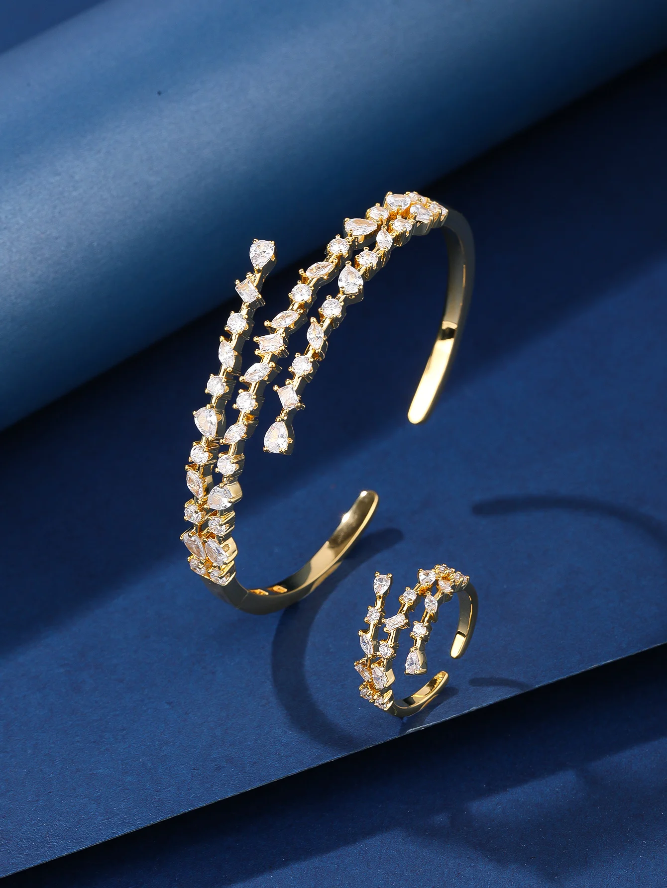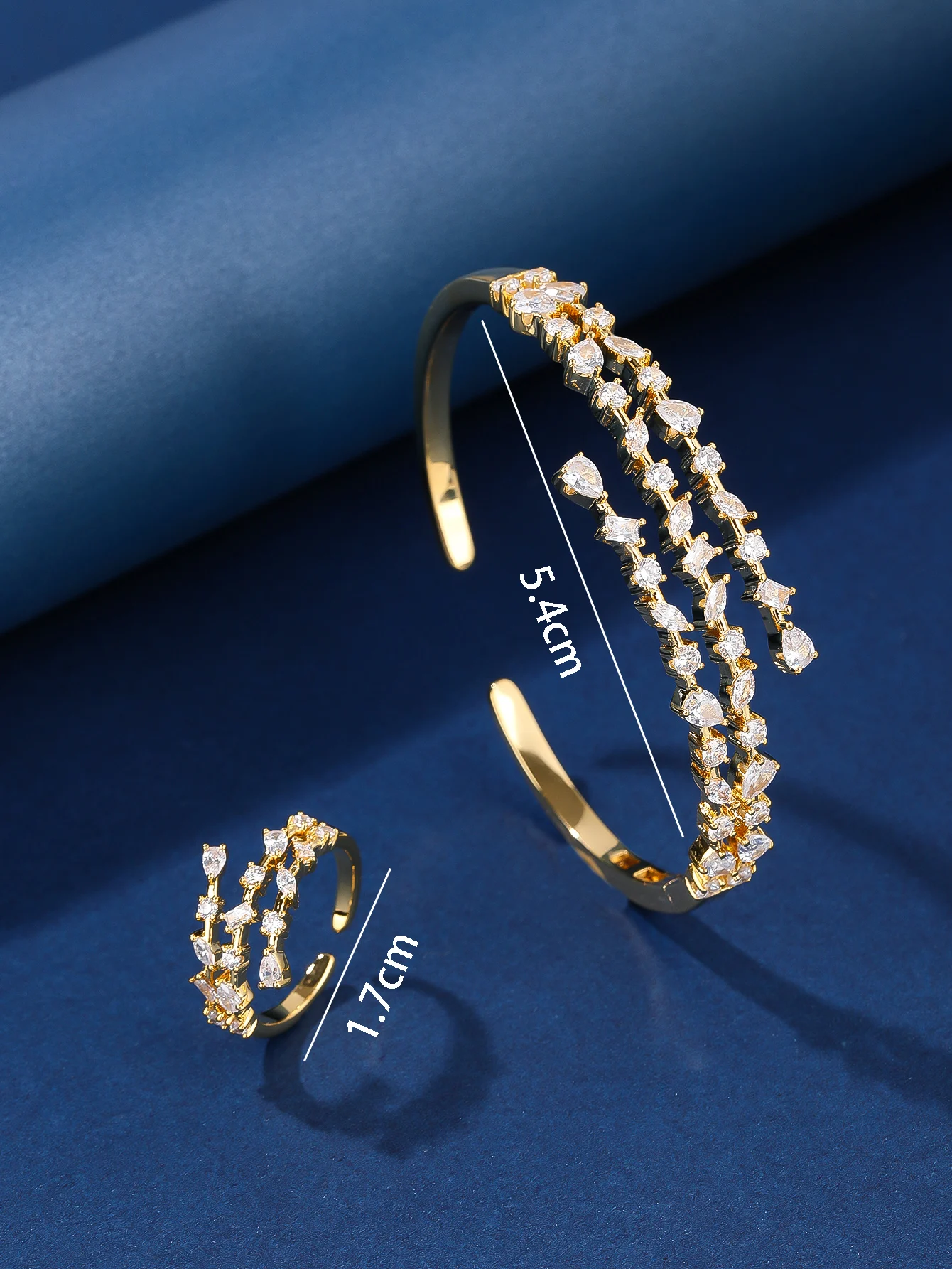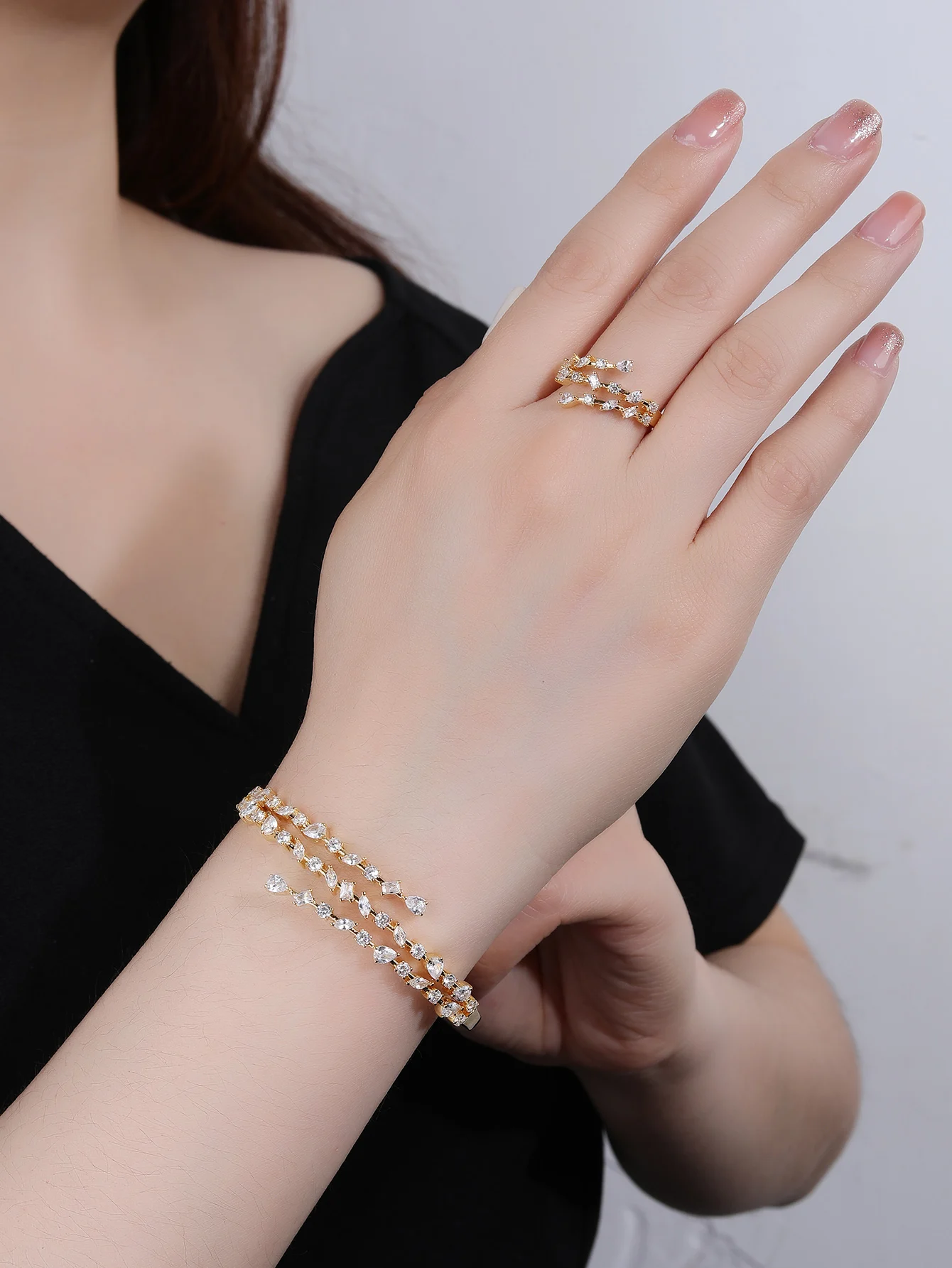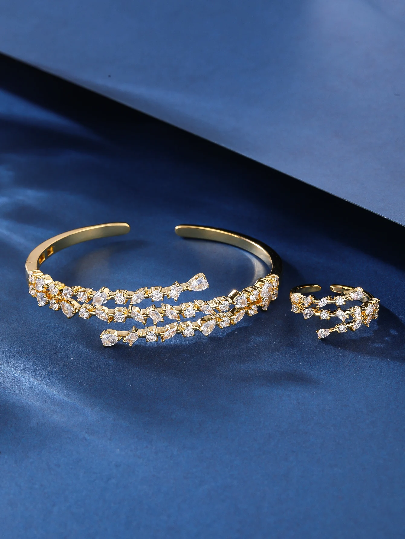 Vintage Inspired Zircon Bracelet & Ring Jewelry Set Brass Rhodium Plated Retro Bridal Wedding Gift for Women