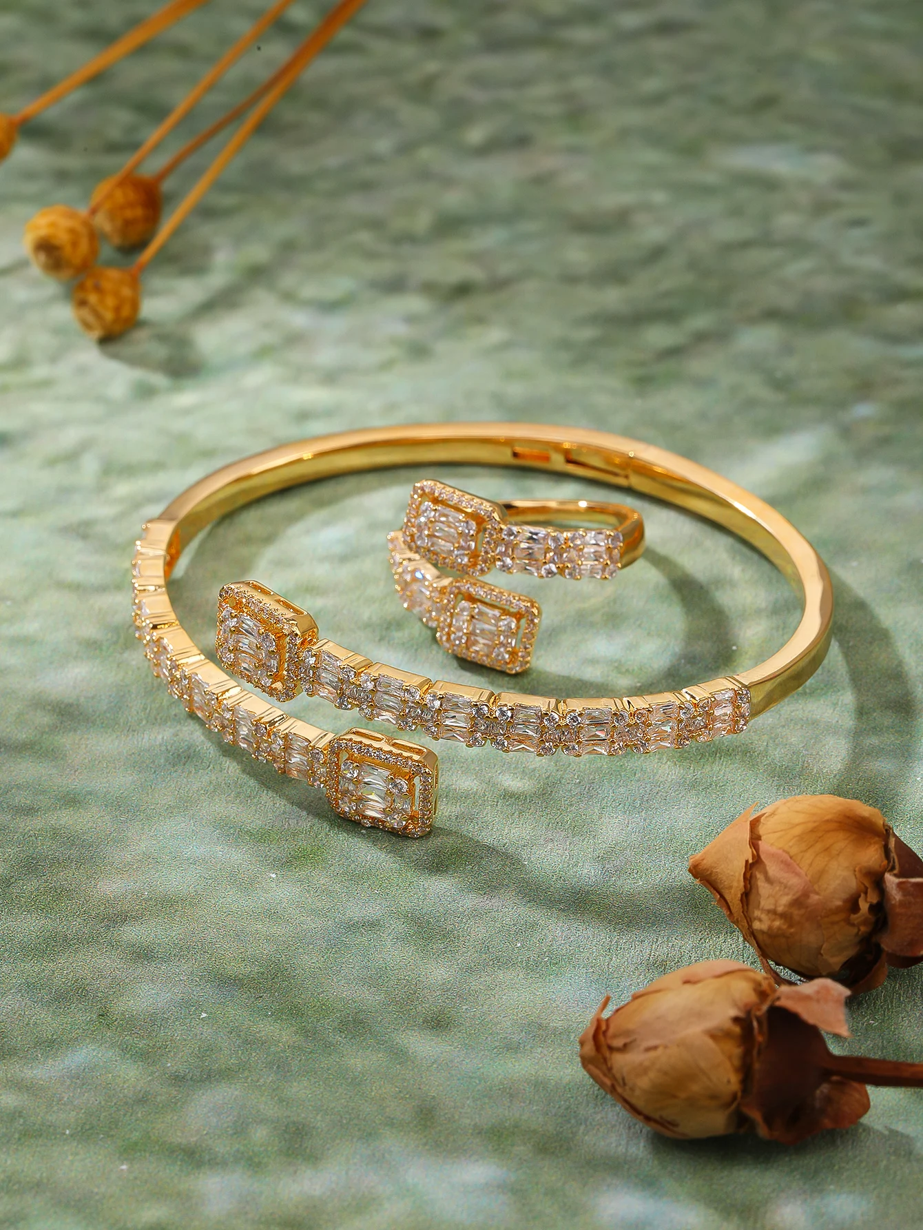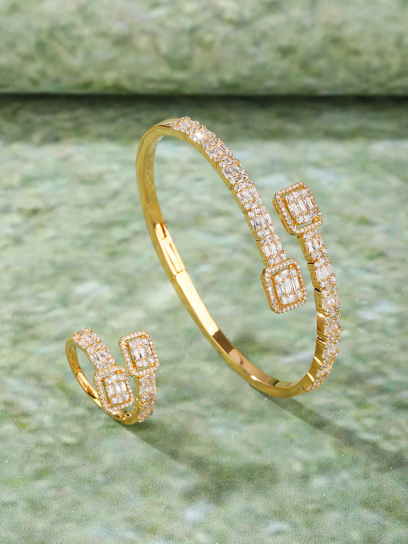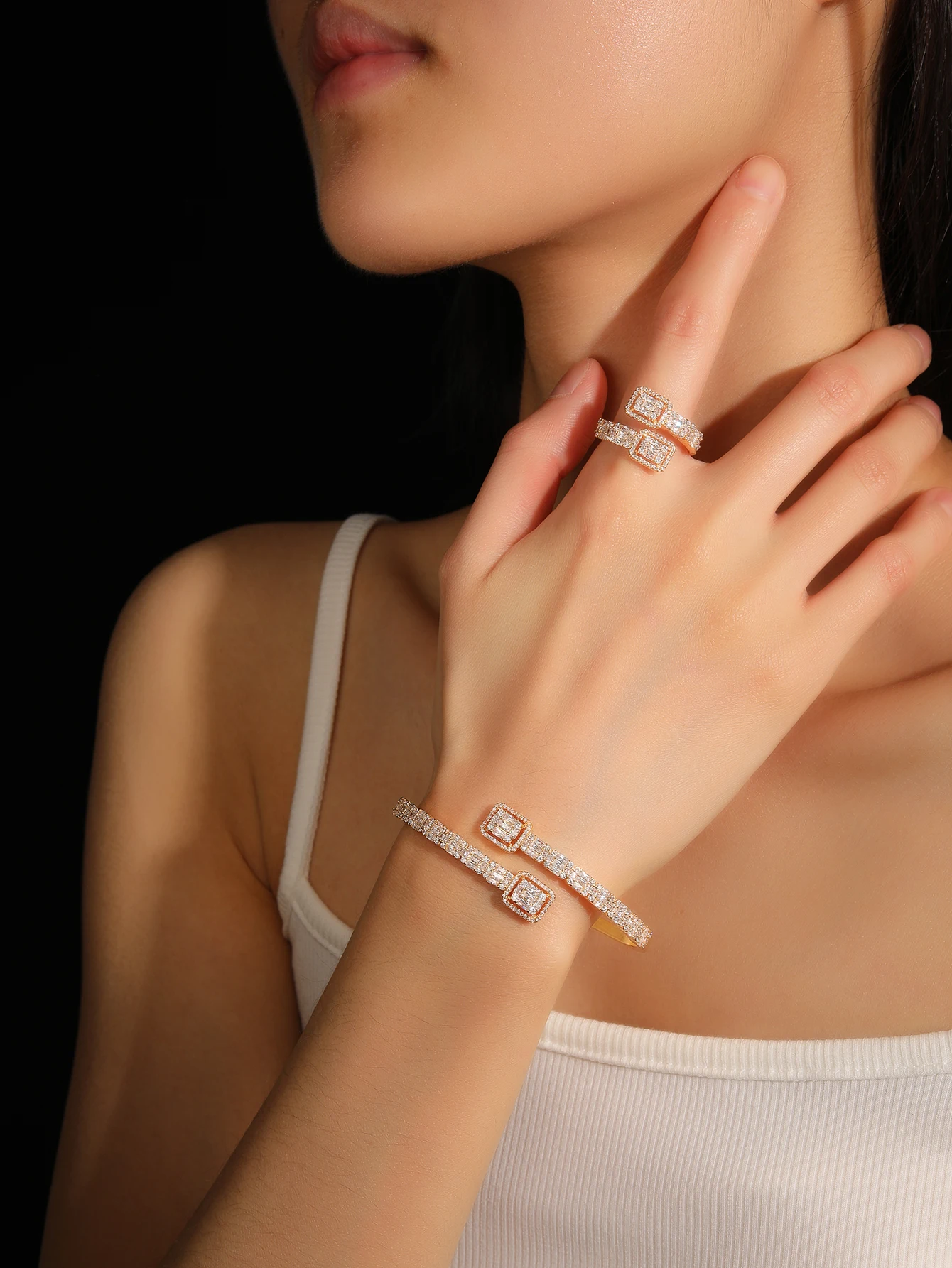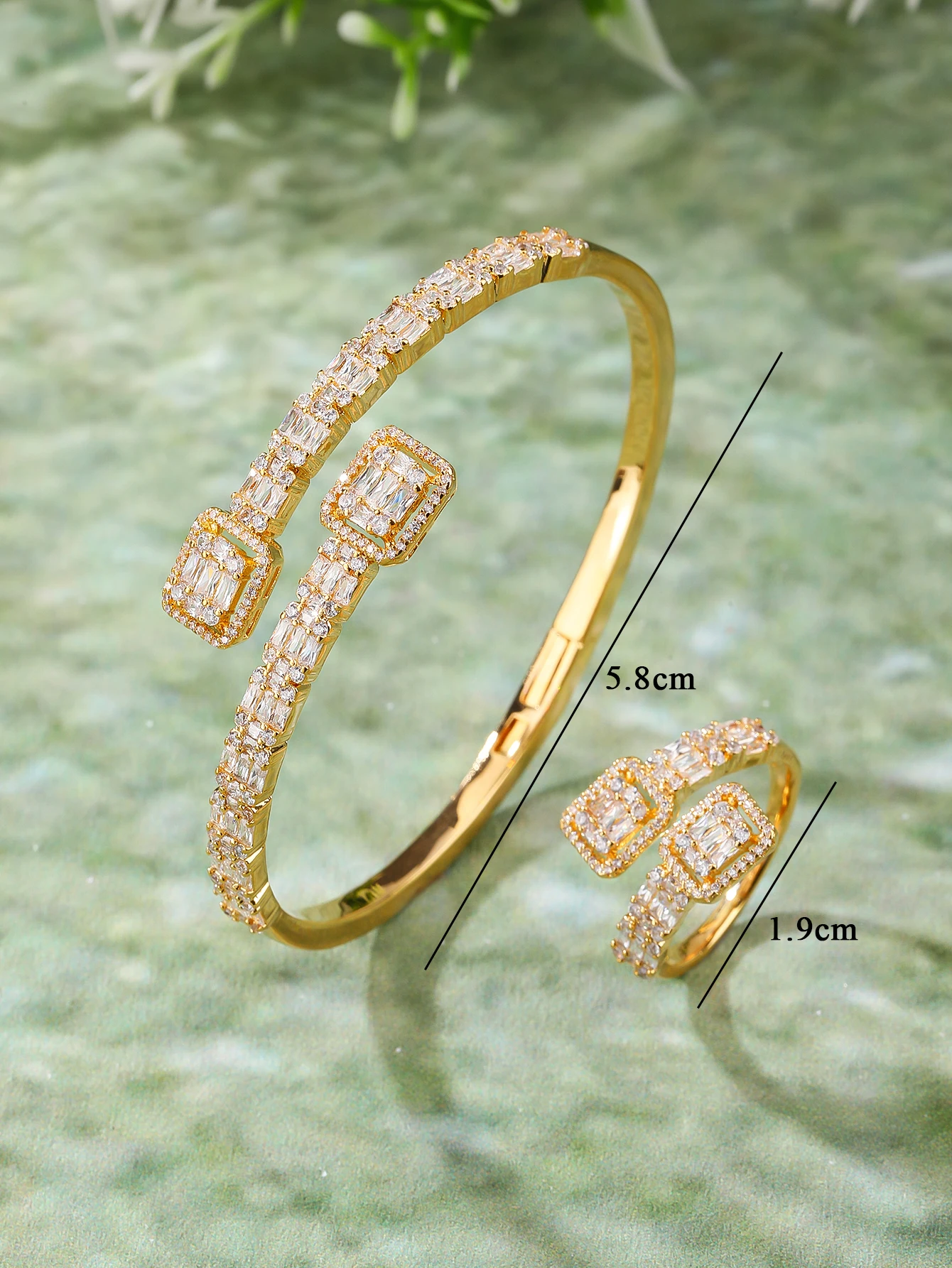 Sparkling Classic Wedding Engagement Party Jewelry Set Zircon Rhodium Plated Brass Bracelet & Ring Suite