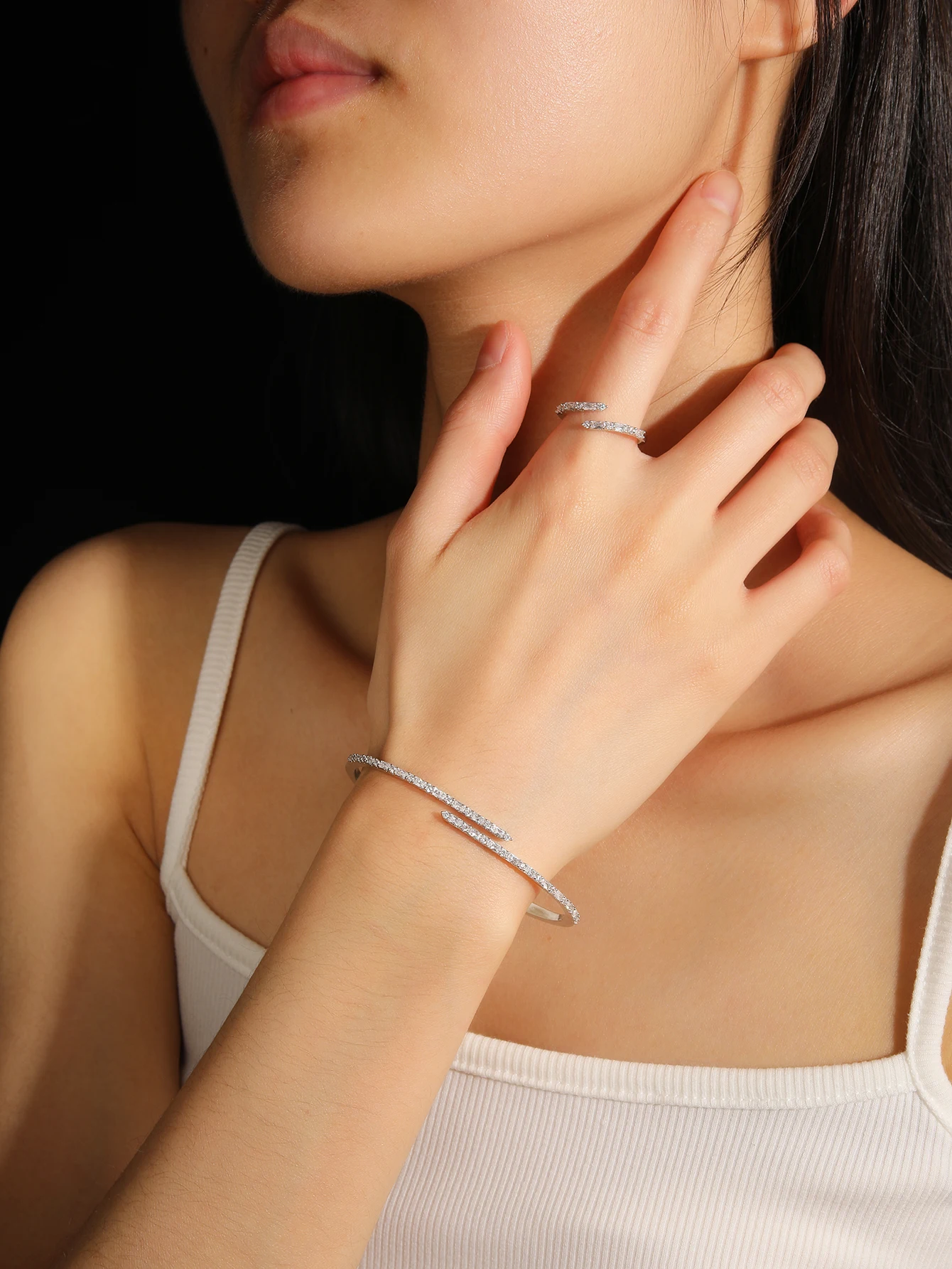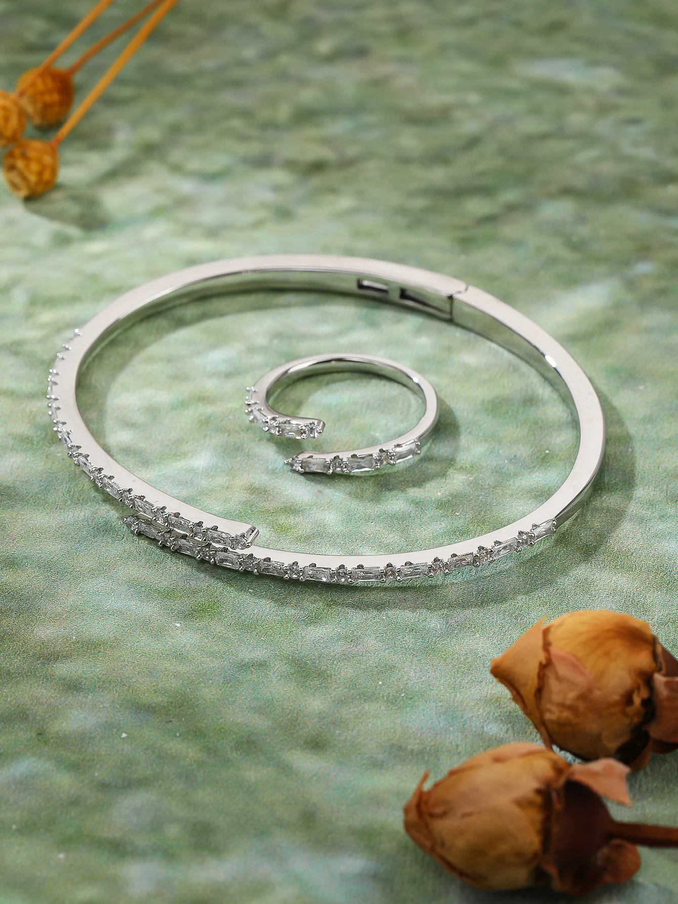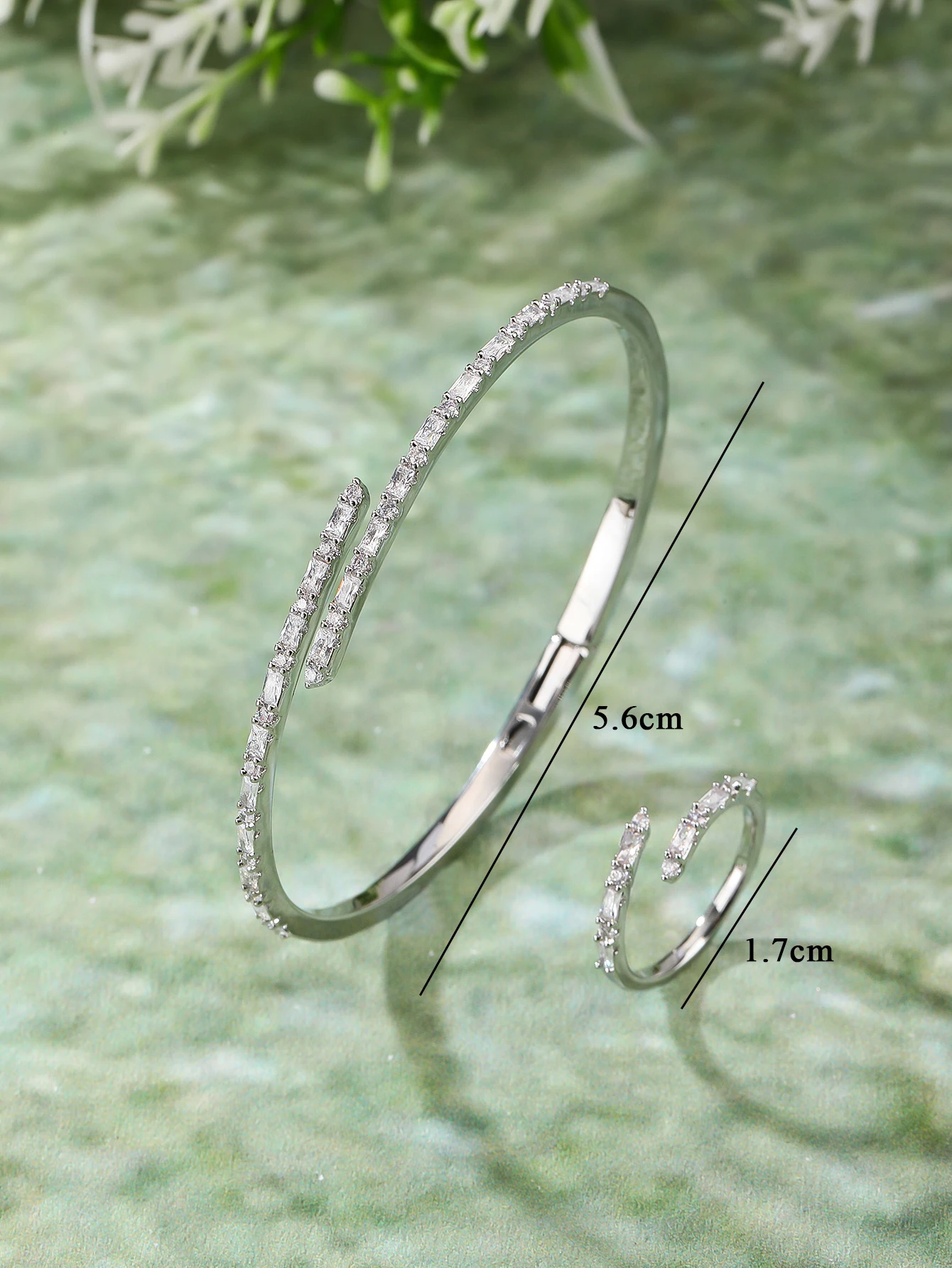 Anniversary Party Jewelry Set Designer Pattern Rhodium Plated Crystal Bracelet & Ring Suite