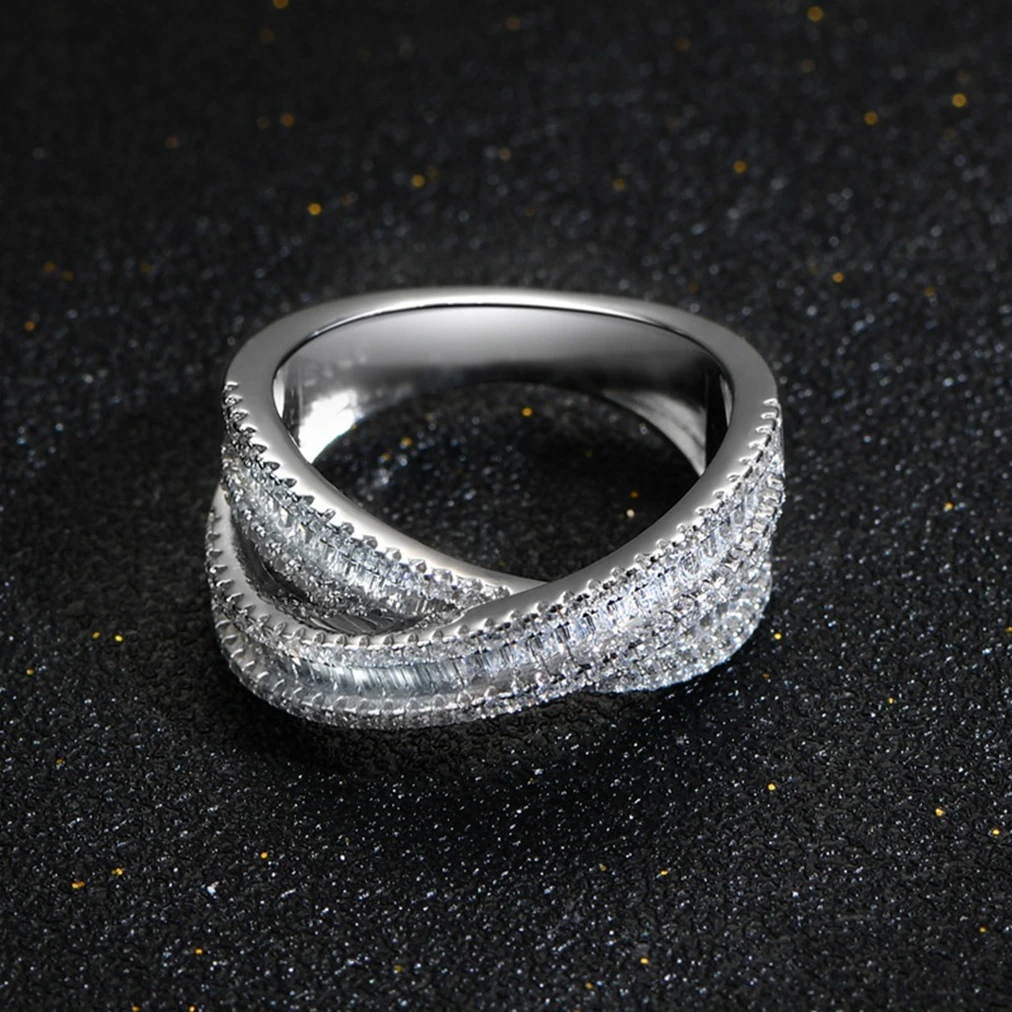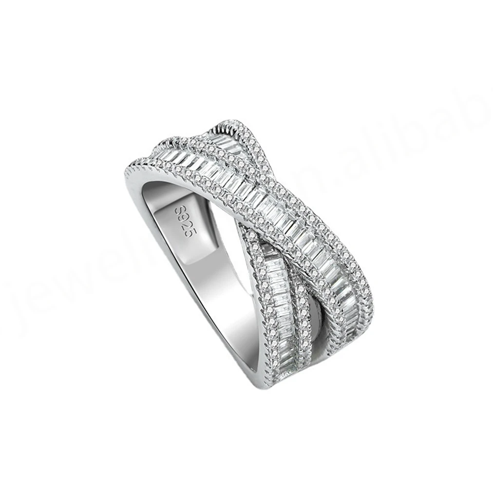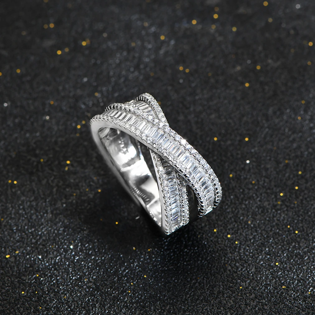 S925 Sterling Silver Platinum Plated Emerald Cut Lab Diamond Cross Double Layer Ring Women's Trendy Gemstone Ring