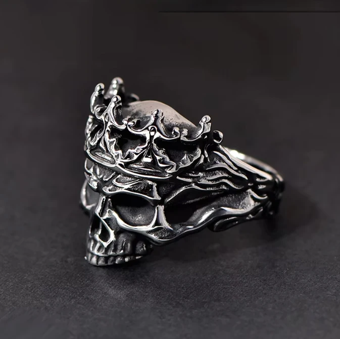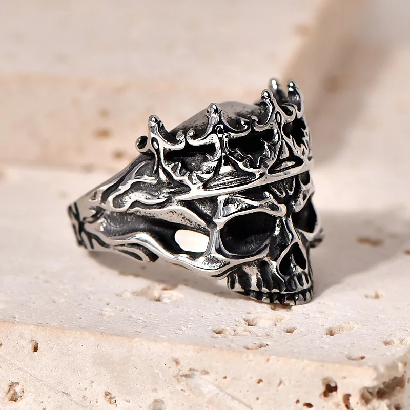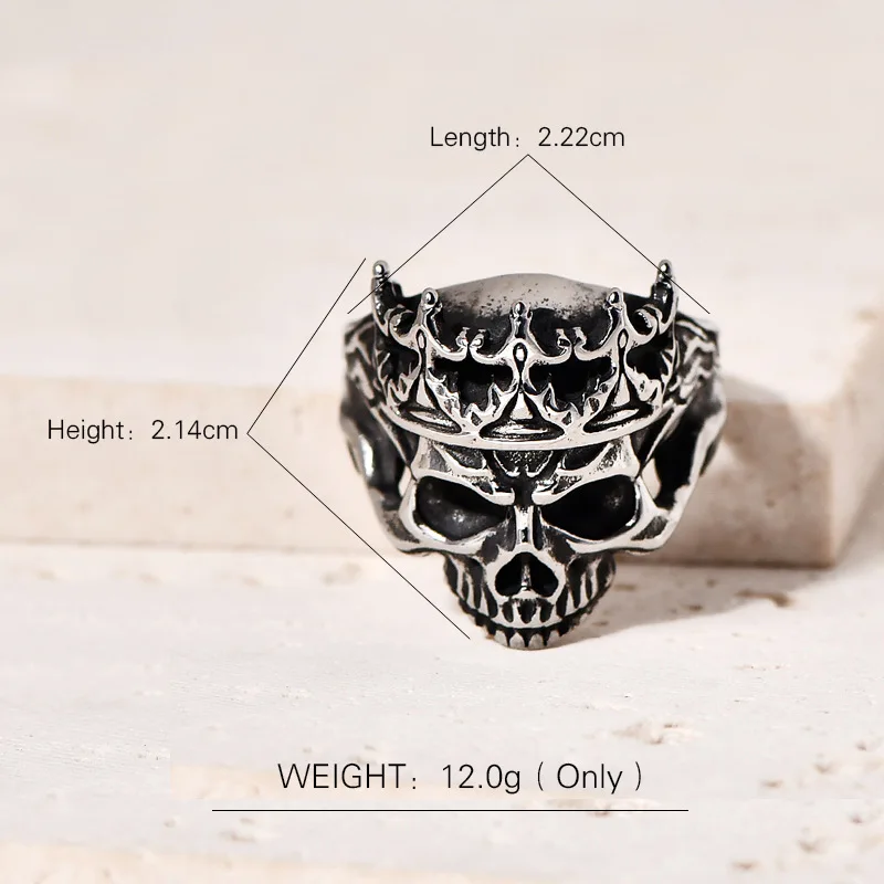 Punk Stainless Steel Skull Crown Ring with Natural Stone and Geometry Design Antique Silver Plated Men's Jewelry Wholesale
