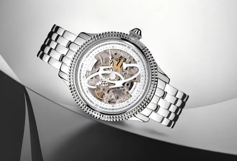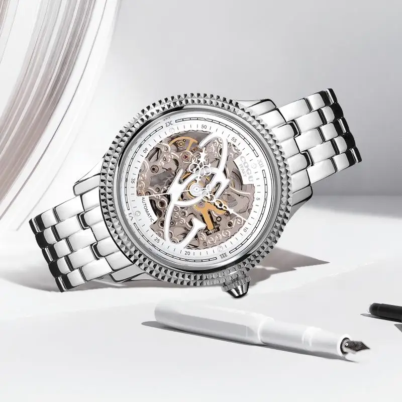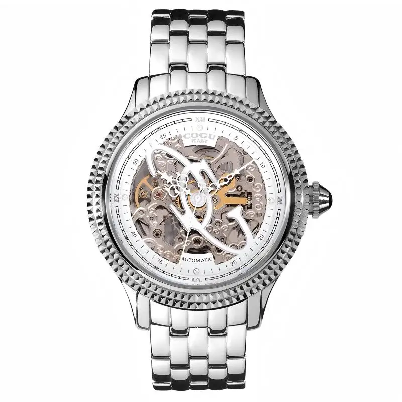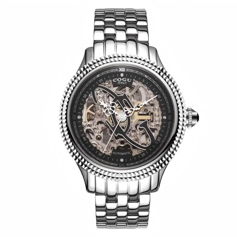 Simple Fashionable Luxury Water-Resistant Business Skeleton Watch with Stainless Steel Band 46mm Dial Diameter 20mm Band Width