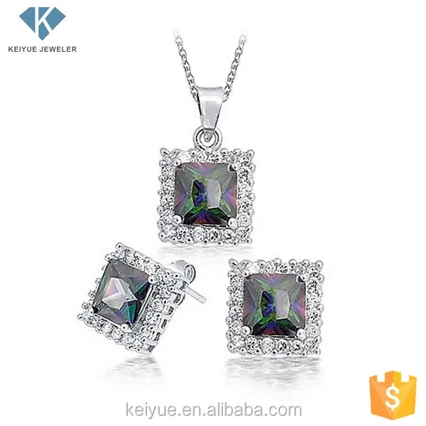 Keiyue Square Shaped Colorful Big Stone Rani Haar Platinum Necklace Earrings Set for Parties Weddings with Zircon Main Stone