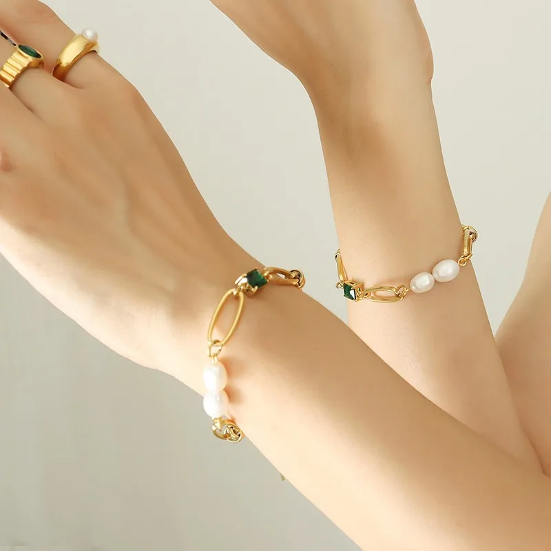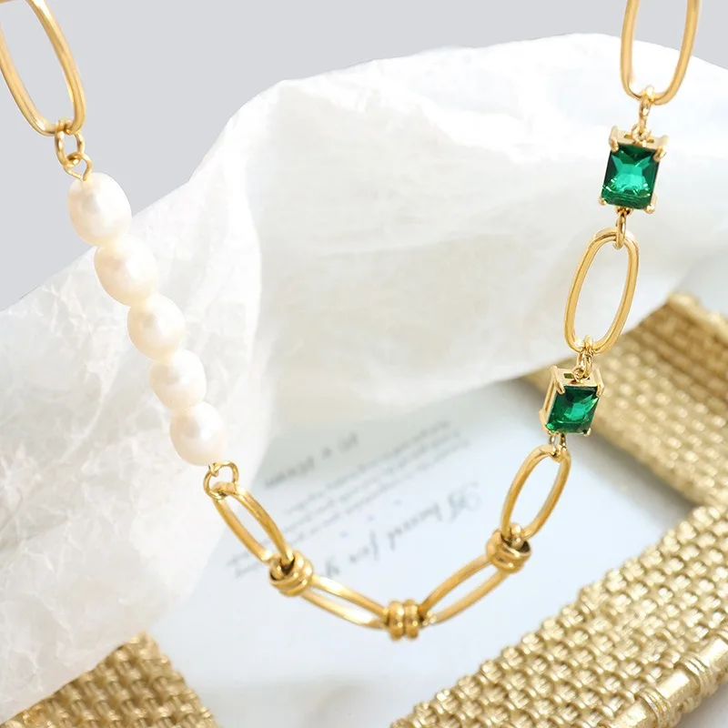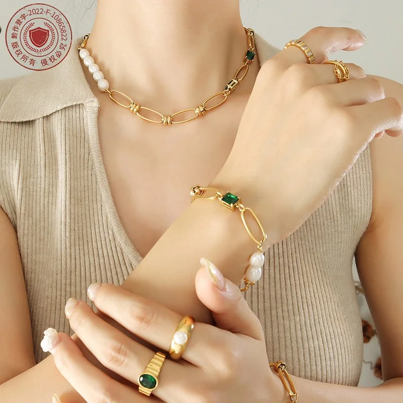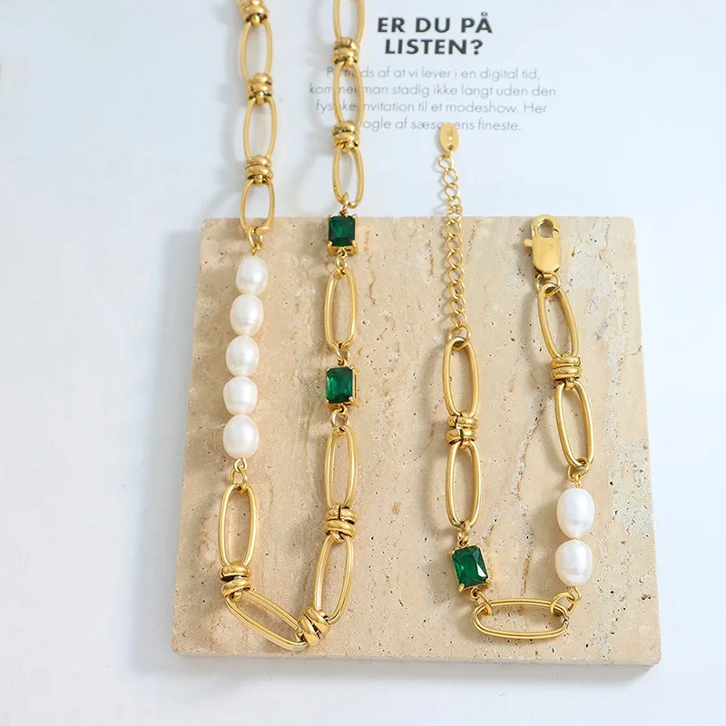 Gentle Temperament Retro Emerald Zircon Fresh Water Pearl Link Chain Necklace Set Link Chain Pearl Zircon Necklace Bracelet Set