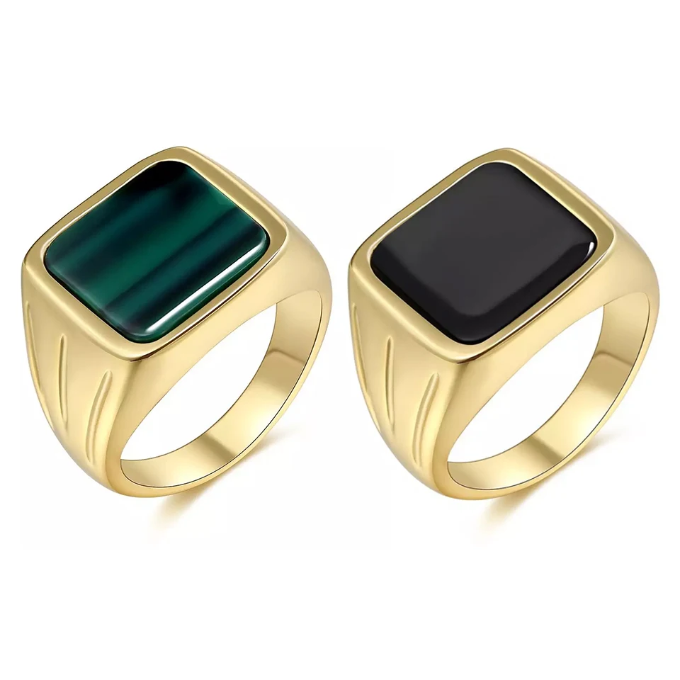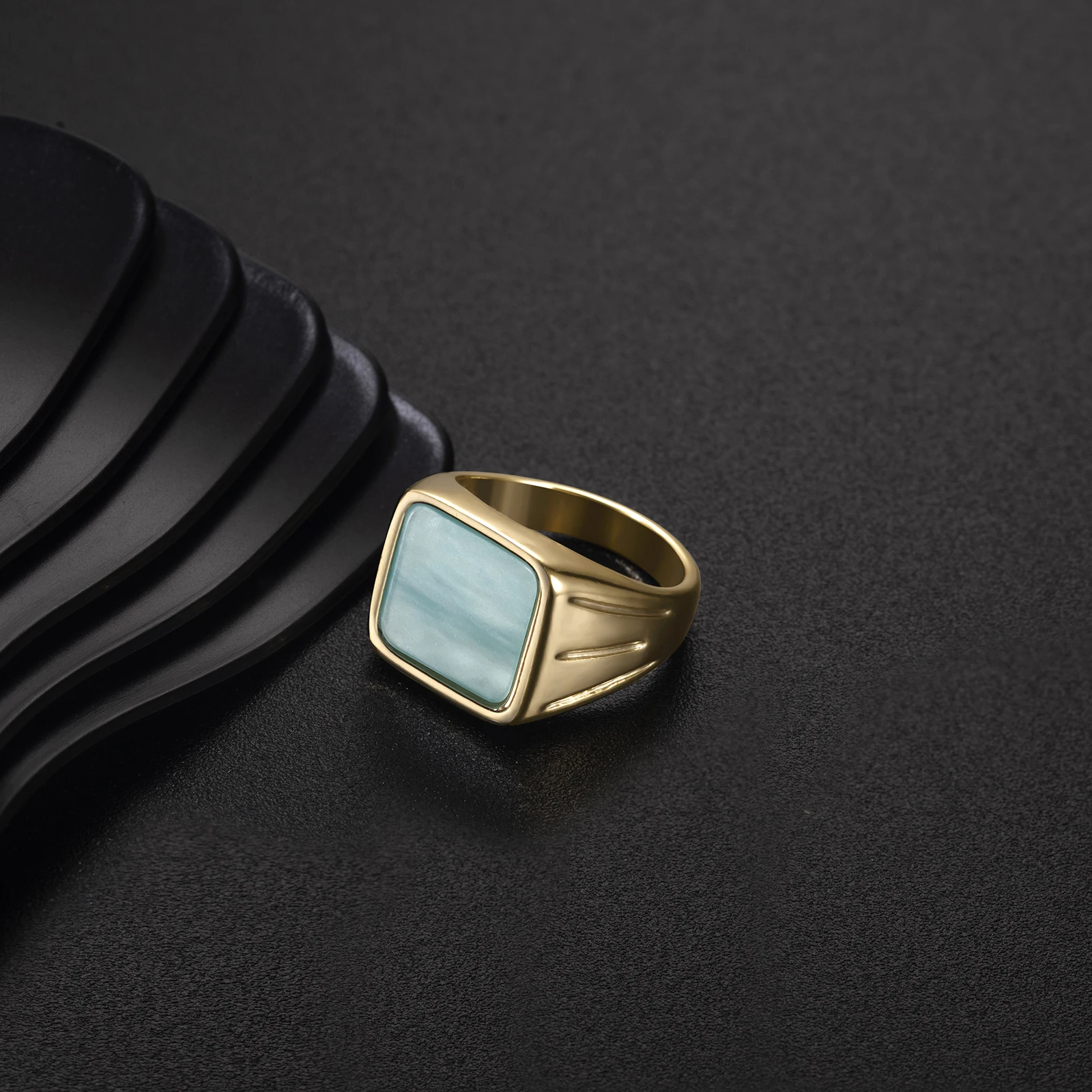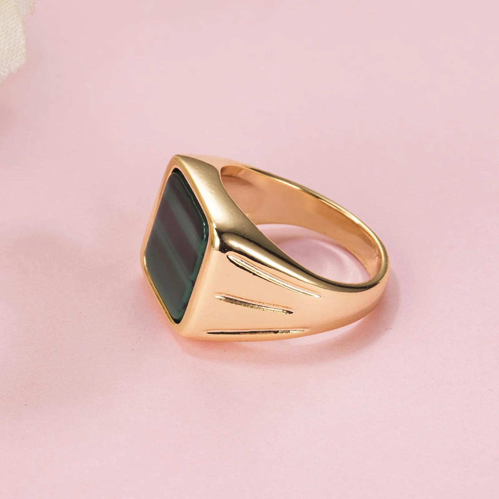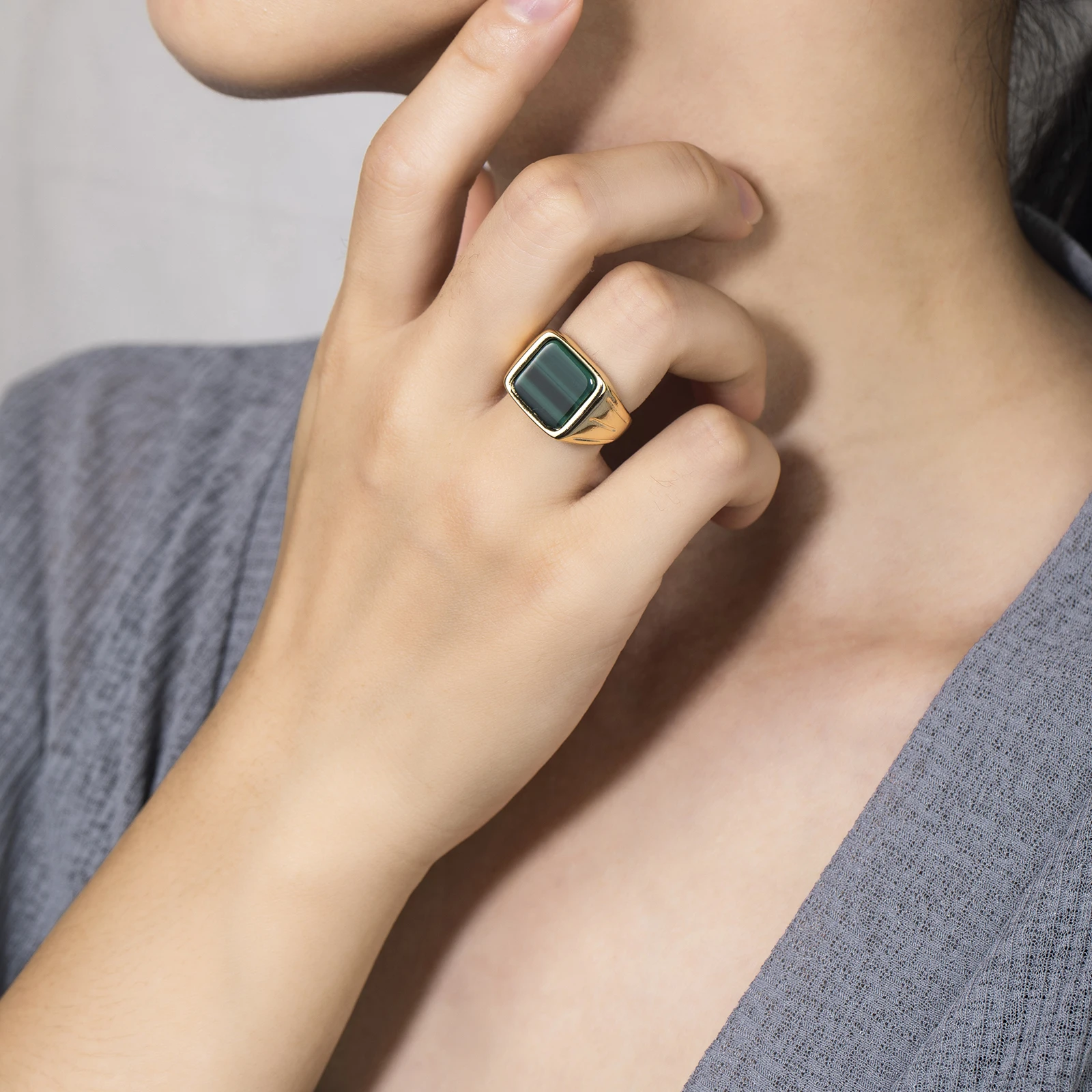 Vintage 18K Gold Plated Brass Square Signet Ring Waterproof Green Emerald Gemstone for Men and Women Stainless Steels Jewelry
