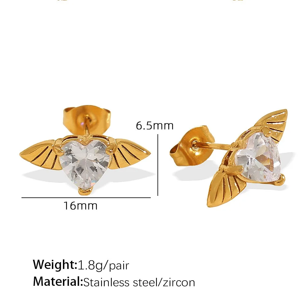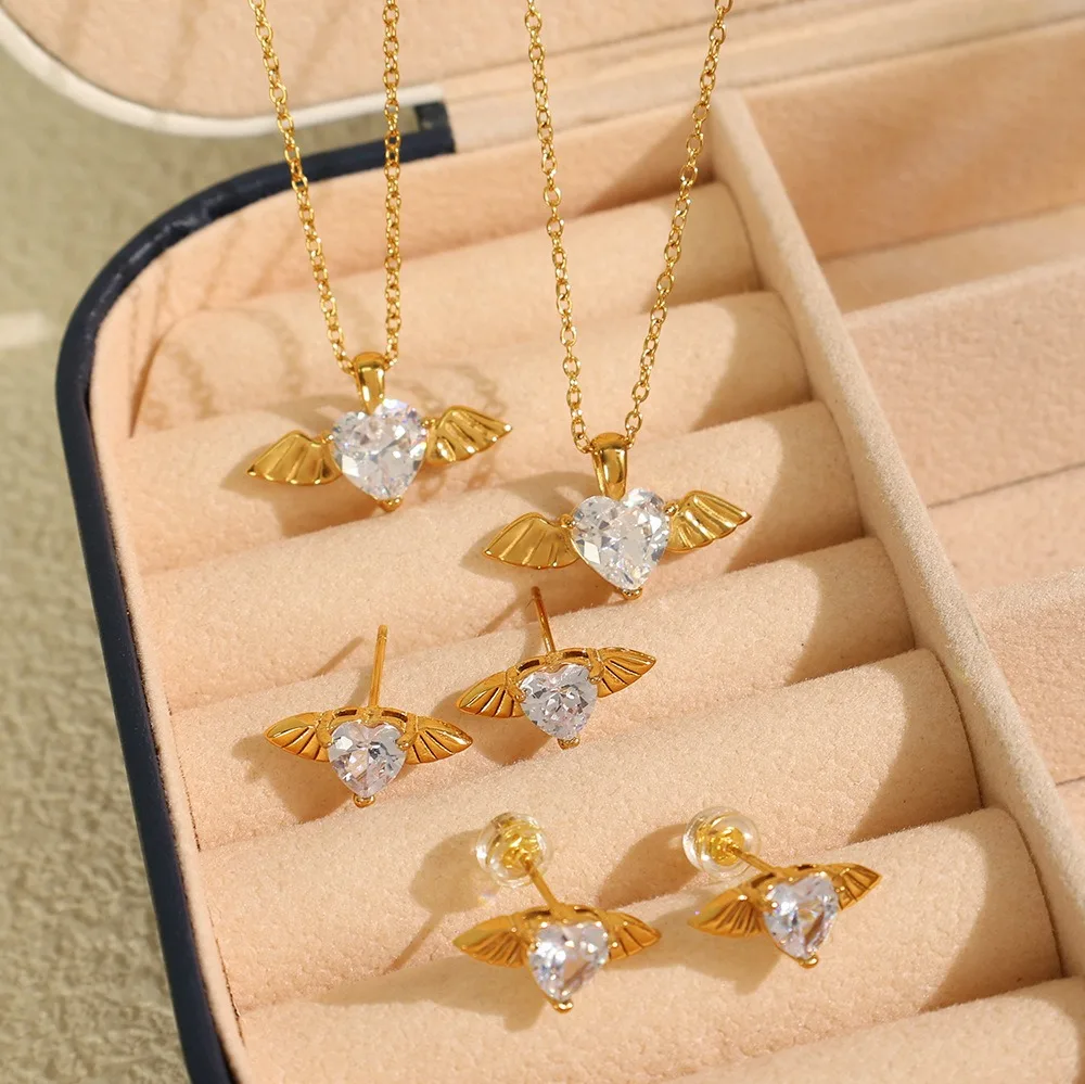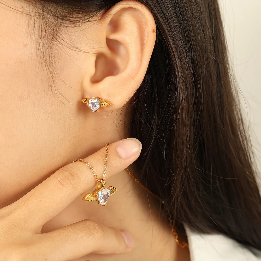 New Fashion Waterproof Stainless Steel Angelwings Jewelry Set Big Zircon Heart Swing Necklace Heart Stud Earrings for Weddings