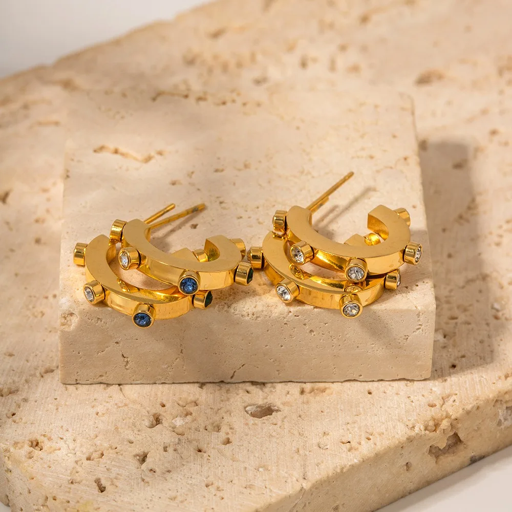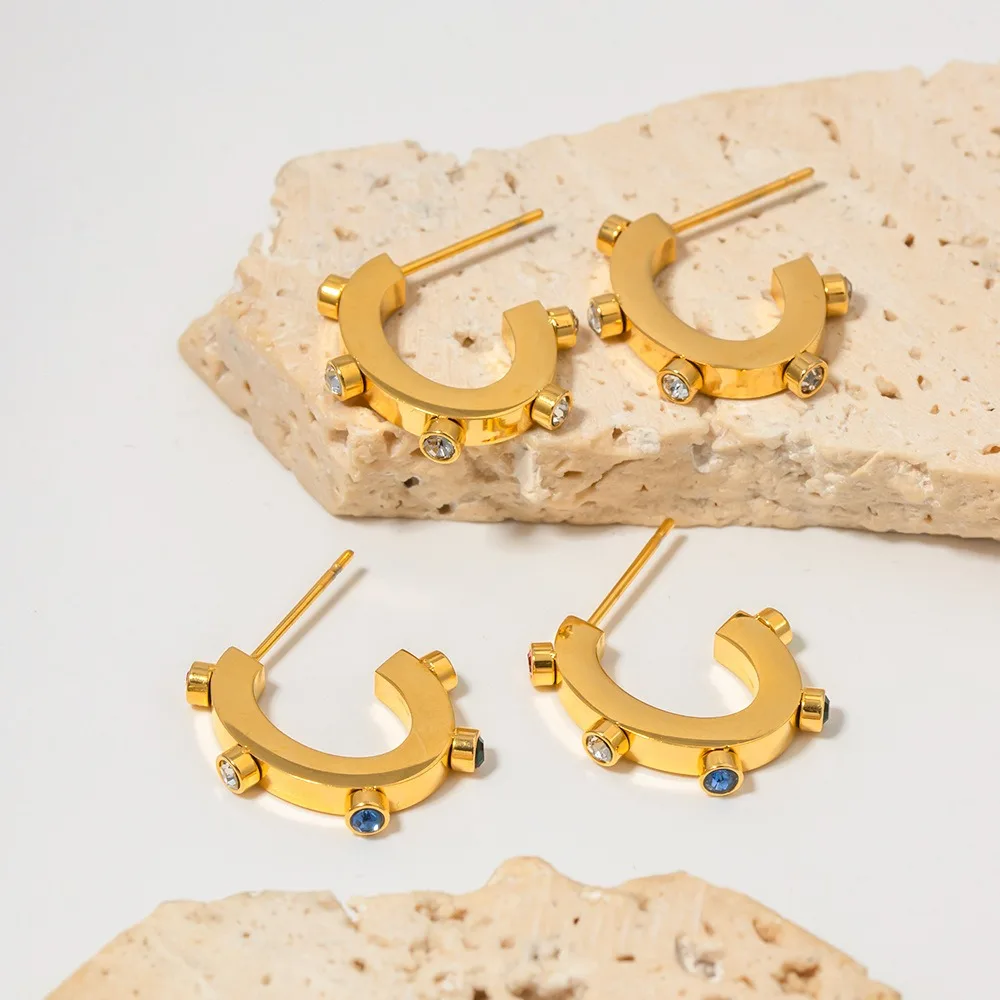 Ins Fashion Blogger C-Shaped Earrings 18K Gold Stainless Steel with Colored Diamond Trendy Exaggerated Design