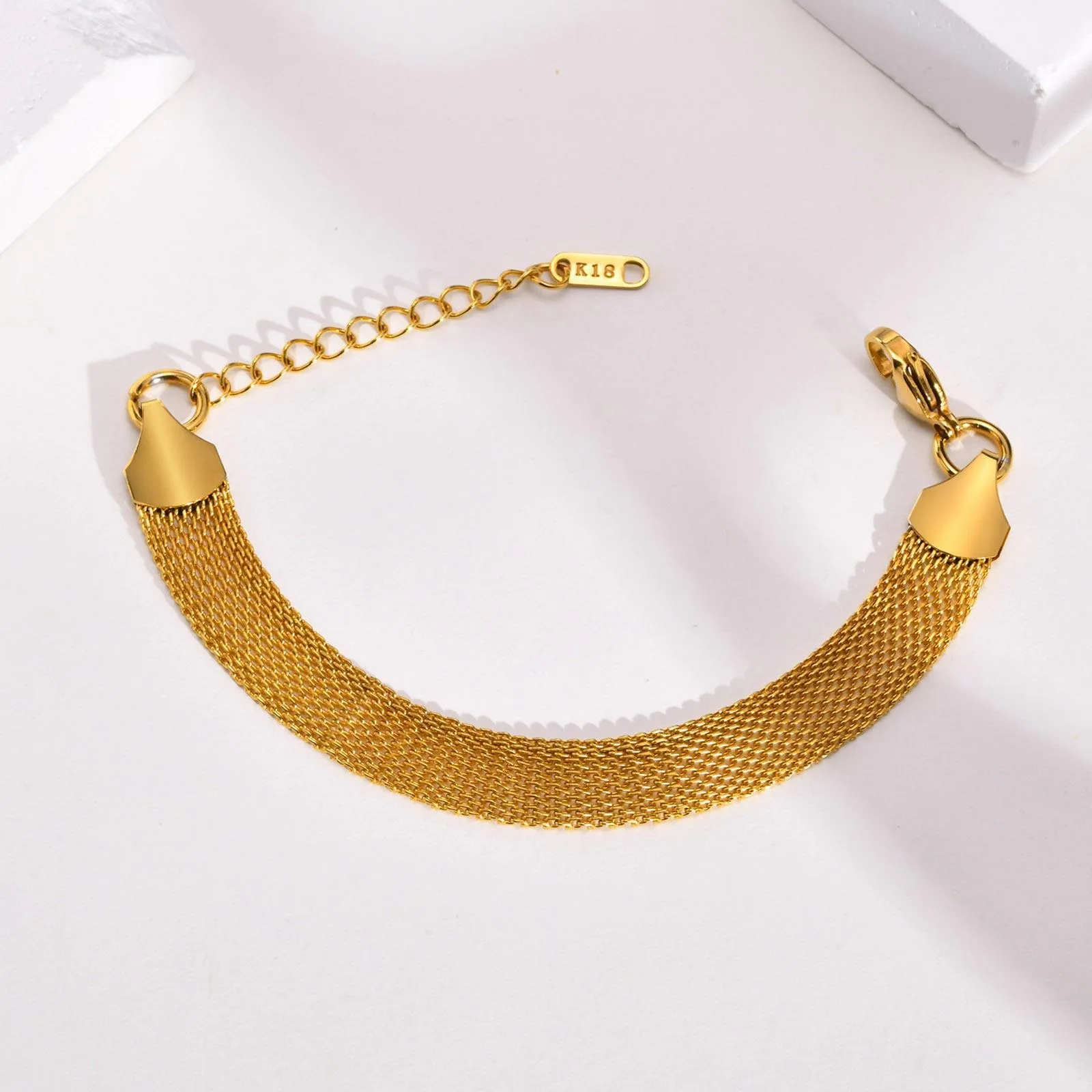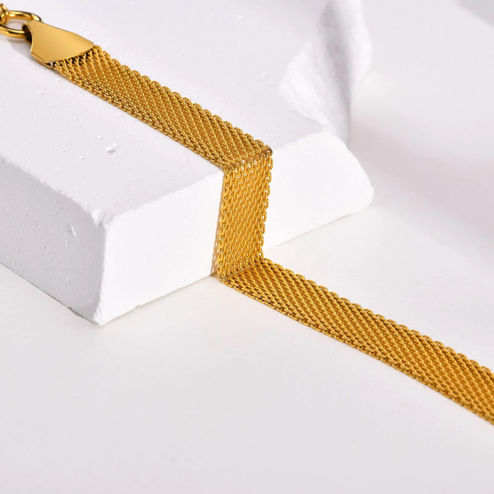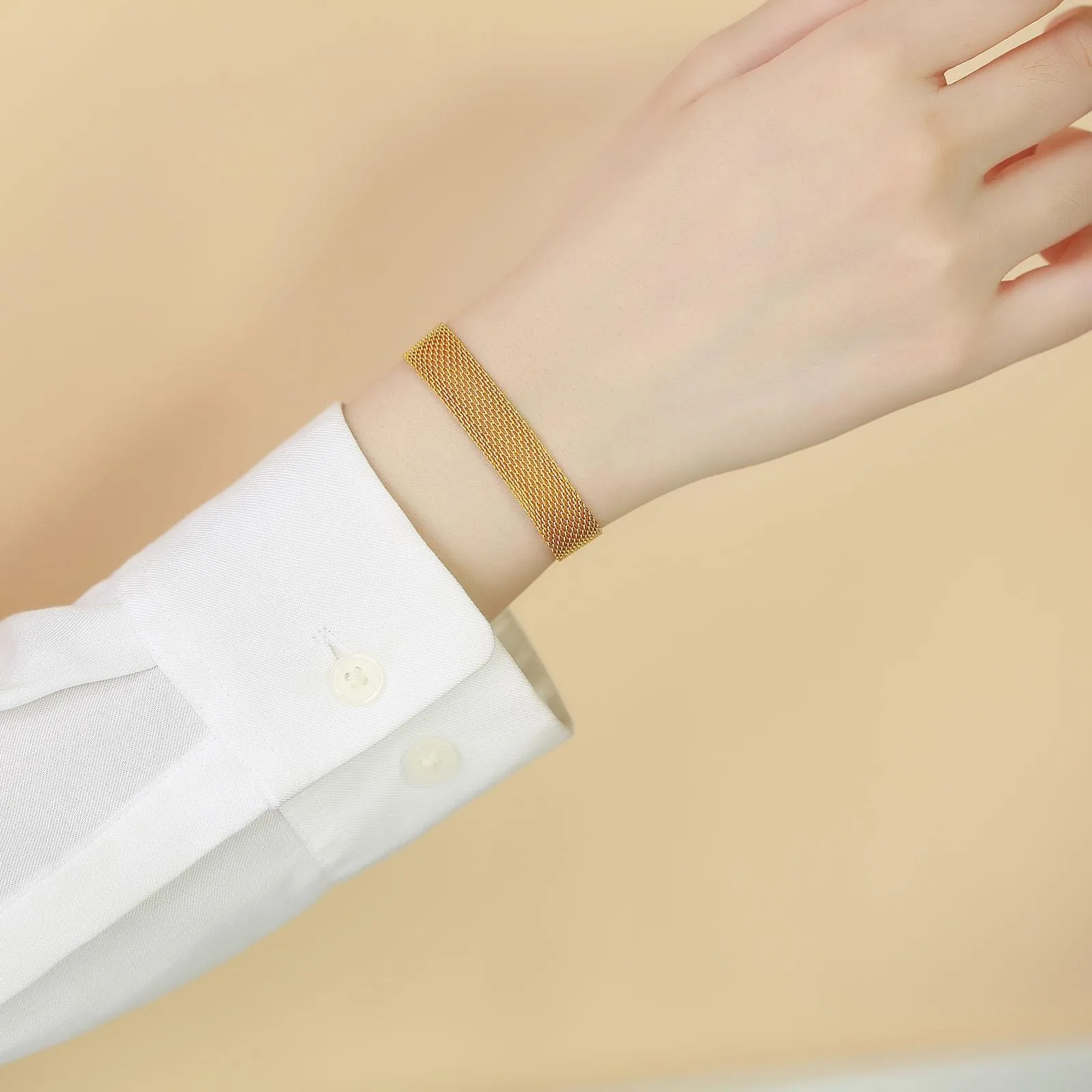10MM Width 18K Gold Plated Waterproof Braided Net Shape Mesh Women's Stainless Steel Fashion Chain & Link Bracelet