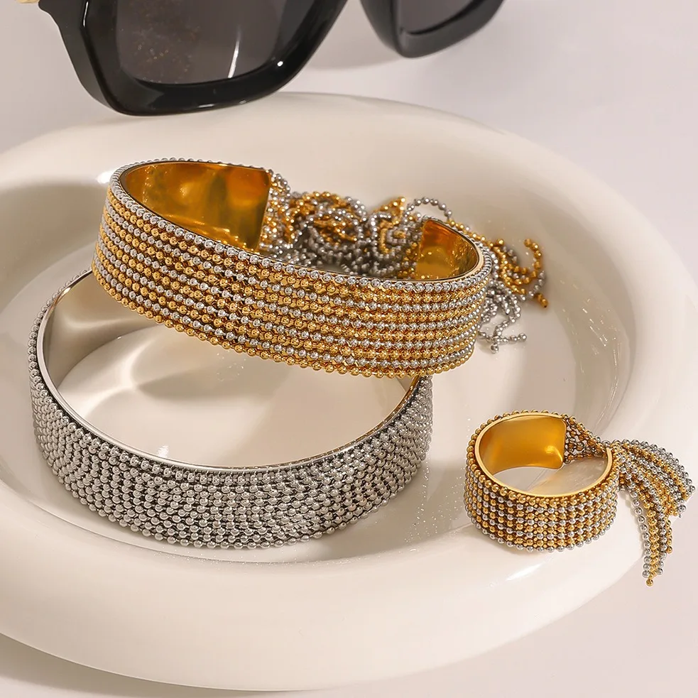 2026 Designer 18K Gold Plated Stainless Steel Two Tone Chain Tassel Bracelet Adjustable Ring Set Stylish Jewelry for Gift
