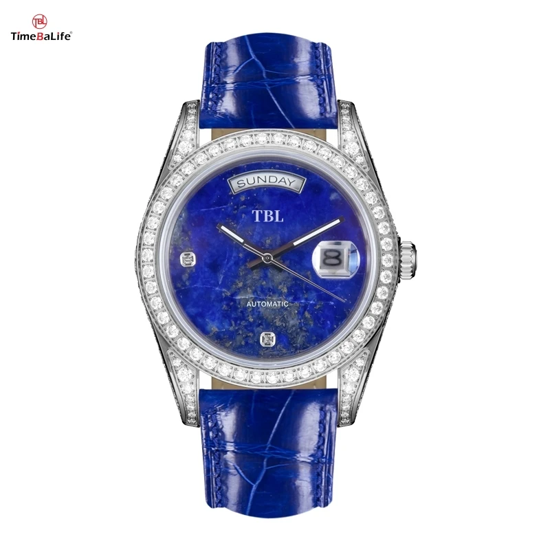 OEM Custom Luxury Lapis Lazuli Full Diamond Automatic Mechanical Men's Watch Waterproof Butterfly Buckle Genuine Leather Strap