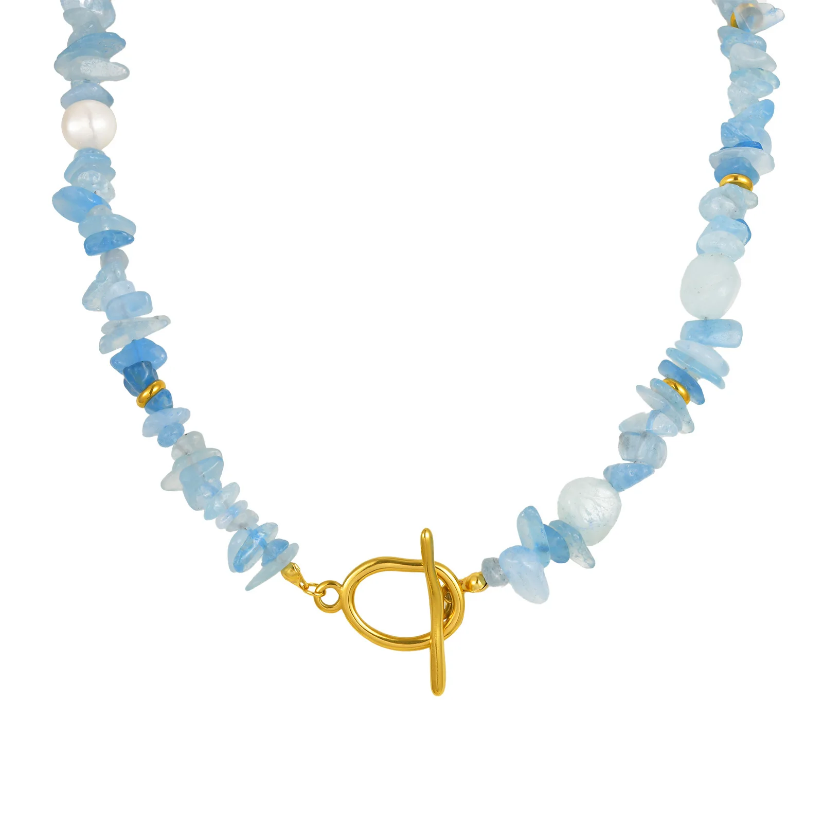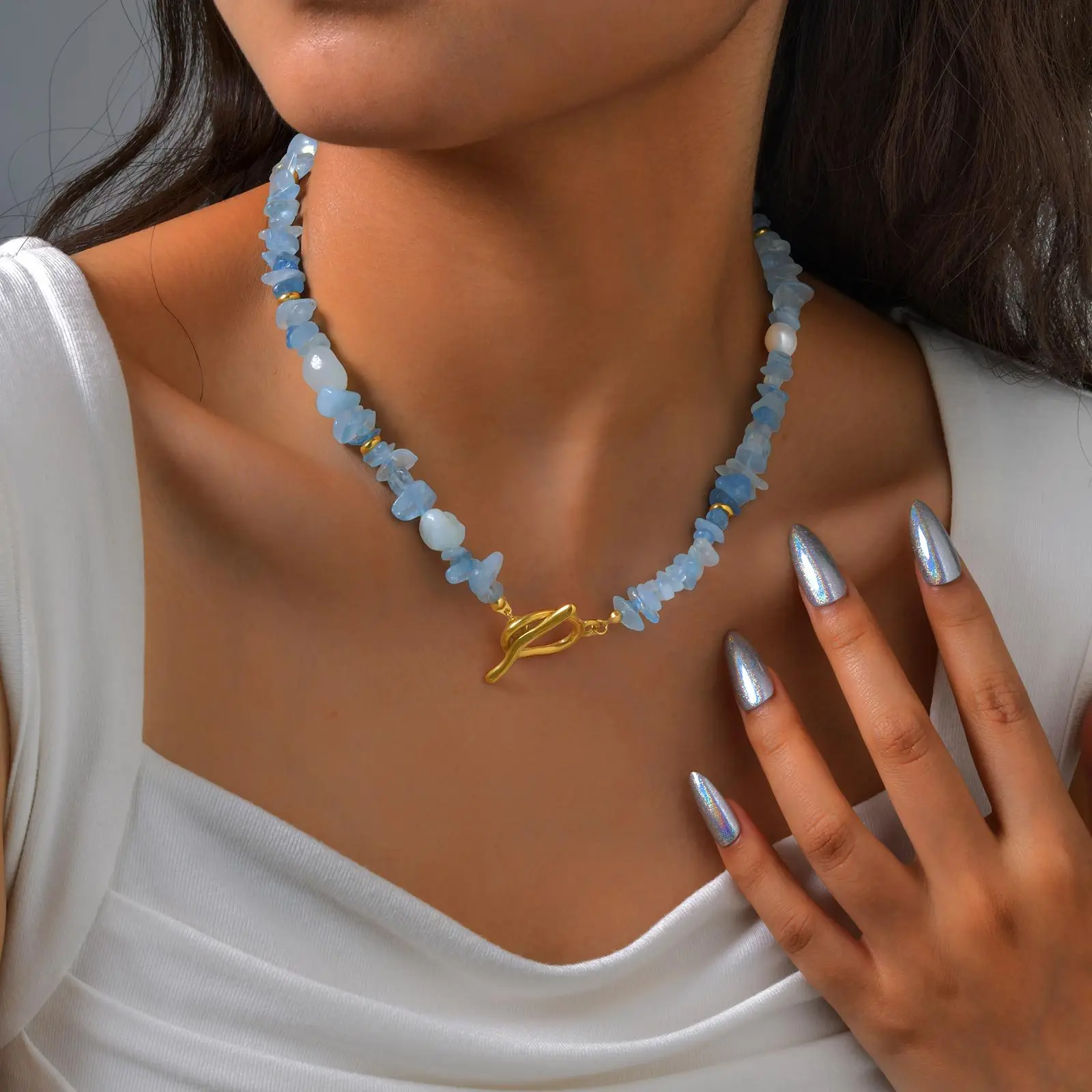 Simple Fashion Women Natural Aquamarine Gemstone Choker Necklace Stainless Steel Ot Buckle Clasp Necklace