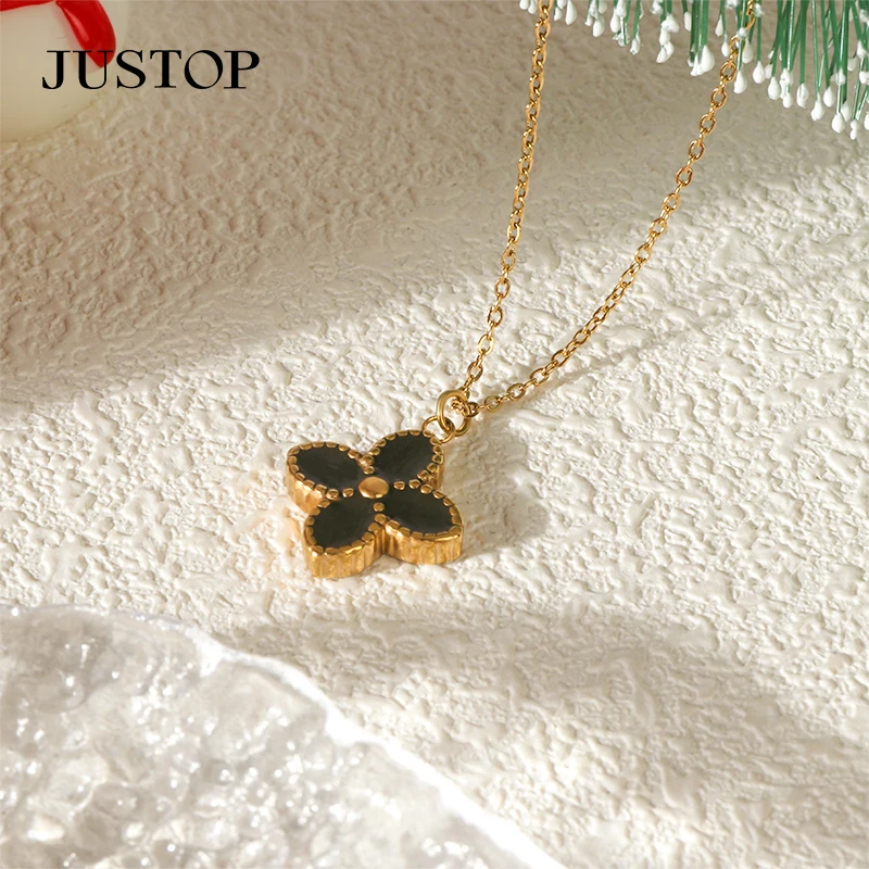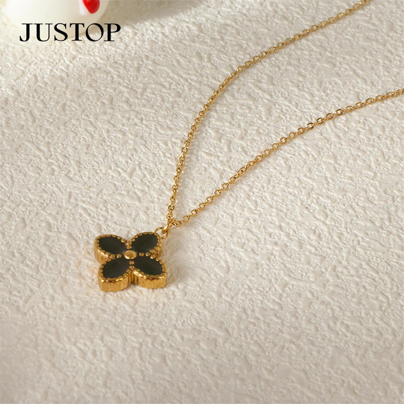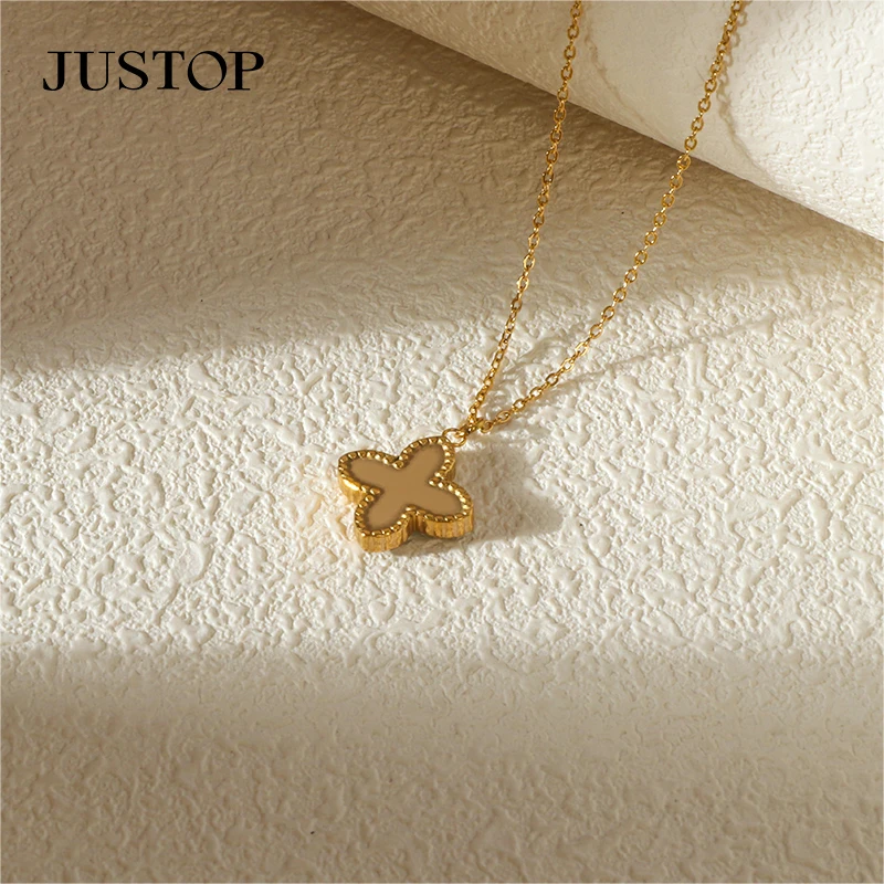 18K Real Gold Plated Vintage Style Four-Leaf Clover Necklace Stainless Steel Shell Pendant Collarbone Chain for Party Gift for