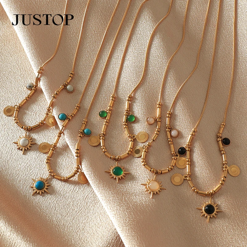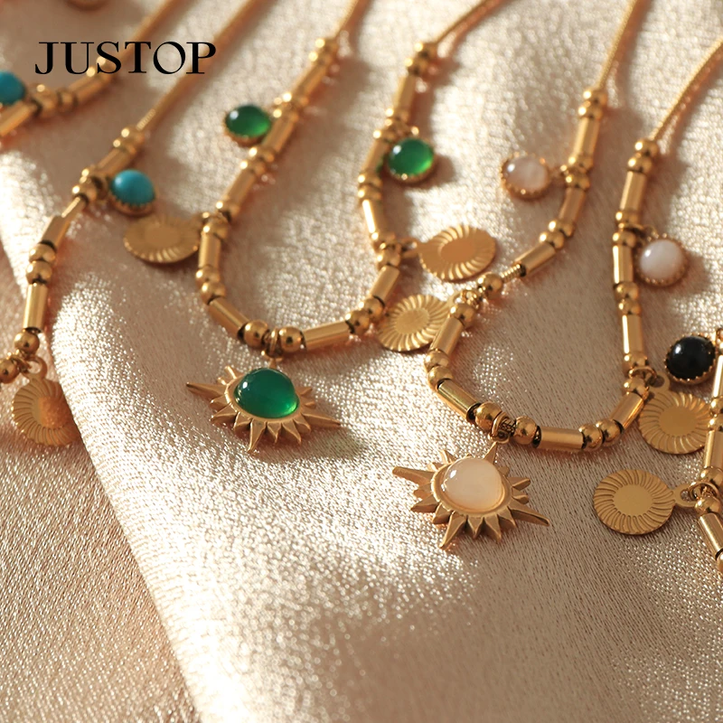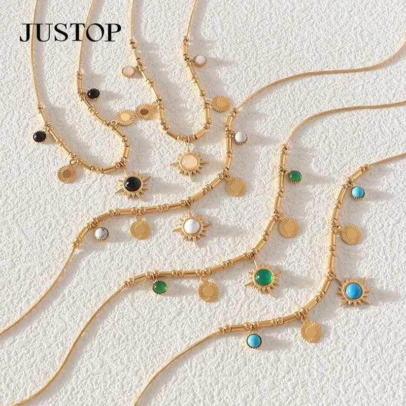 New Unisex Personality Turquoise Link Chain 18K Gold Plated Stainless Steel Pendant Necklace with Retro Charms