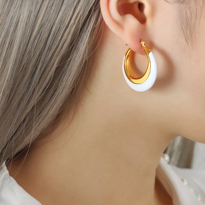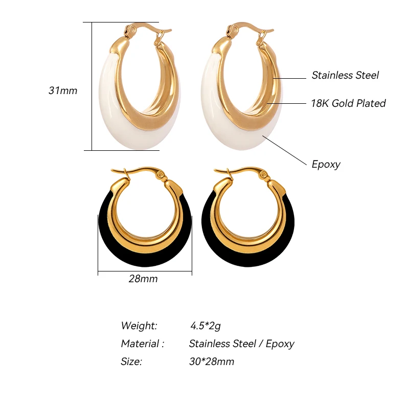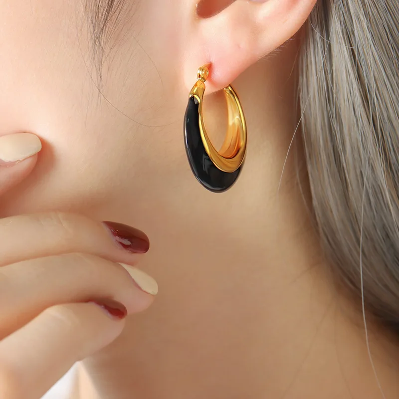 18K Gold Plated Polish Chunky Hoop Earrings Waterproof Stainless Steel Black and White Enamel Moon Shape for Women Gift
