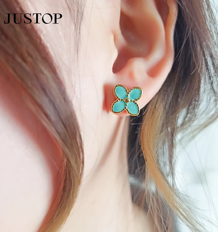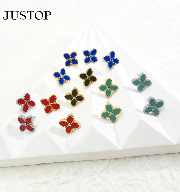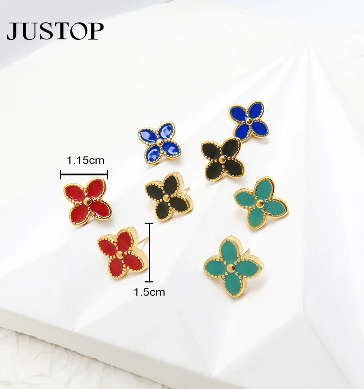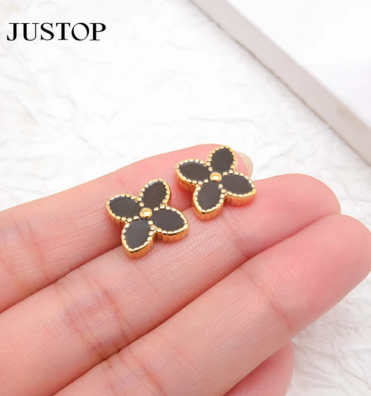 Luxury 18K PVD Gold Plated Enamel Four Leaf Clover Stud Earrings Black Red Stainless Steel Jewelry for Women