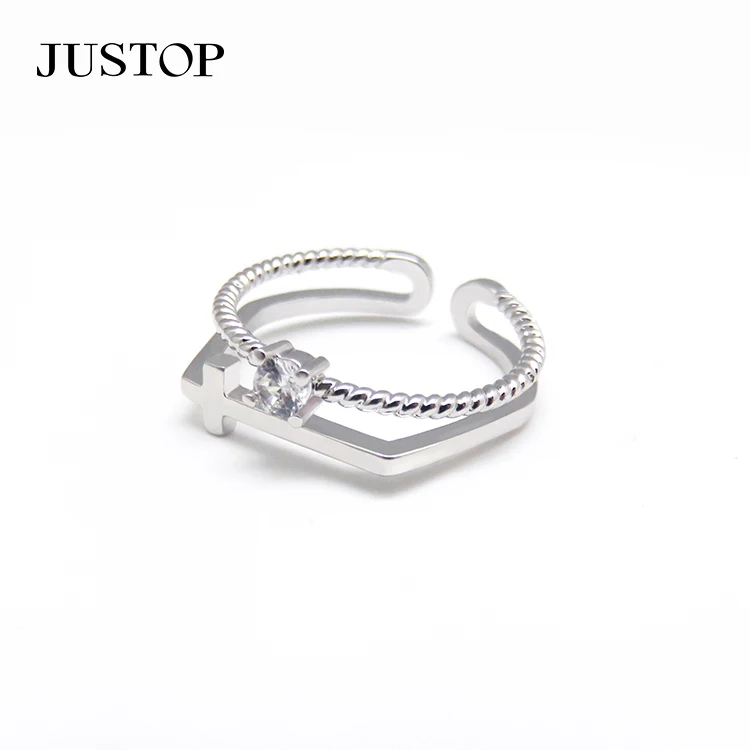 Adjustable Size Brass & Copper Open Cuff Ring with Zircon Cross Charm Double Layer Fashion Jewelry for Modern Style Gift