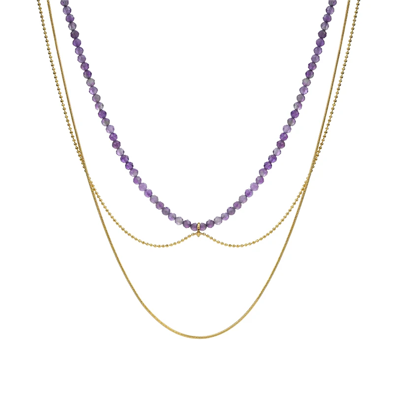 Wholesale Fashion Jewelry Necklace Birthday Gift Real 18K Gold Plated Waterproof IP PVD Women's Vintage Ball Beaded Amethyst