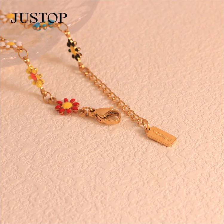 New Design Ins Popular Stainless Steel Flower Shape Chain Light Oil Dripping Enamel Flower Charm Bracelet Clavicle Chain