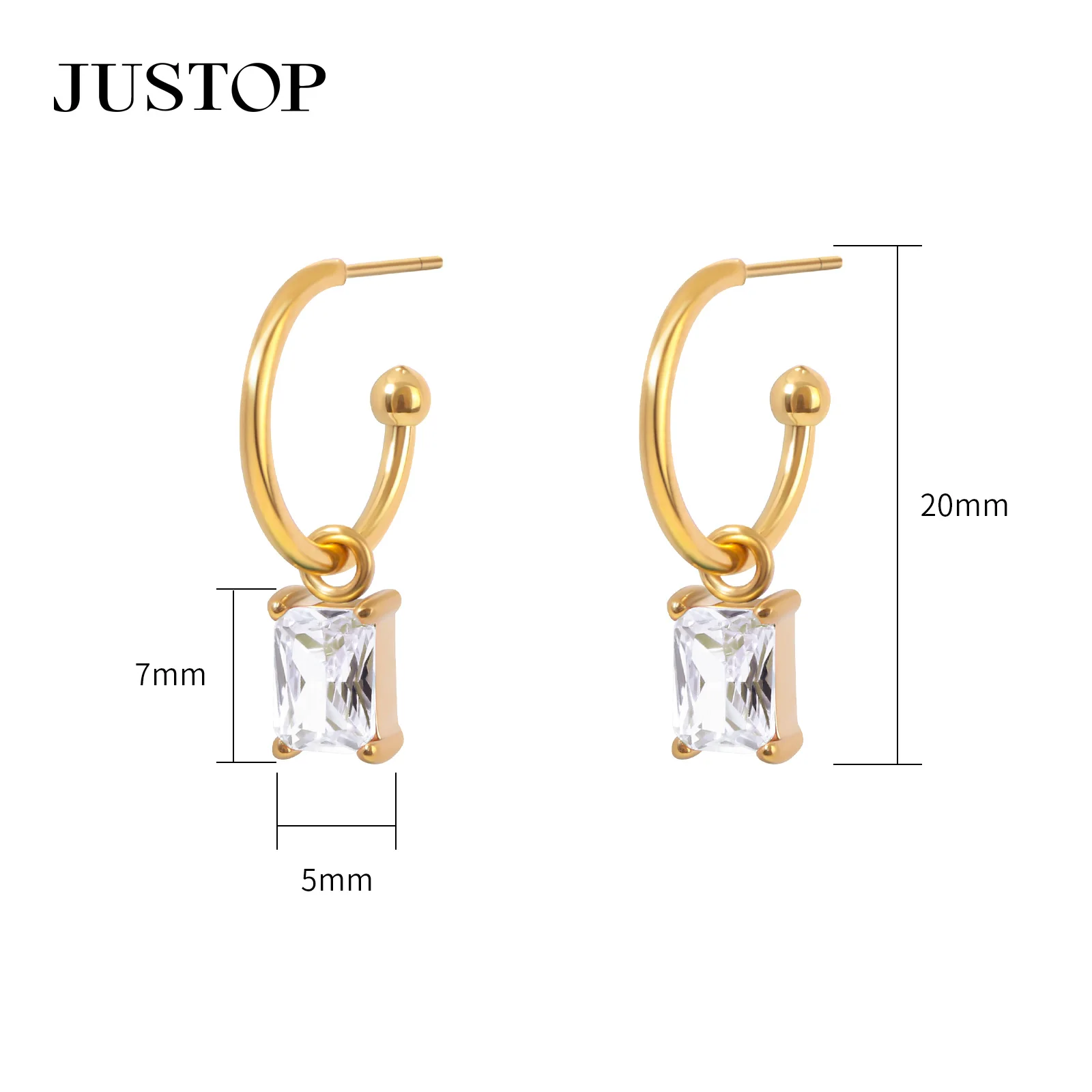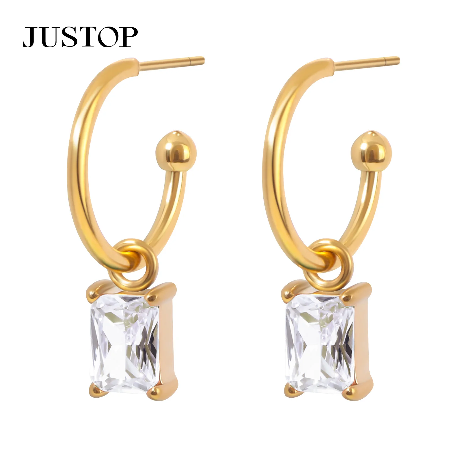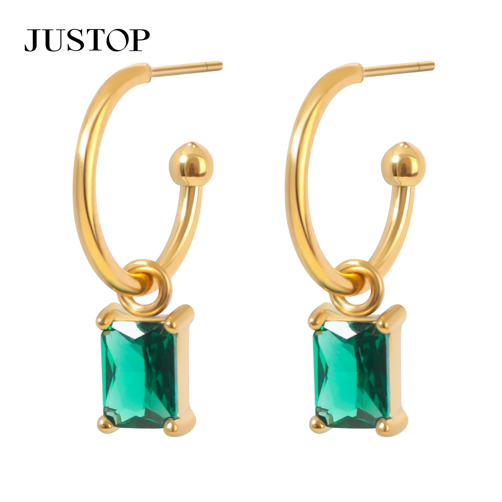 Luxury Retro 18K Gold Plated Stainless Steel Drop Earrings for Women Green Zircon Studded Square Pendant