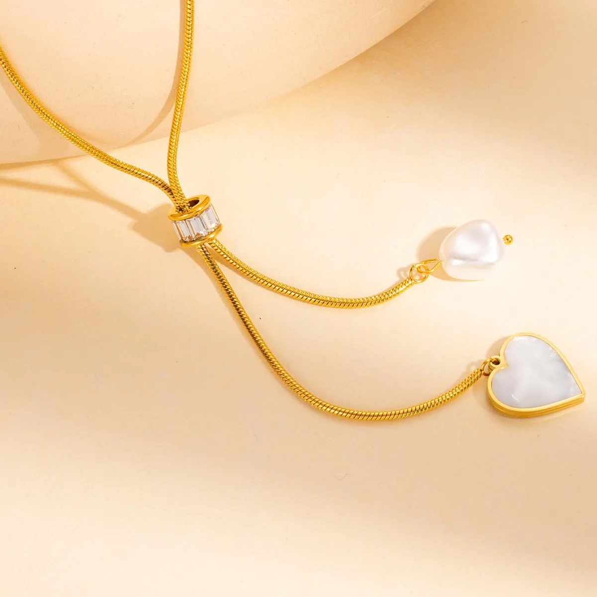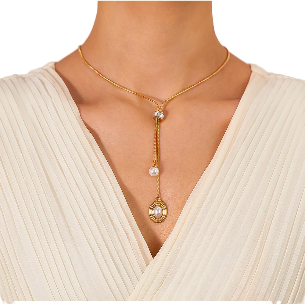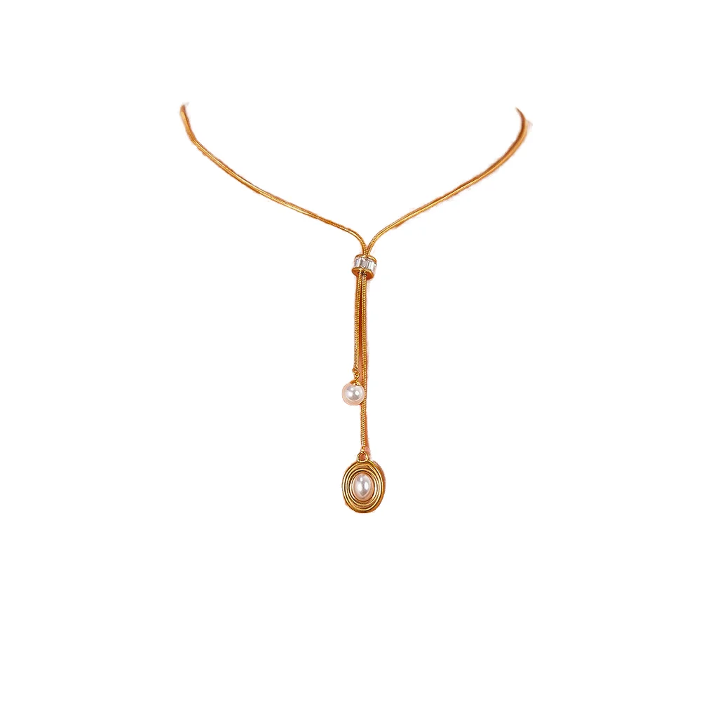 MW Latest Models Women 18K Gold Plated Adjustable Zircon Fashion Stainless Steel Oval Pearl Pendant Necklace for Women