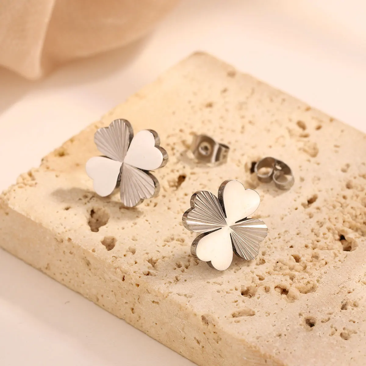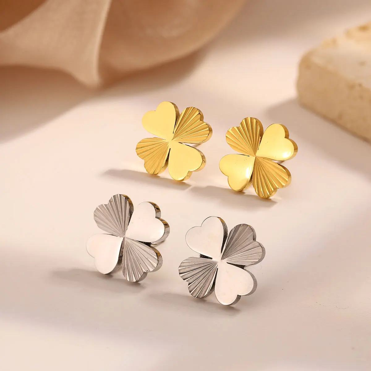 MW Fashion Personality Women's Stainless Steel Stud Earrings with Half Clover and Love Design Subtle Half Laser Earrings