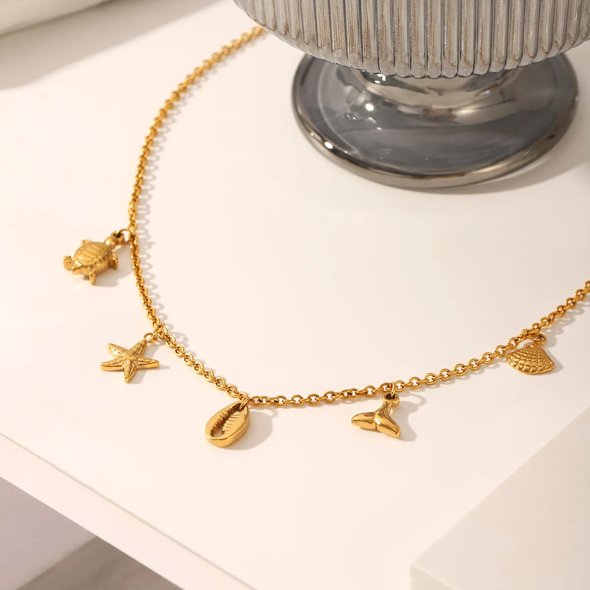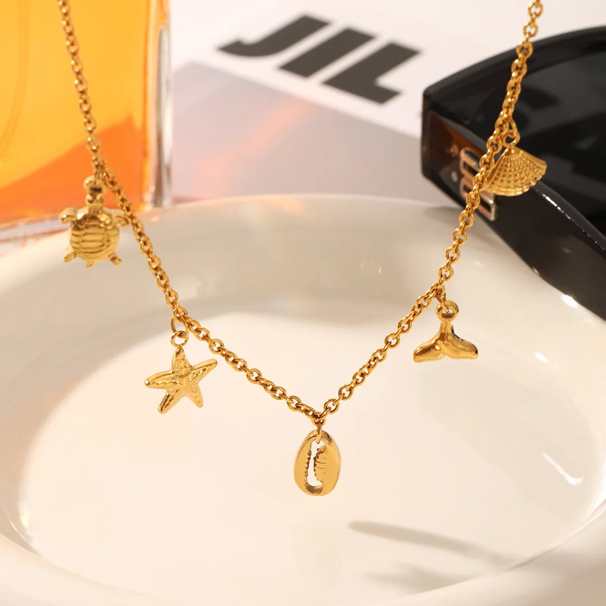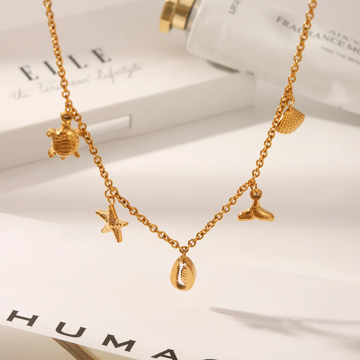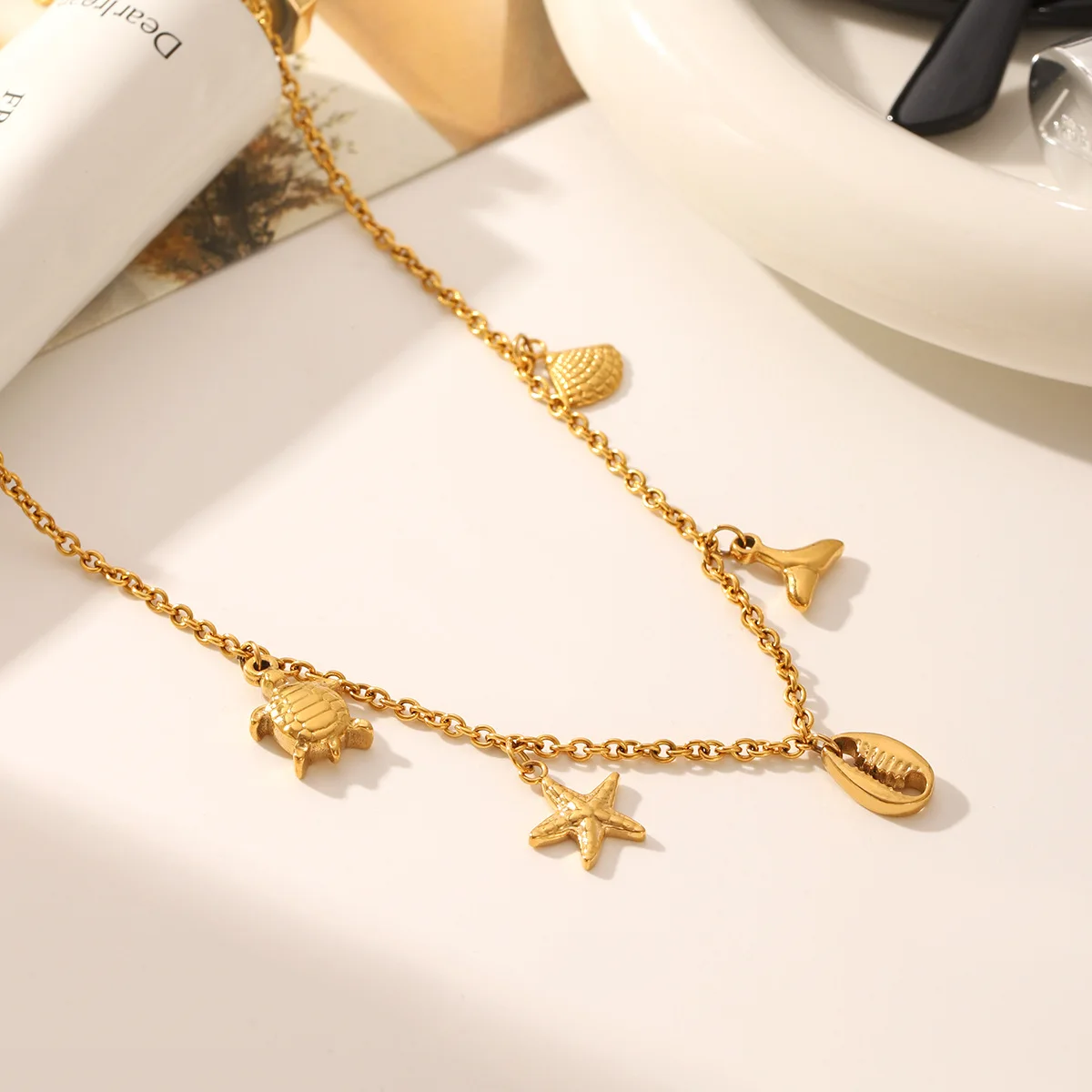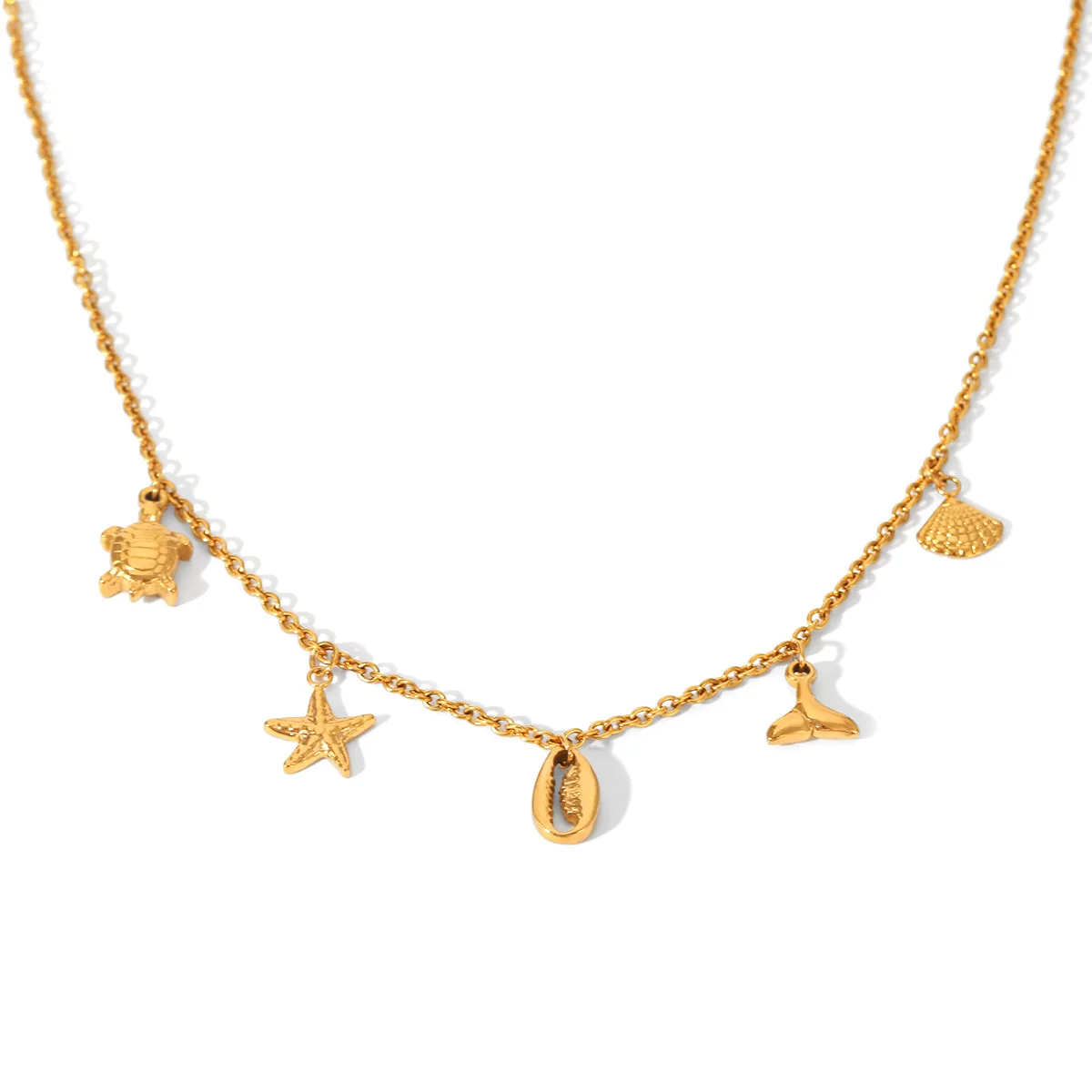 MW Bohemian 18K Gold Plated Stainless Steel Starfish Sea Turtle Shell Tassel Stackable Link Chain Pendant Necklace