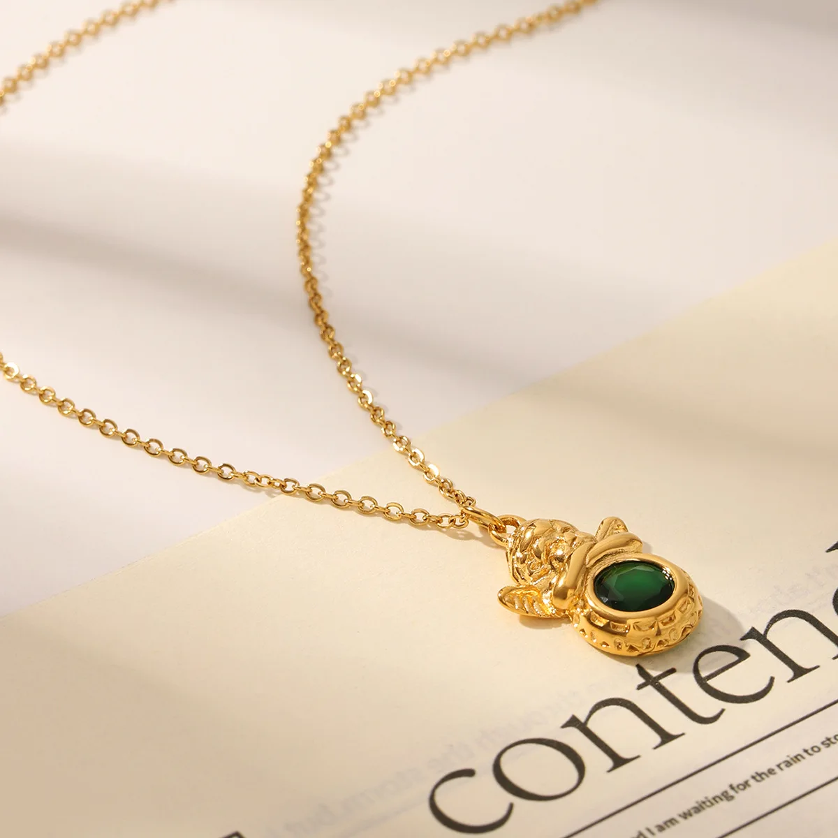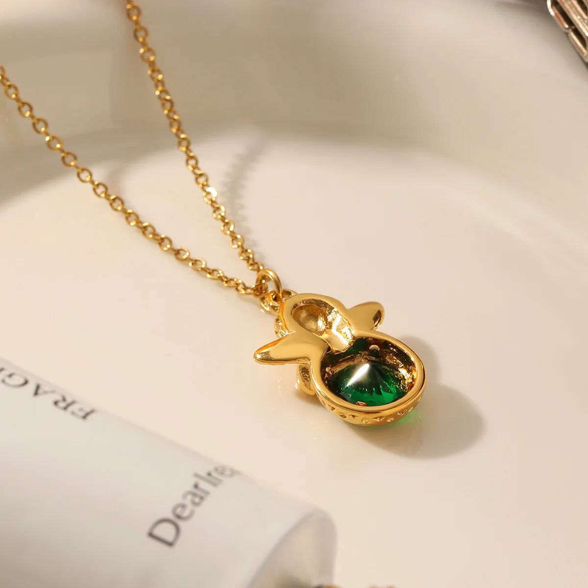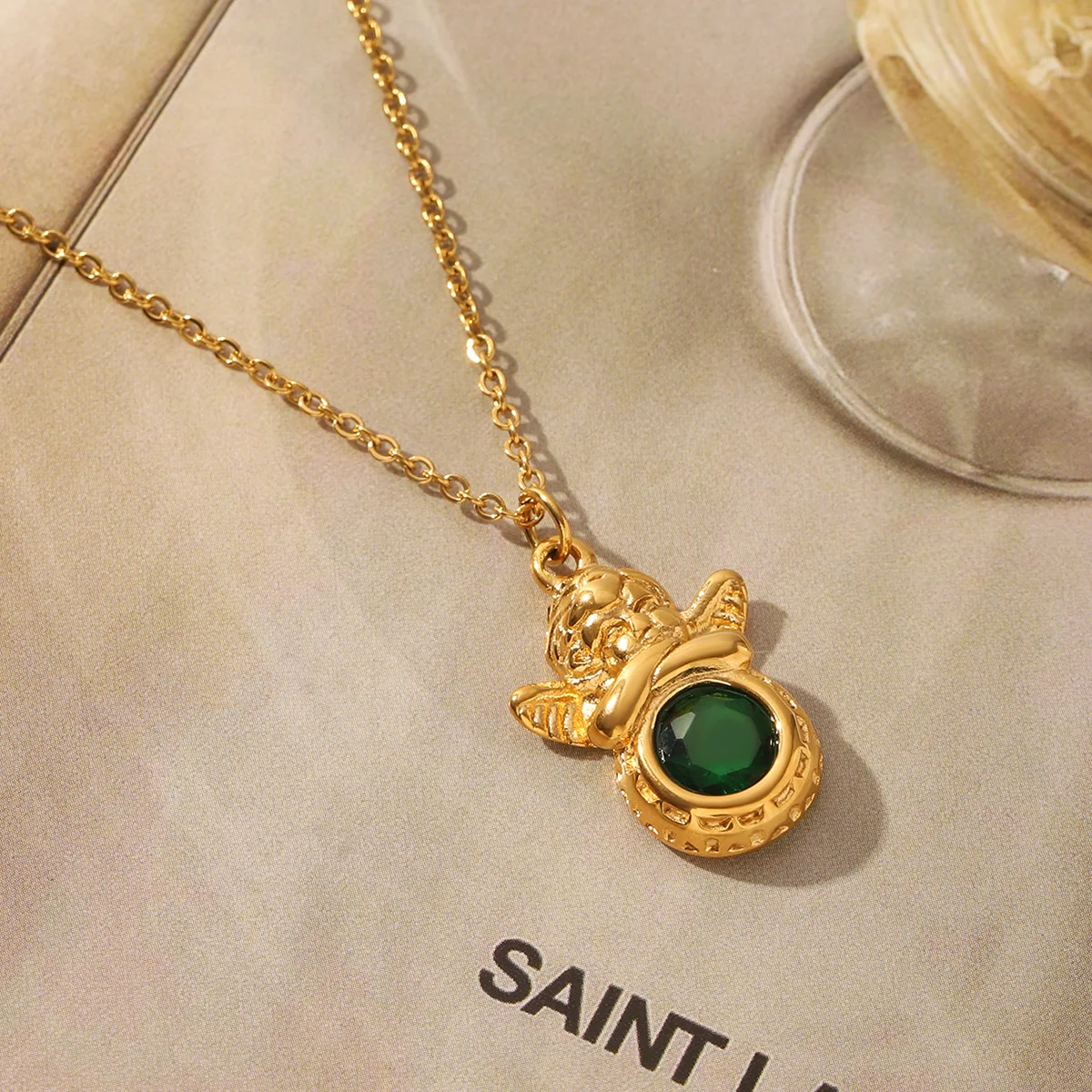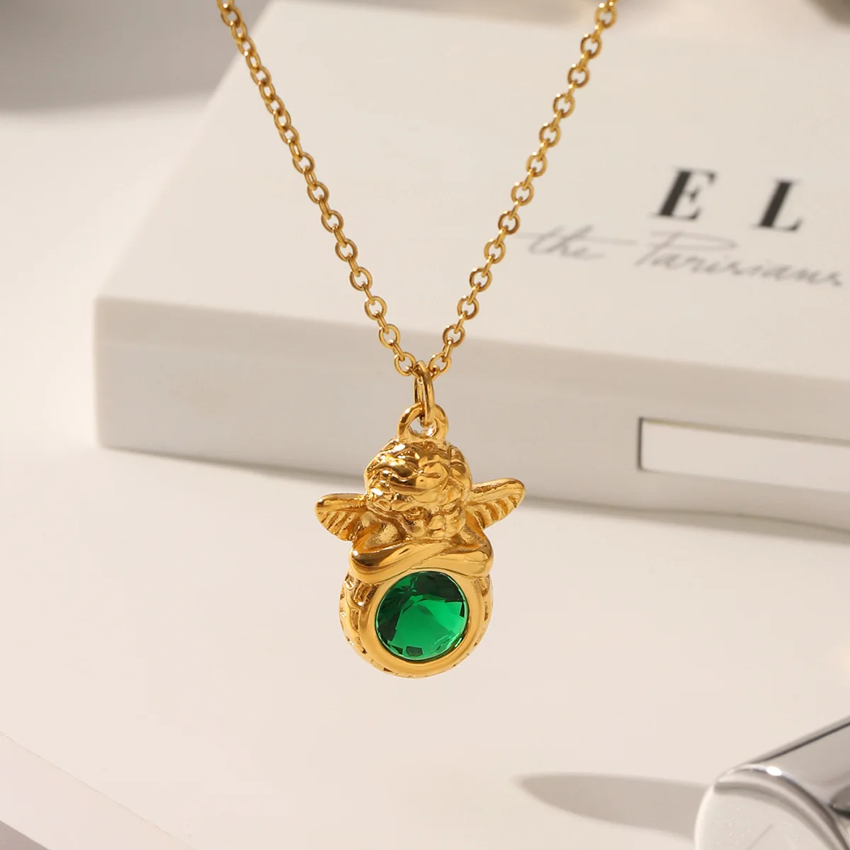 MW Retro European and American Popular Cute Angel Necklace Green Zircon Gold-plated Stainless Steel Waterproof Necklace
