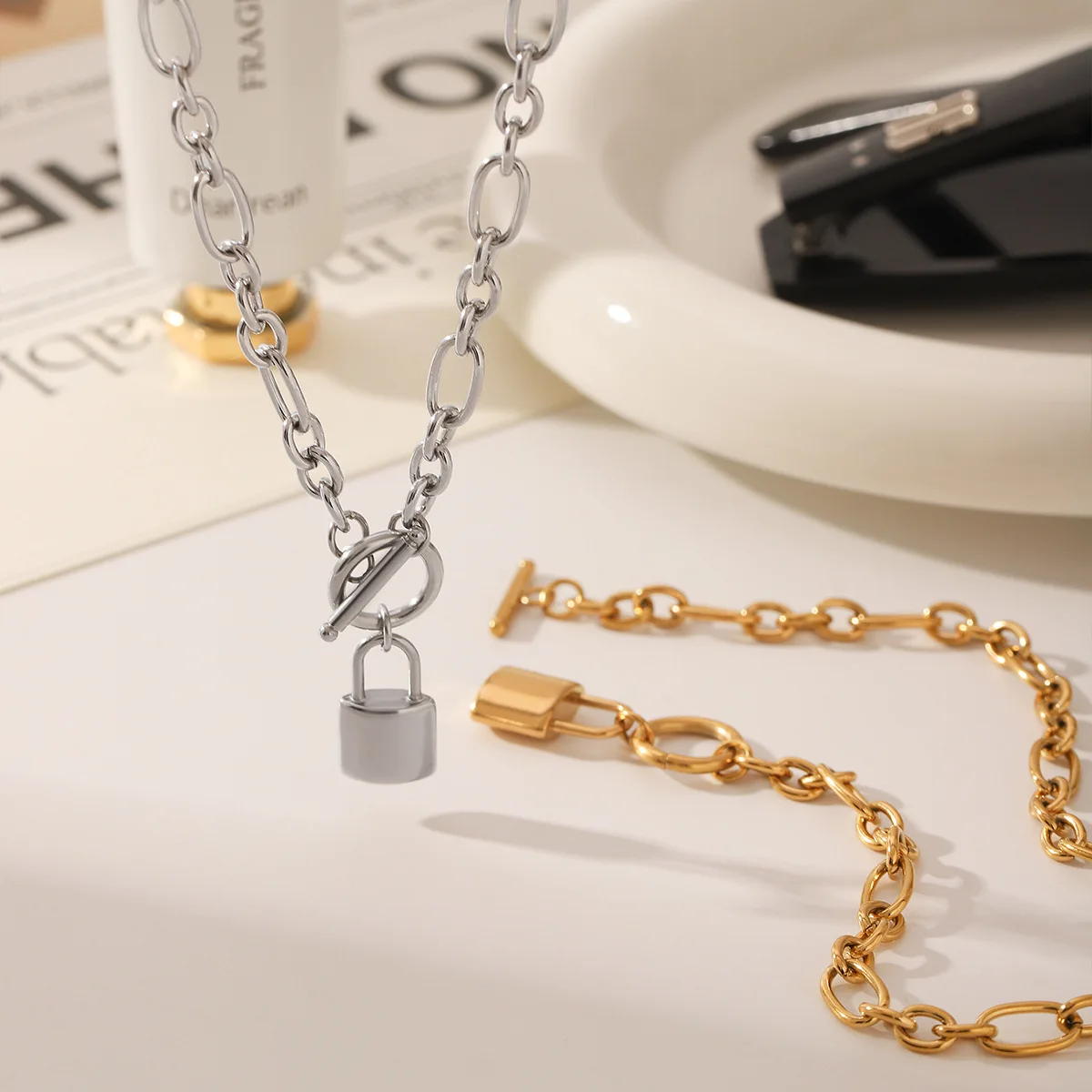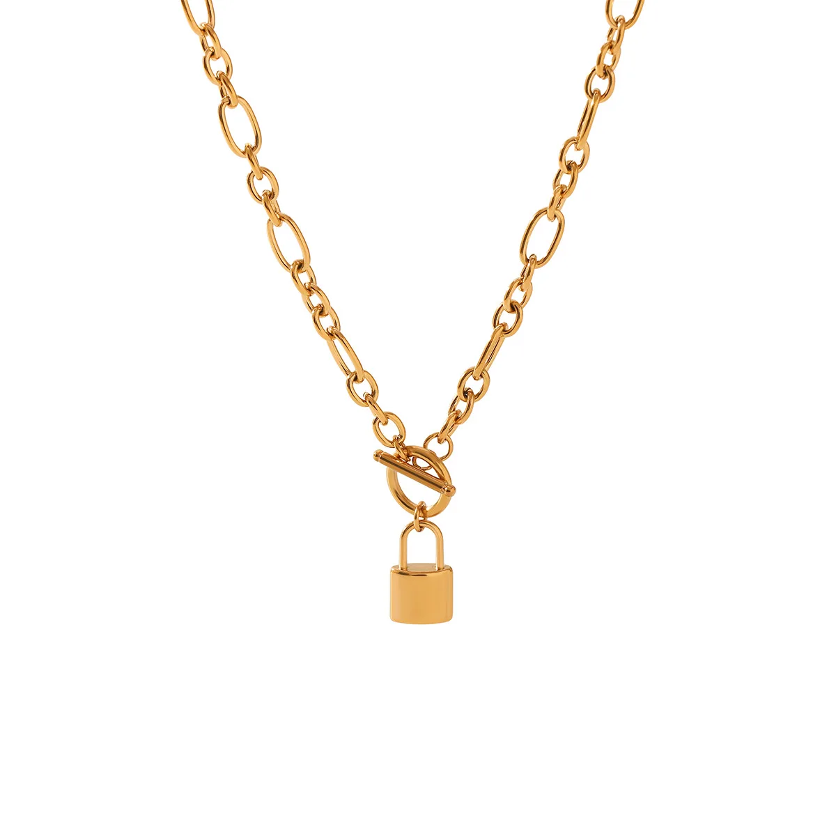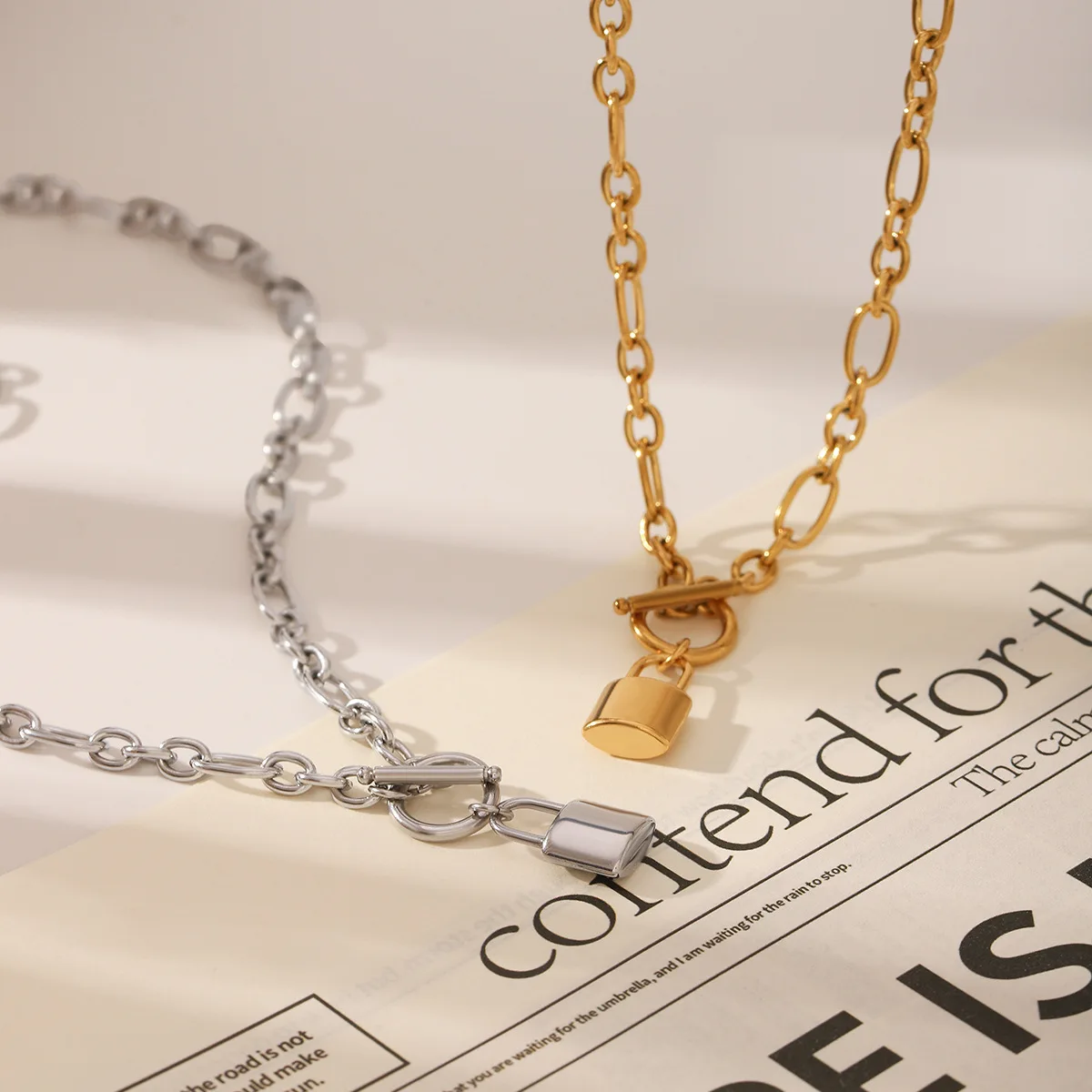 MW Design 18k Gold Plated Lock Pendant Necklaces for Women Waterproof Stainless Steel Layer Paper Clip Hip Hop Necklace