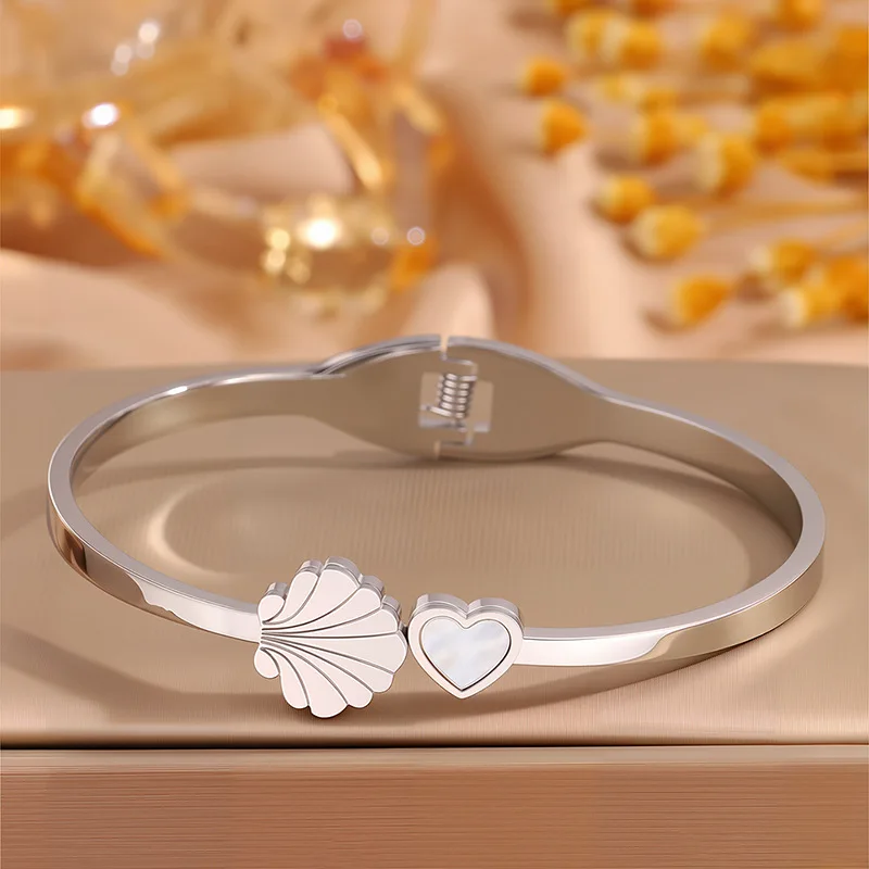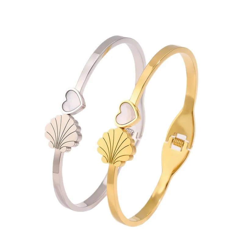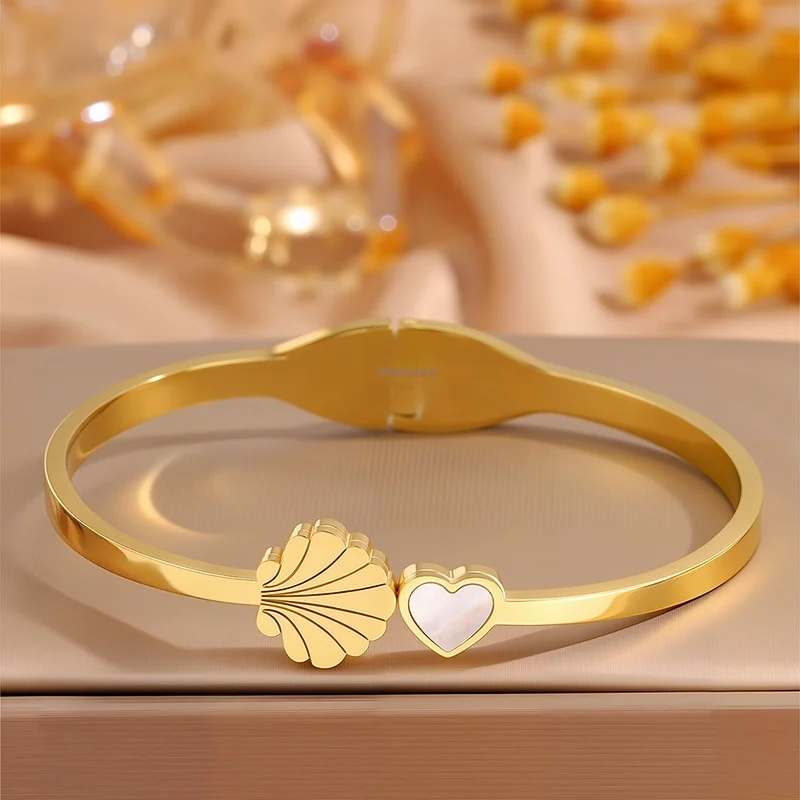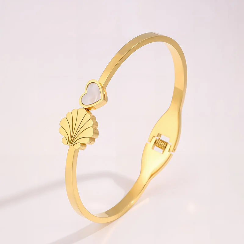 MW Wholesale High Polished 18K Gold Stainless Steel Bangle Heart and Conch Shape Pattern Waterproof Openable Bangle for Women
