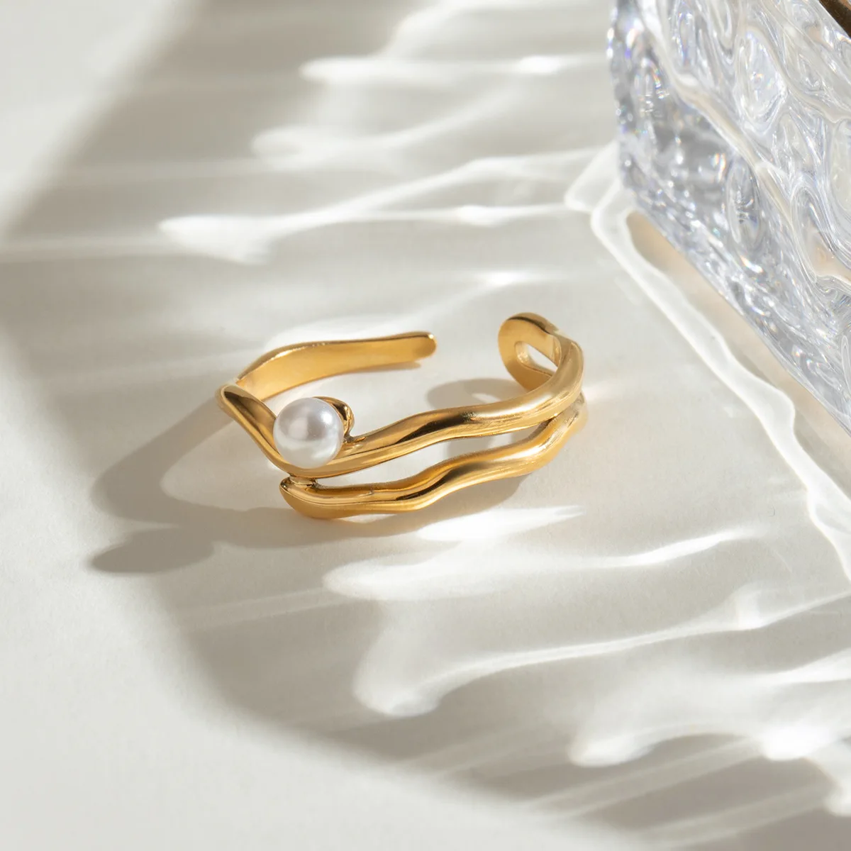 MW Women's Stylish and Dainty 18K Gold-Plated Stainless Steel Pearl Open Ring - Waterproof & Adjustable Jewelry