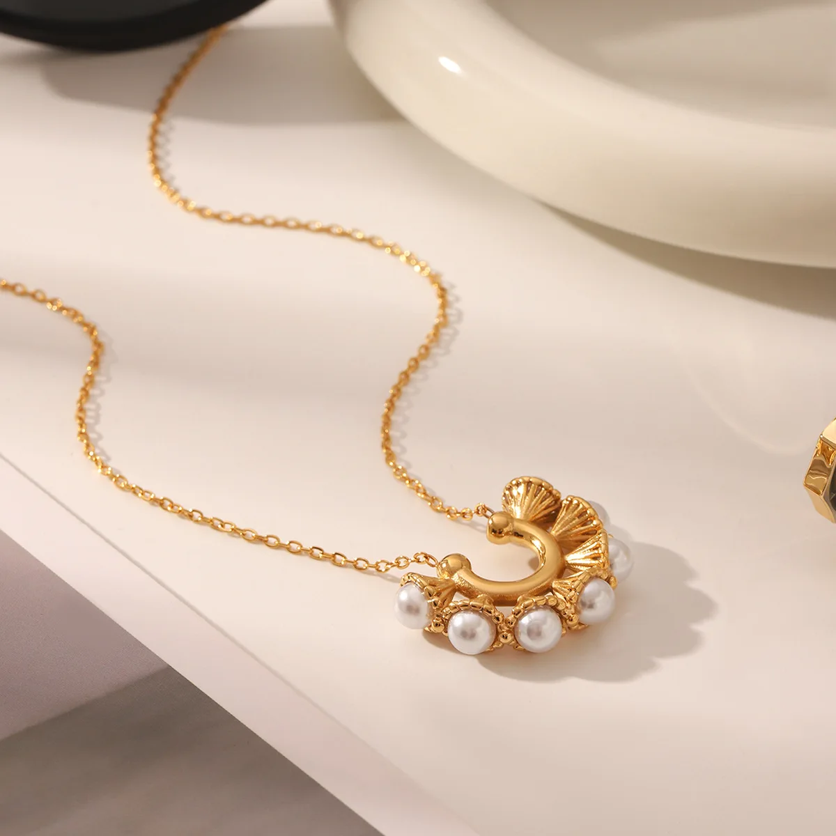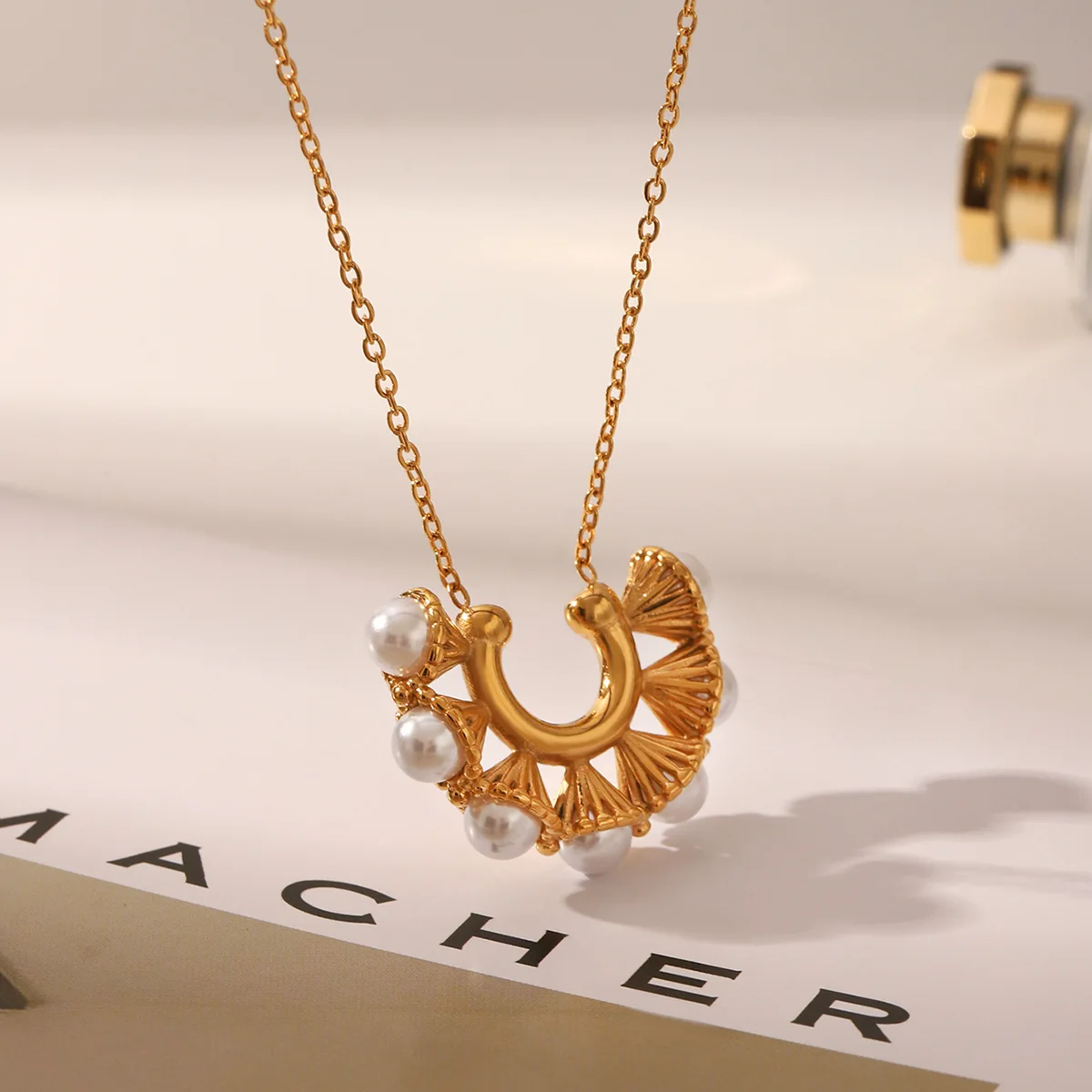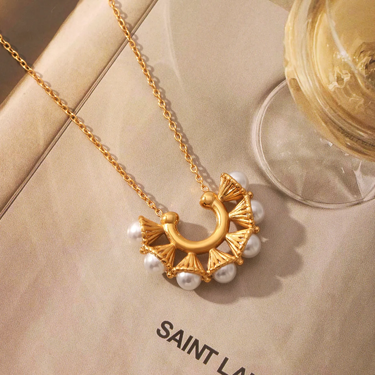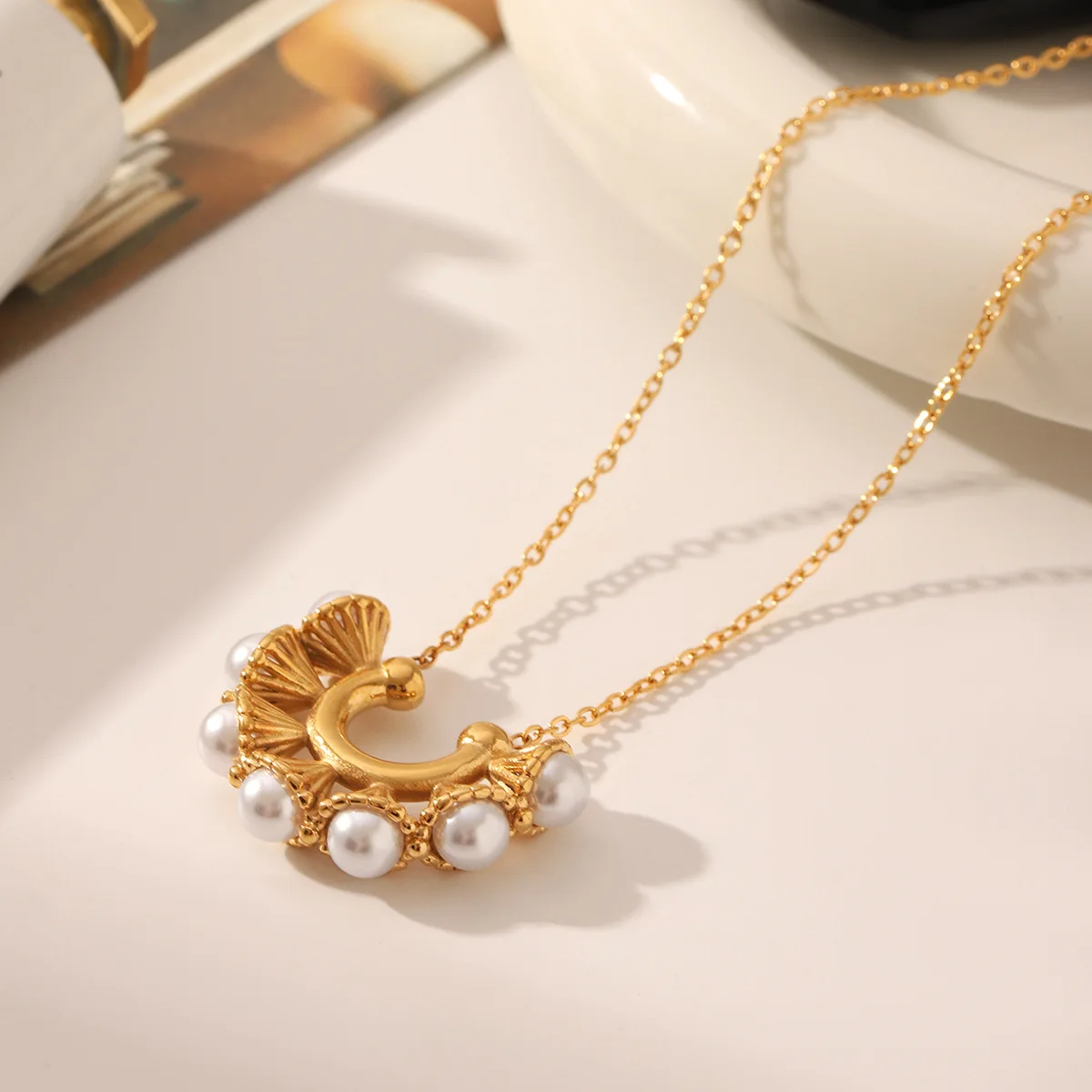 MW New Vintage U-Shaped Stainless Steel Petunia Pearl Pendant Necklace 18K Gold Plated Clavicle Chain Necklace Non Tarnish