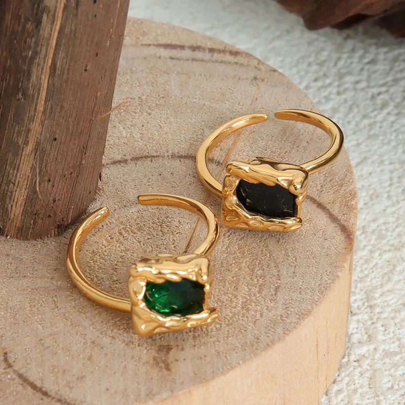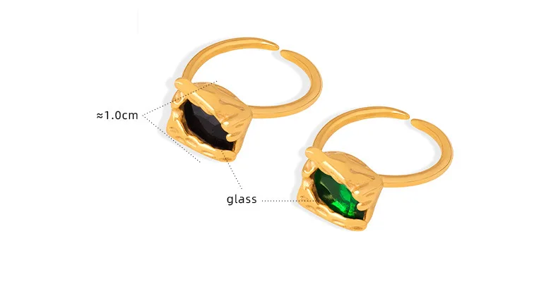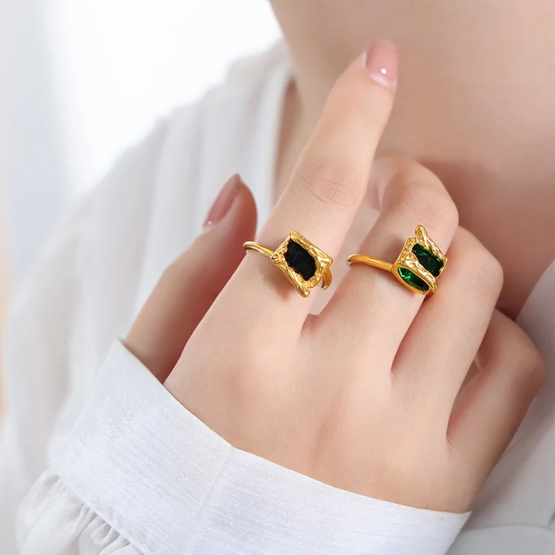MW Women's 18K Gold High-Grade Creative Waterproof Square Open Ring Cubic Zircon Black Green Trendy Stainless Steel Jewelry