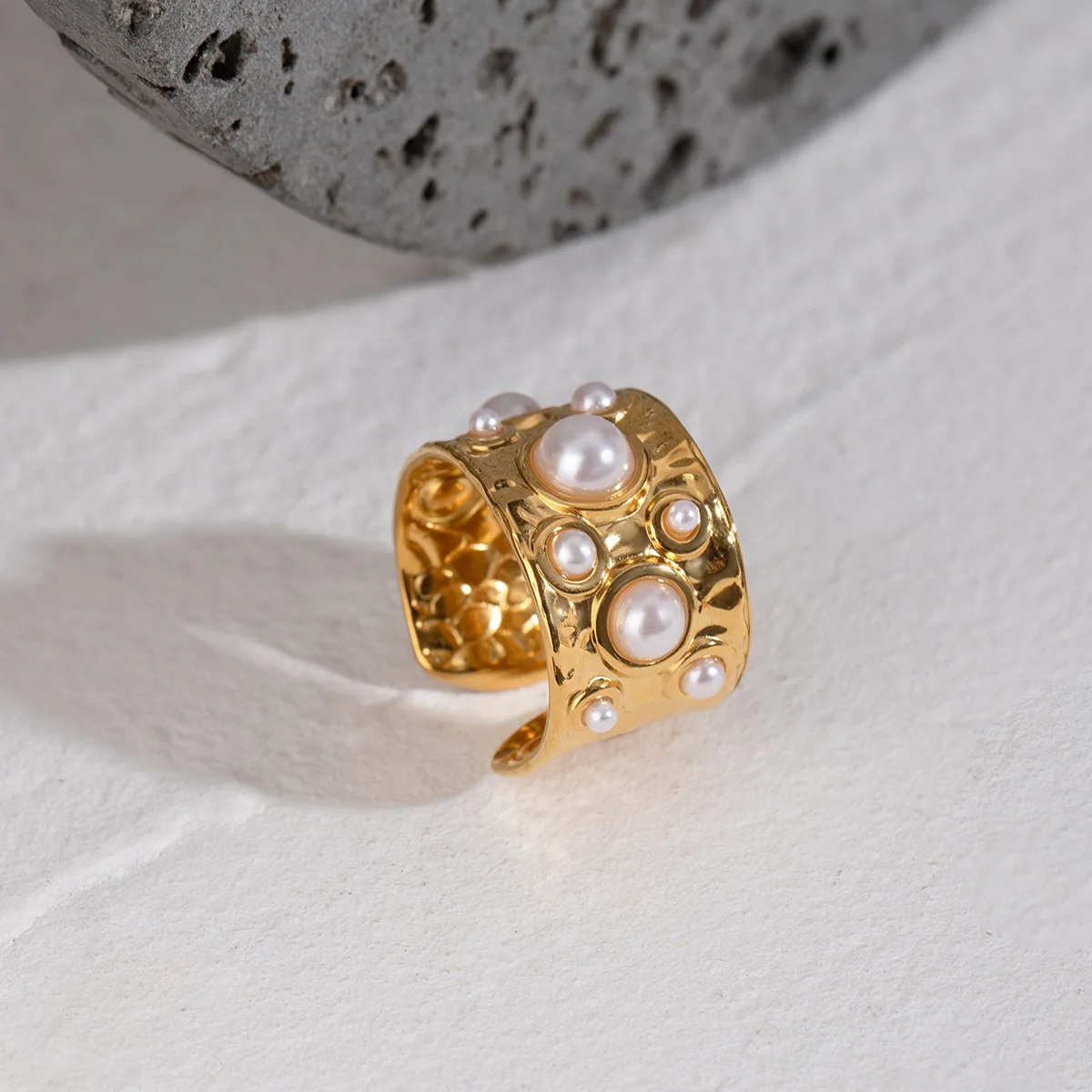 MW Women's Stylish 18K Gold-Plated Stainless Steel Ring - Wide Band with Hammered Texture, Pearl Inlay, Open Adjustable Jewelry