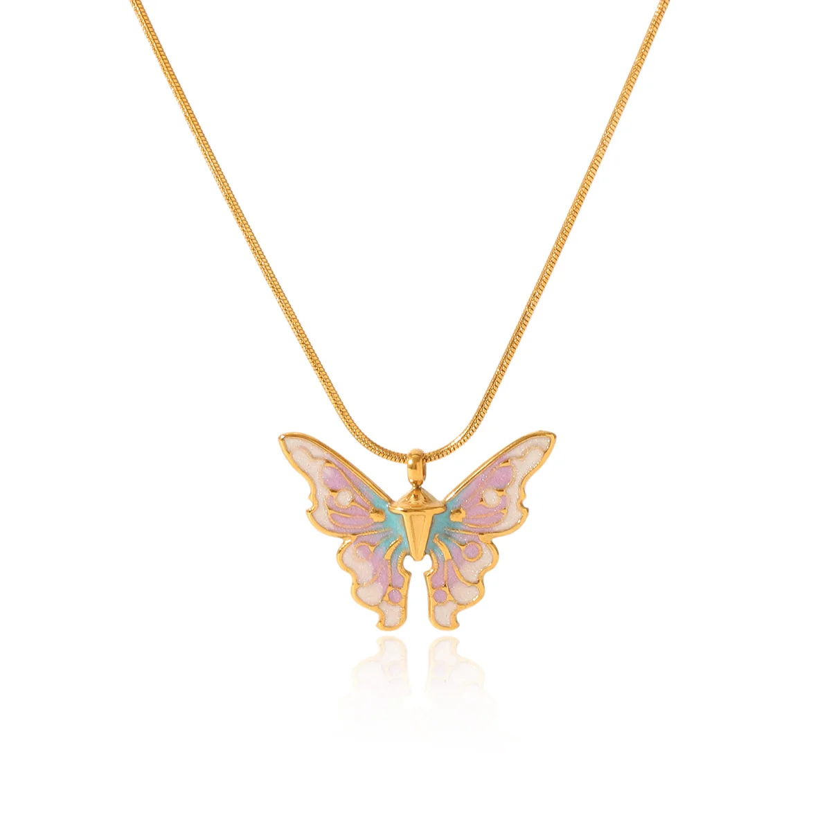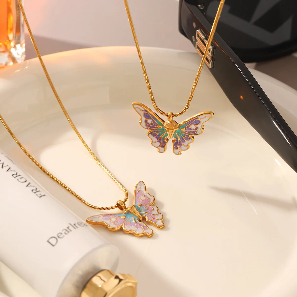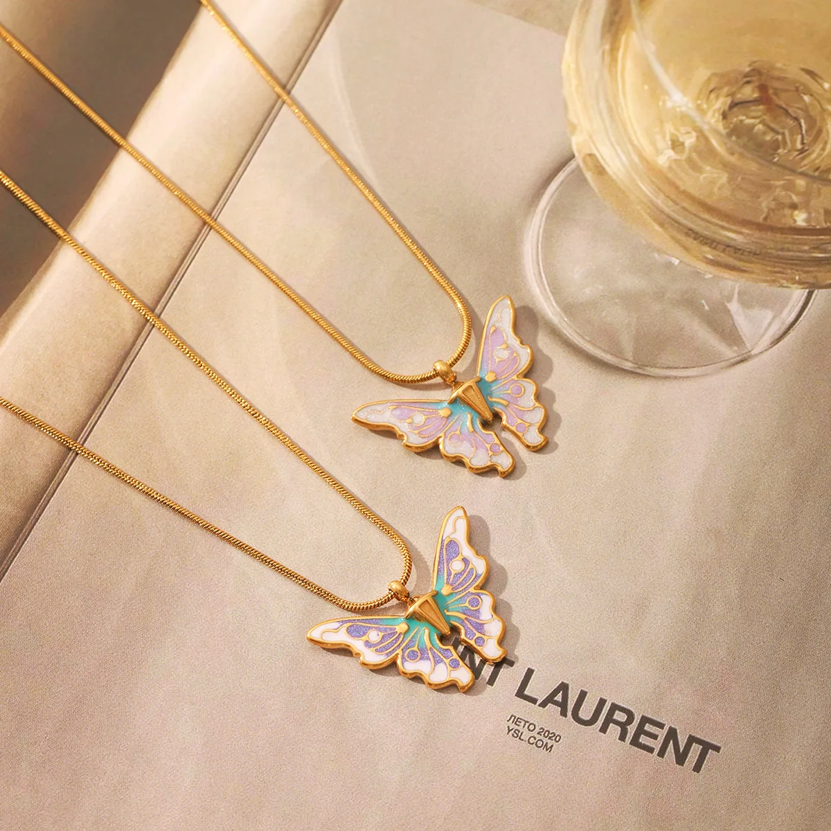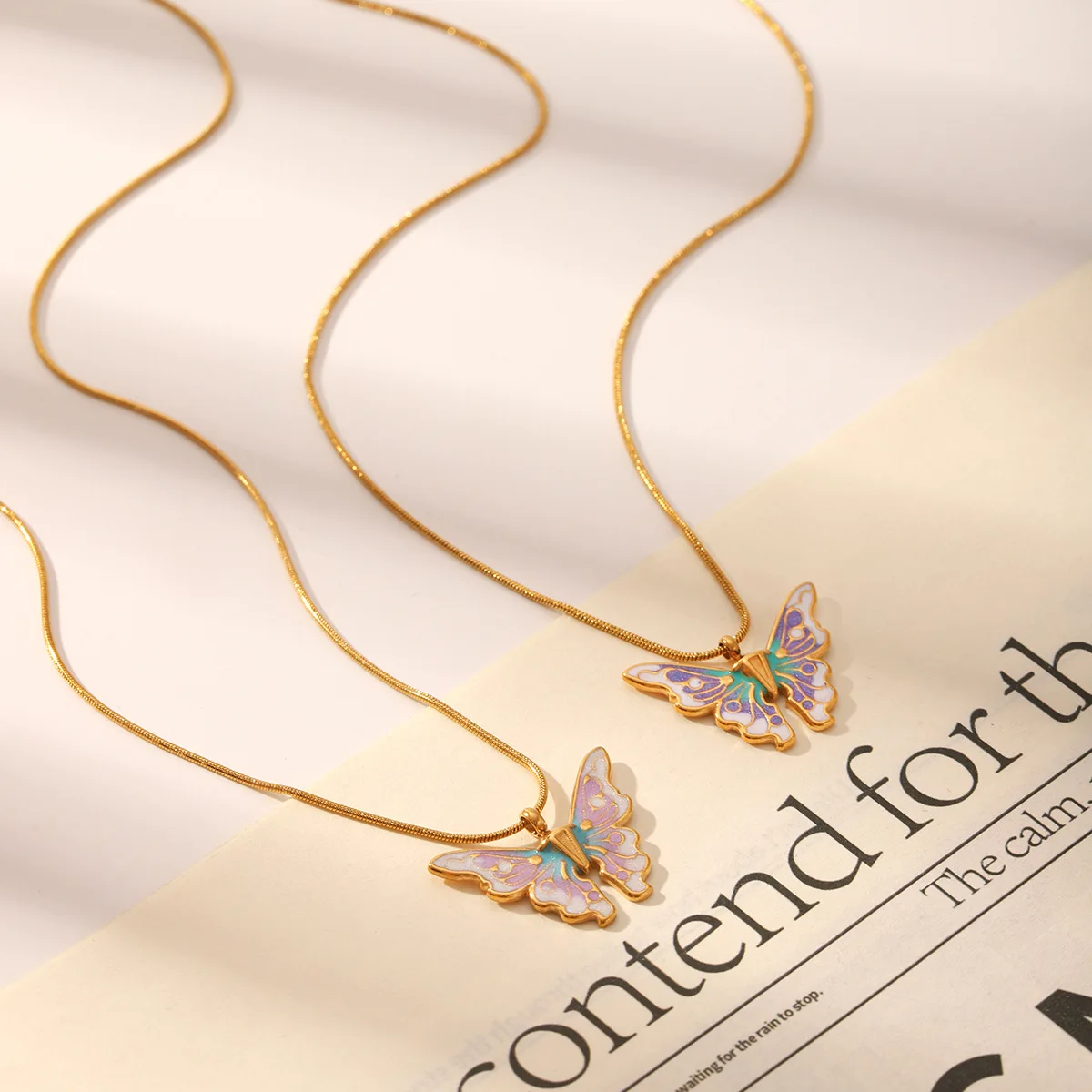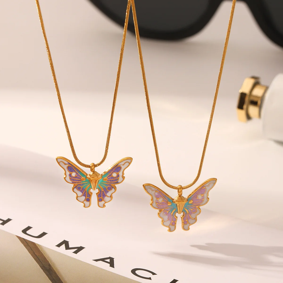 MW Personalized Christian Cute New Style 18K Gold Plated Retro Colorful Oil Drip Butterfly Stainless Steel Pendant Necklace for