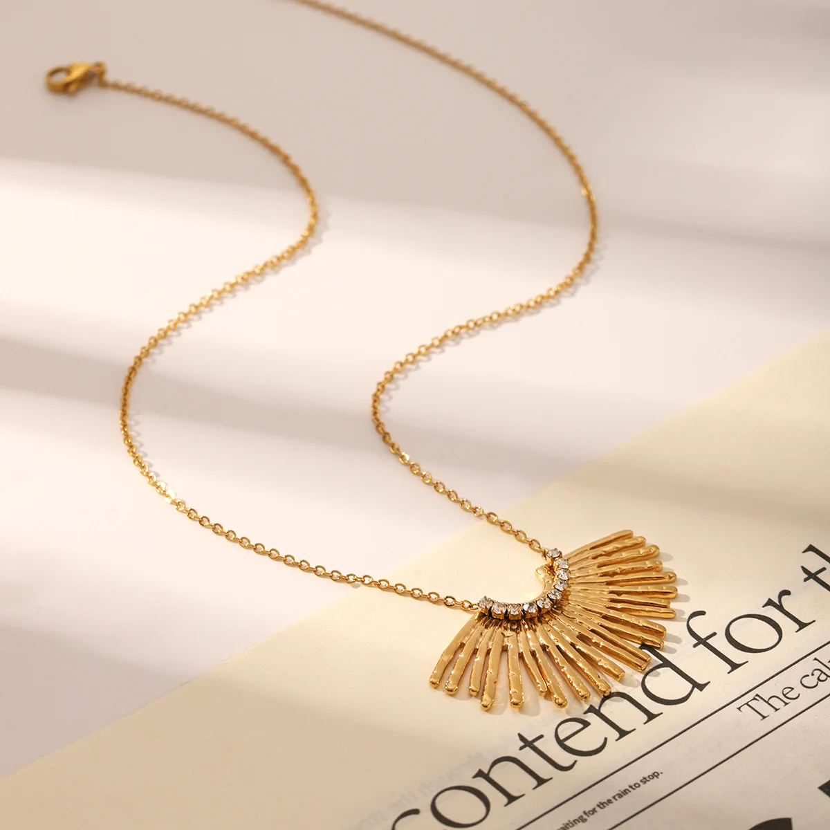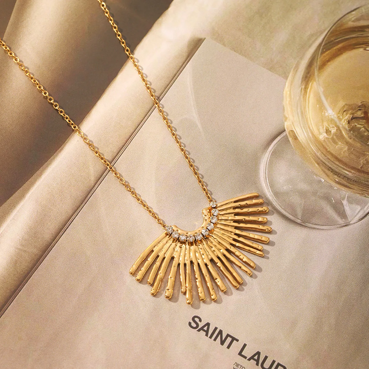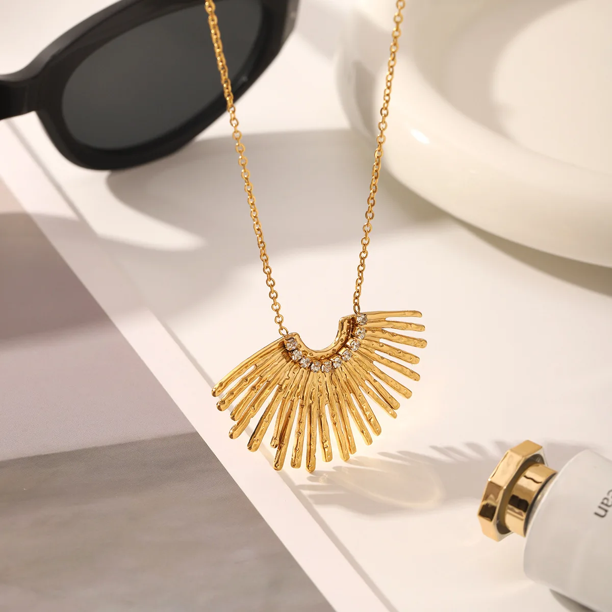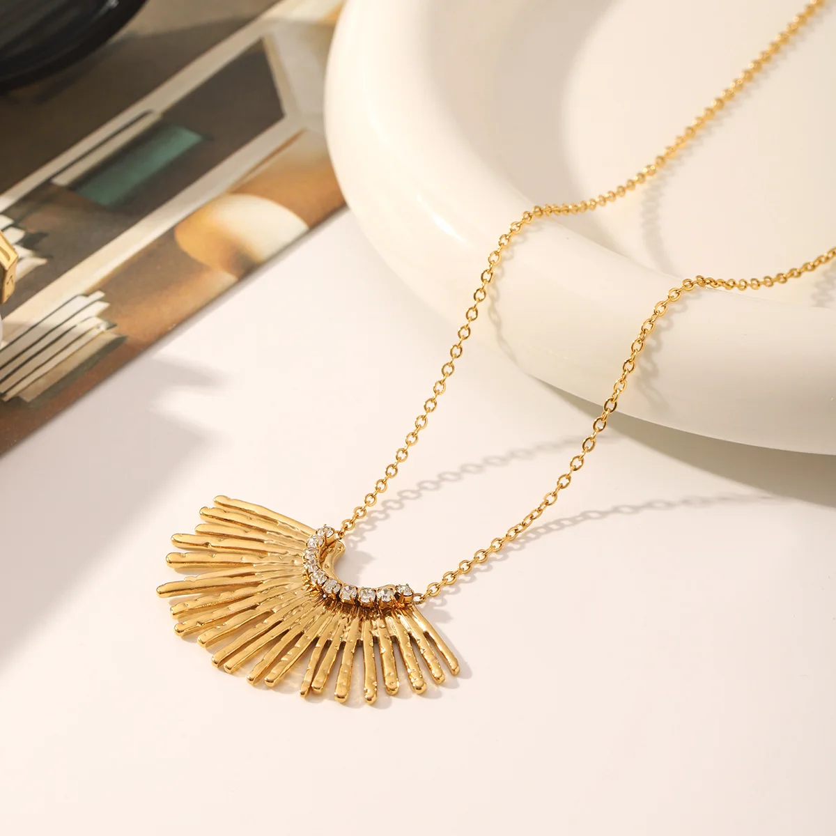 MW Ins Style 18K Gold Fan-Shaped Stainless Steel Diamond Pendant Necklace Geometric Multi Radial Lines Design Necklace