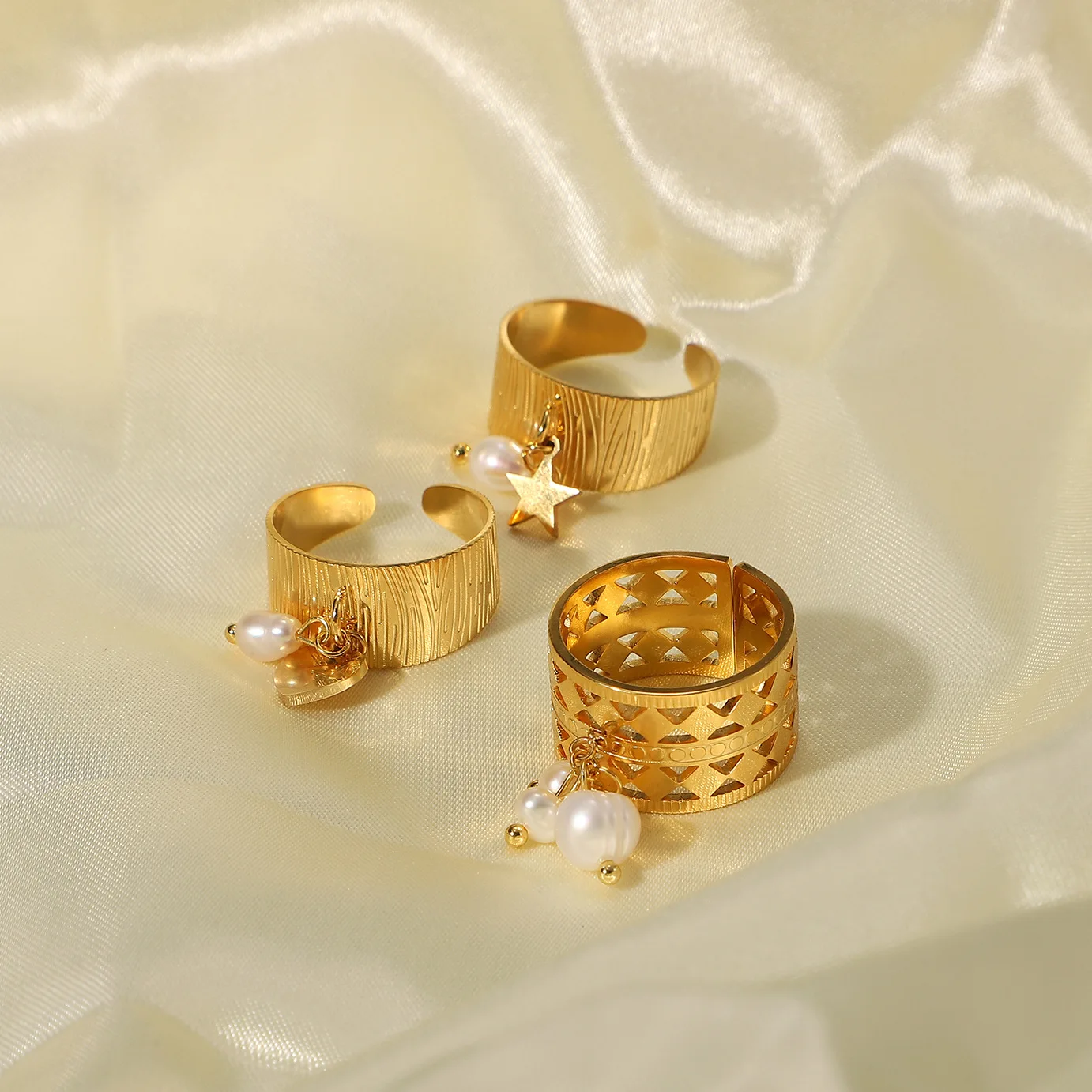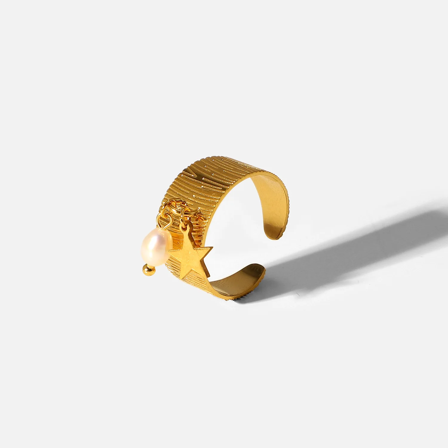 MW Women's Stylish 18K Gold-Plated Stainless Steel Ring - French Textured, Open Adjustable Design with Star & Pearl Accents