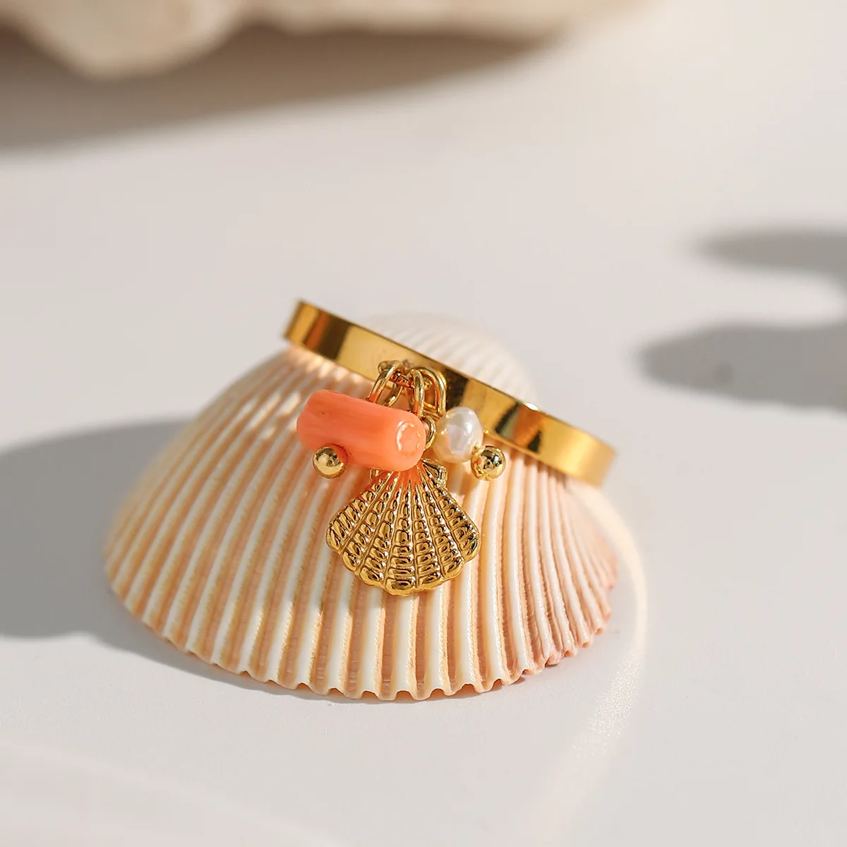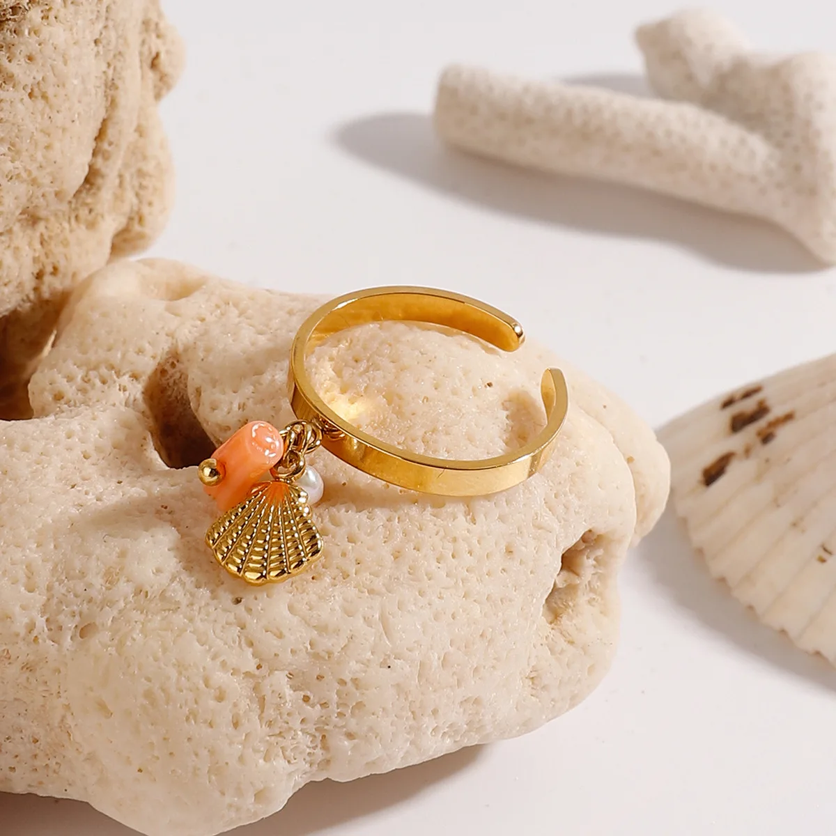 MW Women's INS-Style Ocean-Inspired Stainless Steel Ring with Threaded Shell Pendant, Polished Surface and Adjustable Design