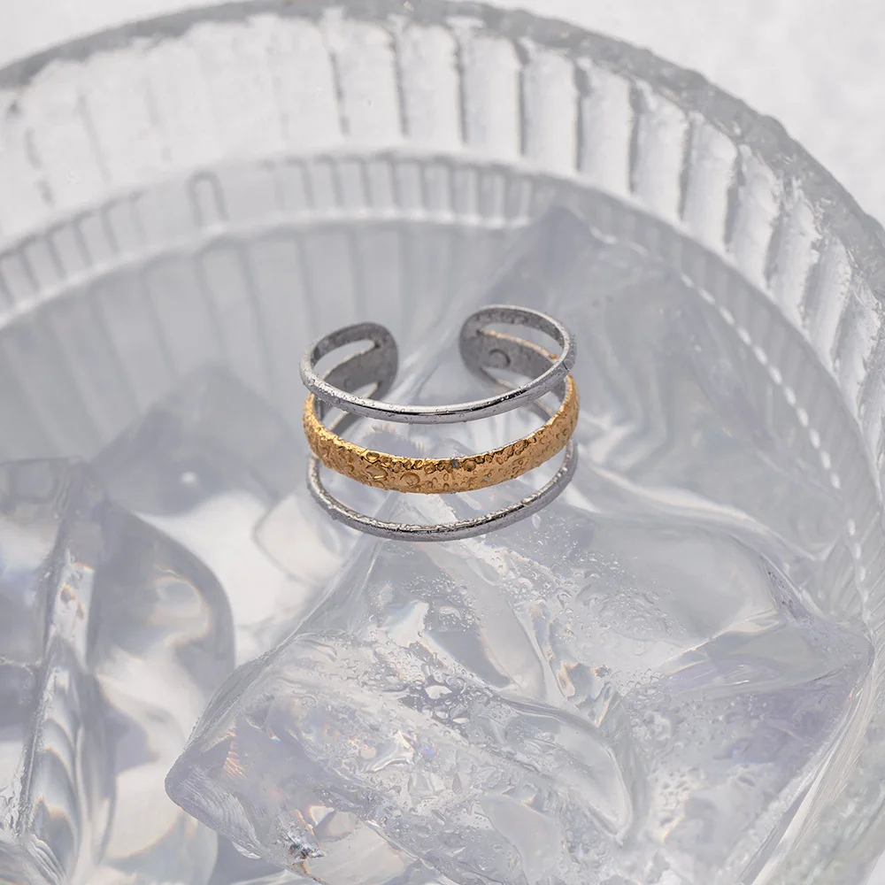 MW Women's Trendy Minimalist 18K Gold-Plated Stainless Steel Ring Two Tone Three Layer Hollow Open Design Hammered Texture Daily