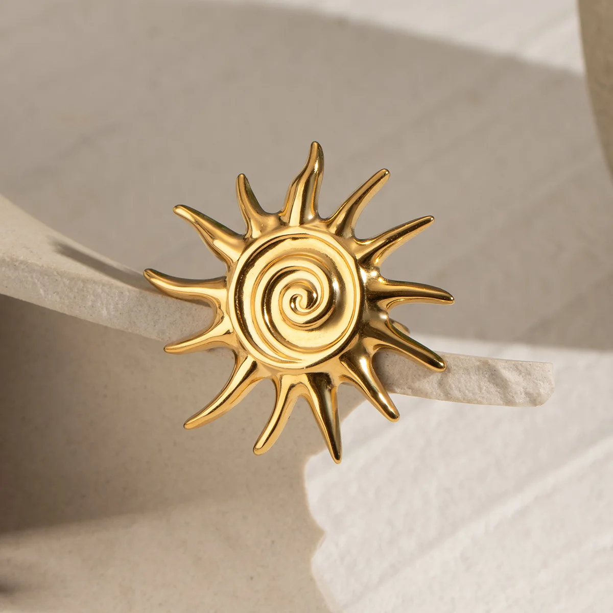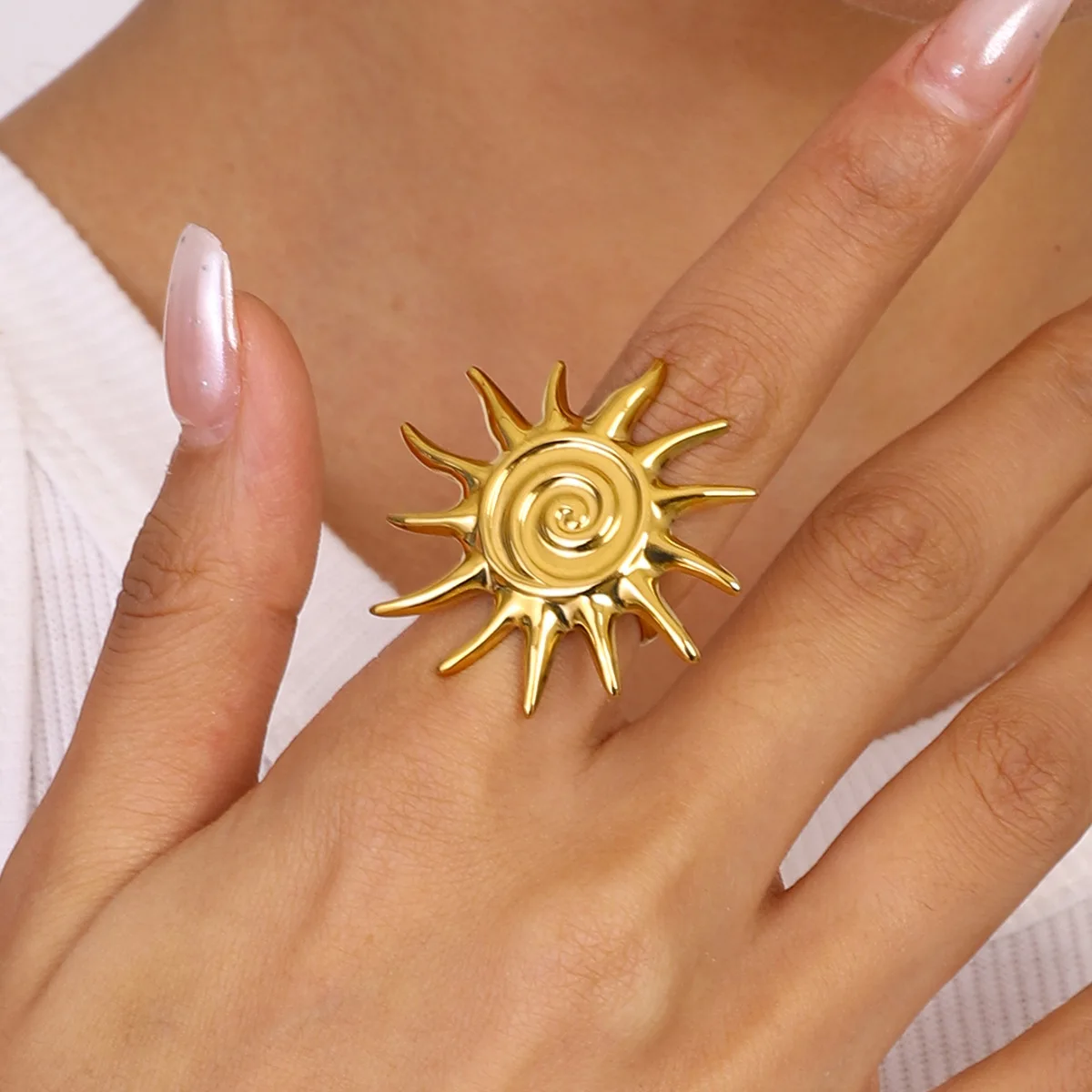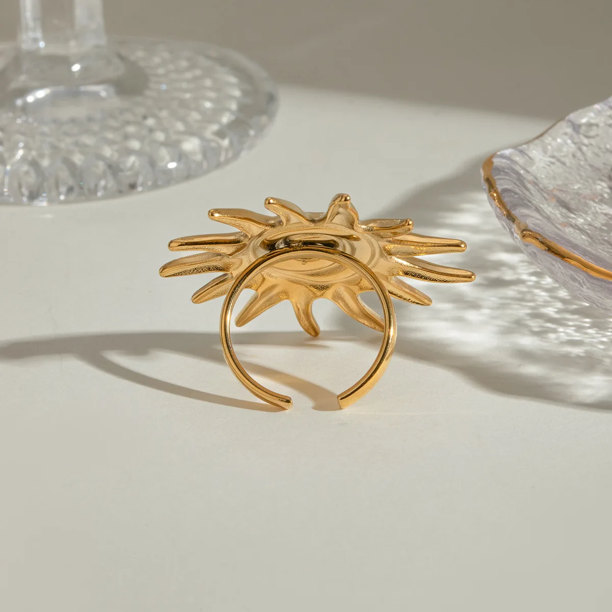 MW Women's Fashionable 18K Gold-Plated Stainless Steel Threaded Sunflower Open Ring, Waterproof and Adjustable Jewelry