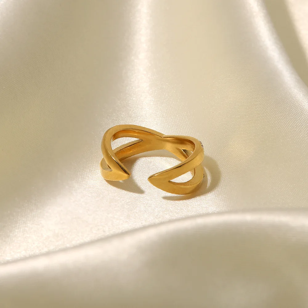 MW Women's Fashionable 18K Gold-Plated Stainless Steel Ring - X-Shaped Double-Layer Diamond Inlaid Design, Suitable for Wedding