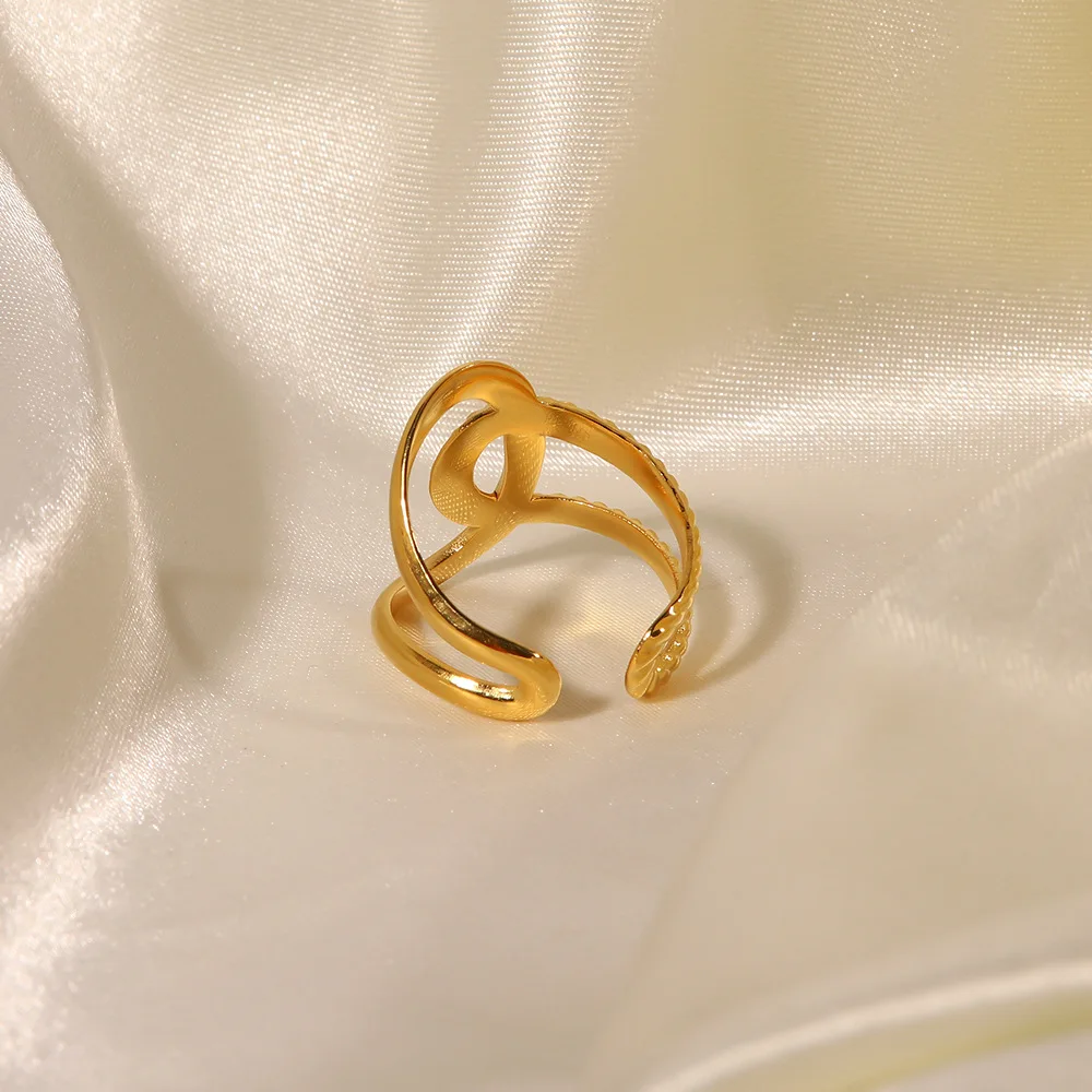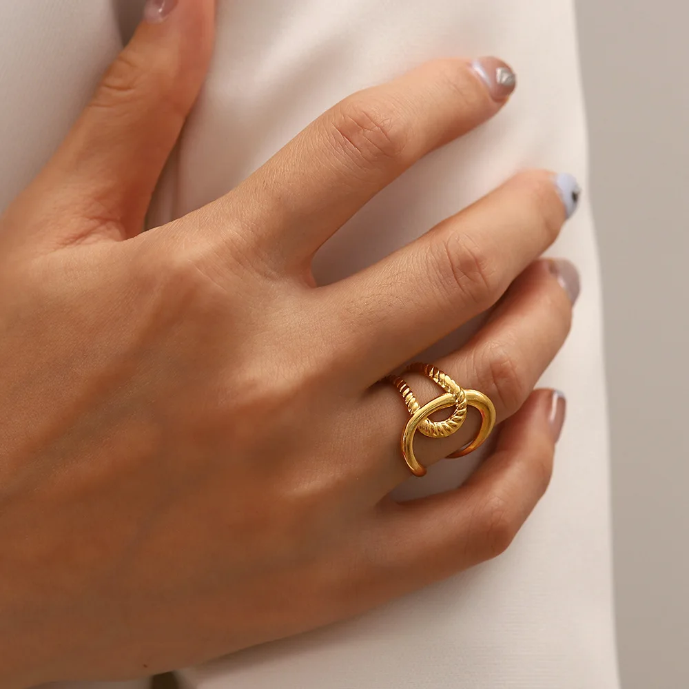 MW Women's 18K Gold-Plated Stainless Steel Ring-Fashionable Minimalist Hip Hop Knot Design Hollowed-Out Lines Open Style Daily