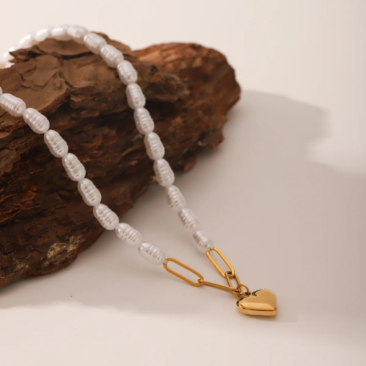 MW French Fashion Royal Style Stainless Steel 18K PVD Plated Paper Clip Chain Love Heart Pendant Pearl Necklace for Girls