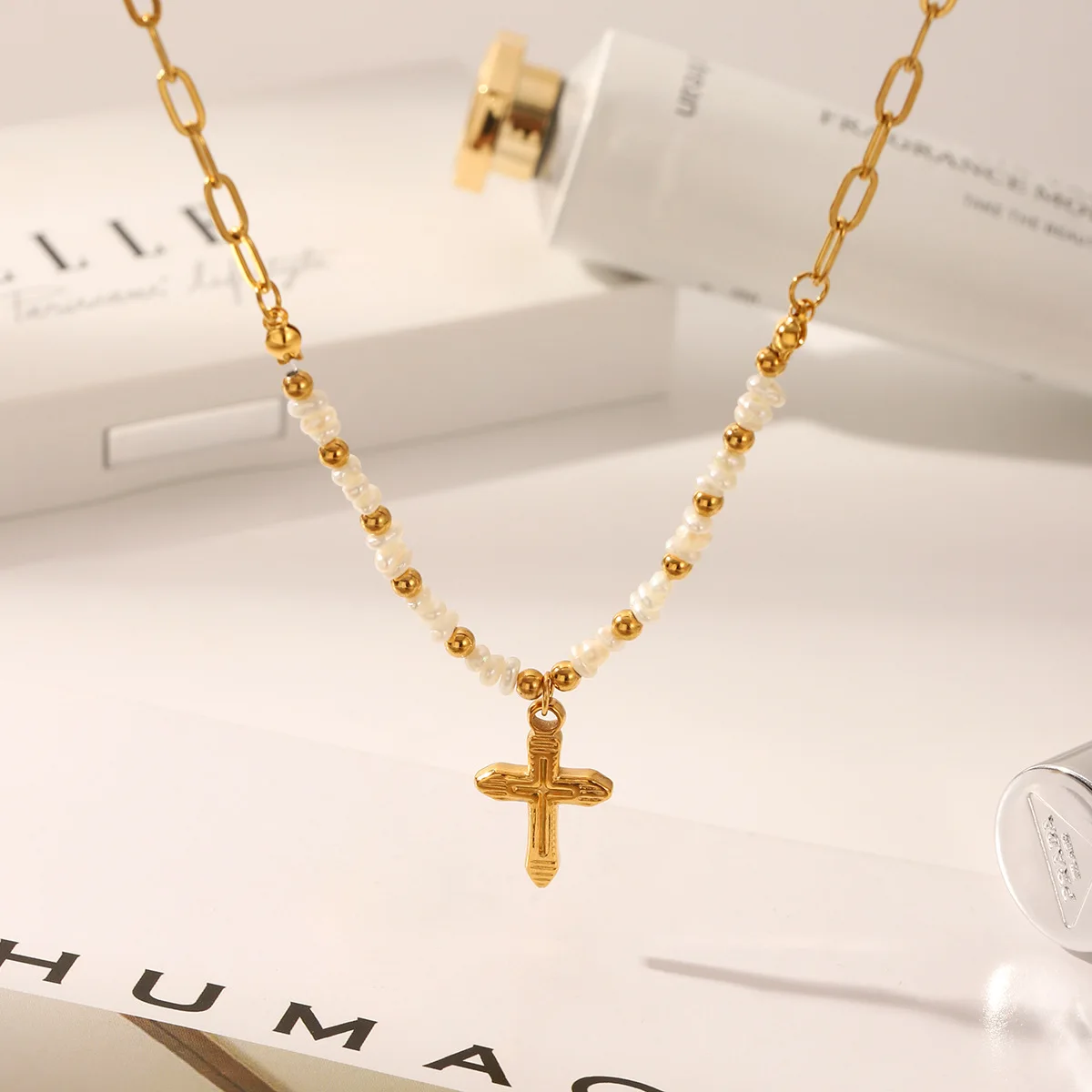 MW Vintage Rhinestone 18K Gold Plated Stainless Steel Necklace Cross Pendant Necklace Freshwater Pearl Necklace for Women