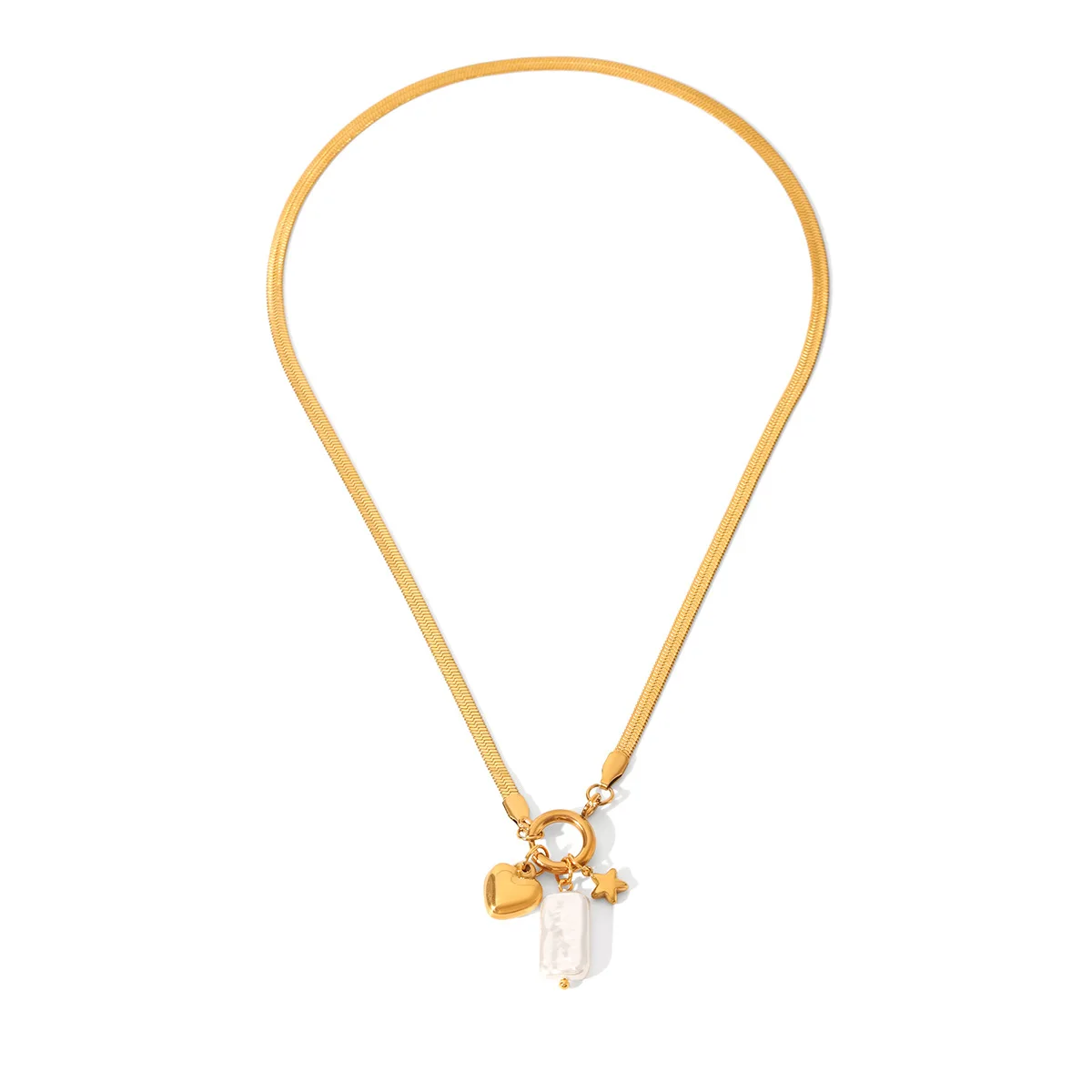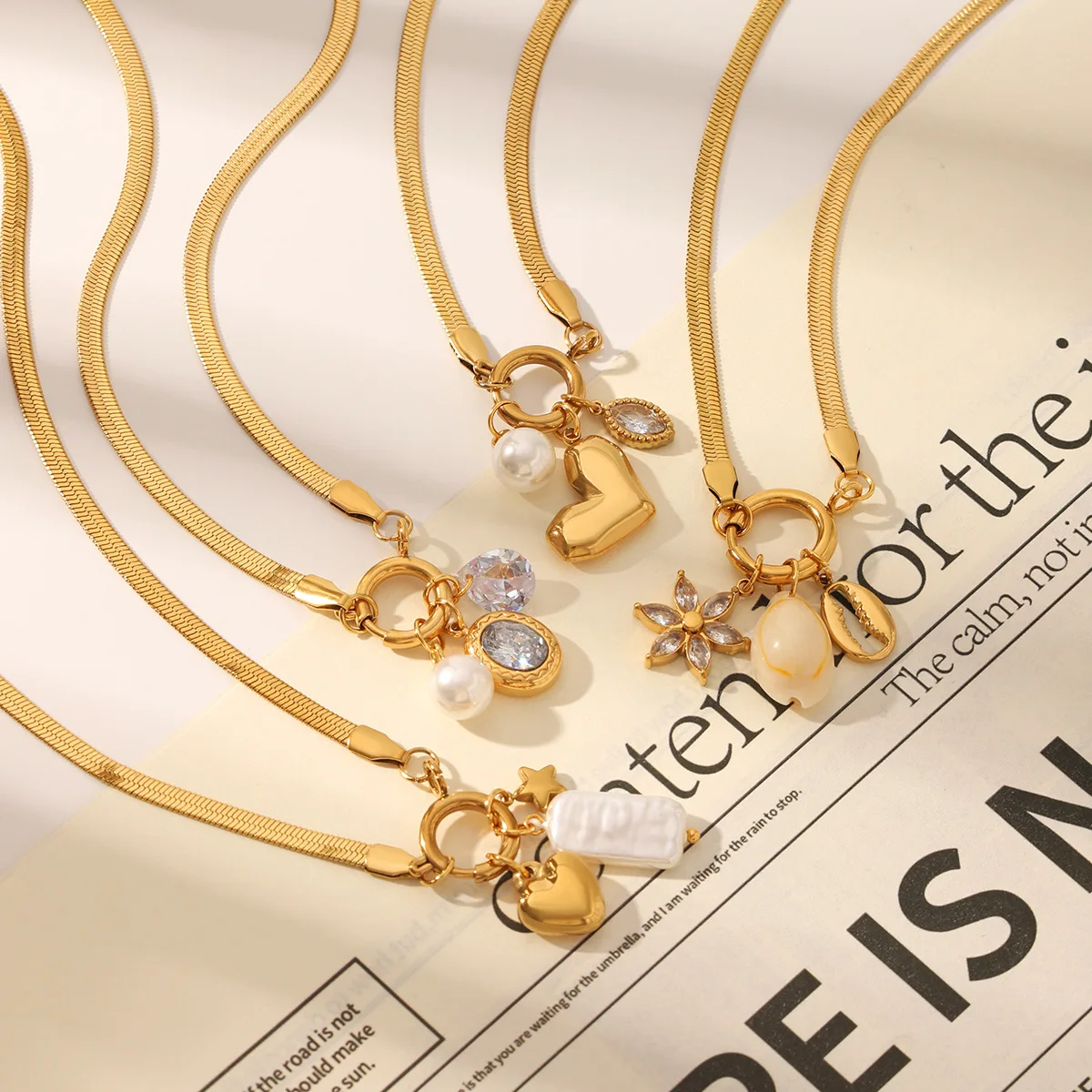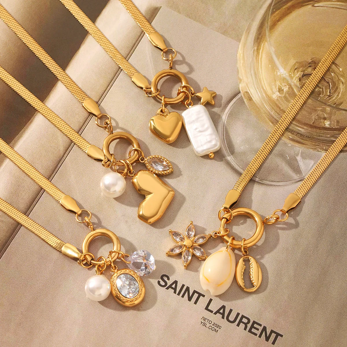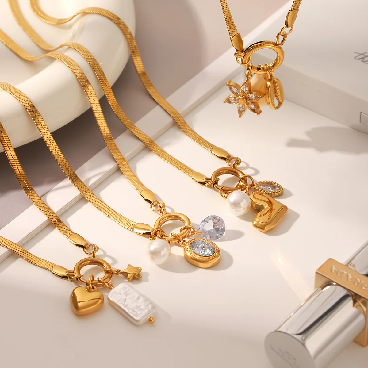 MW Fashion 18k Gold Plated Snap Buckle DIY Jewelry Stainless Steel Blade Chain Zircon Heart Pearl Pendant Necklace for Party