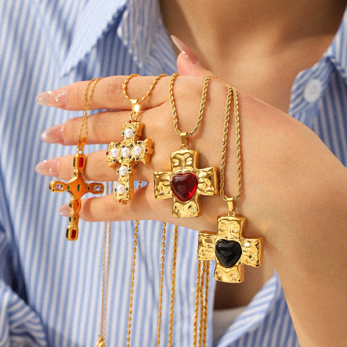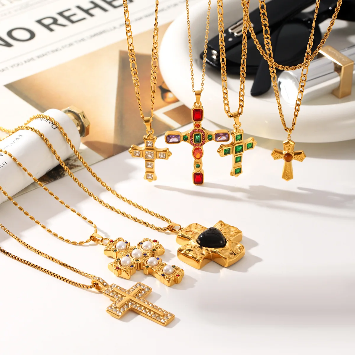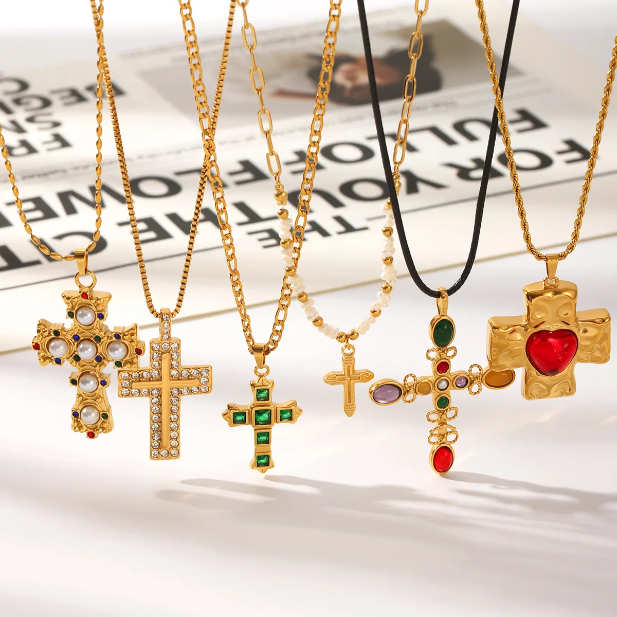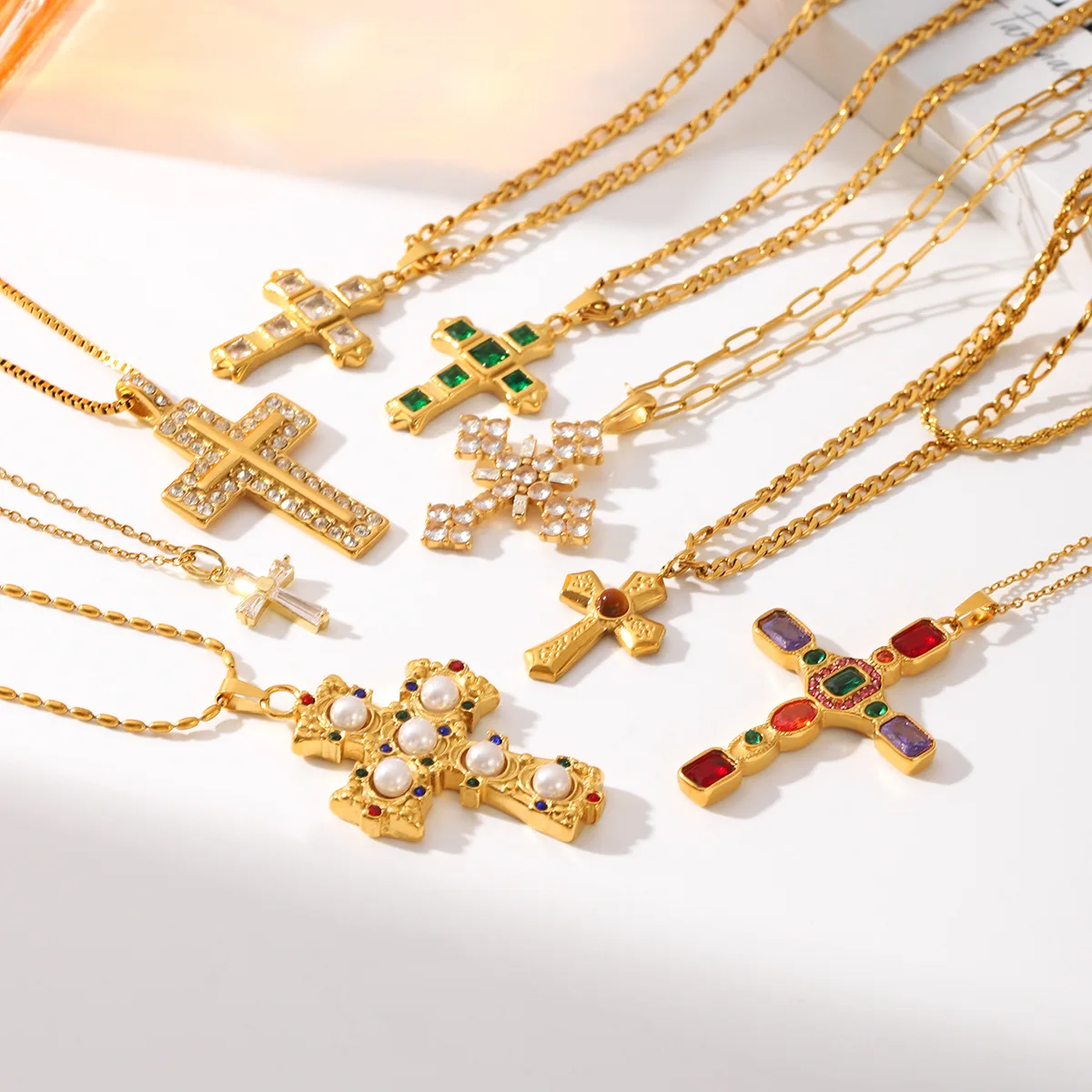 MW Design Vintage Artificial Zircon Jewelry Stainless Steel 18k Gold Pendant Necklaces Lady Fashion Gothic Zircon Cross Necklace