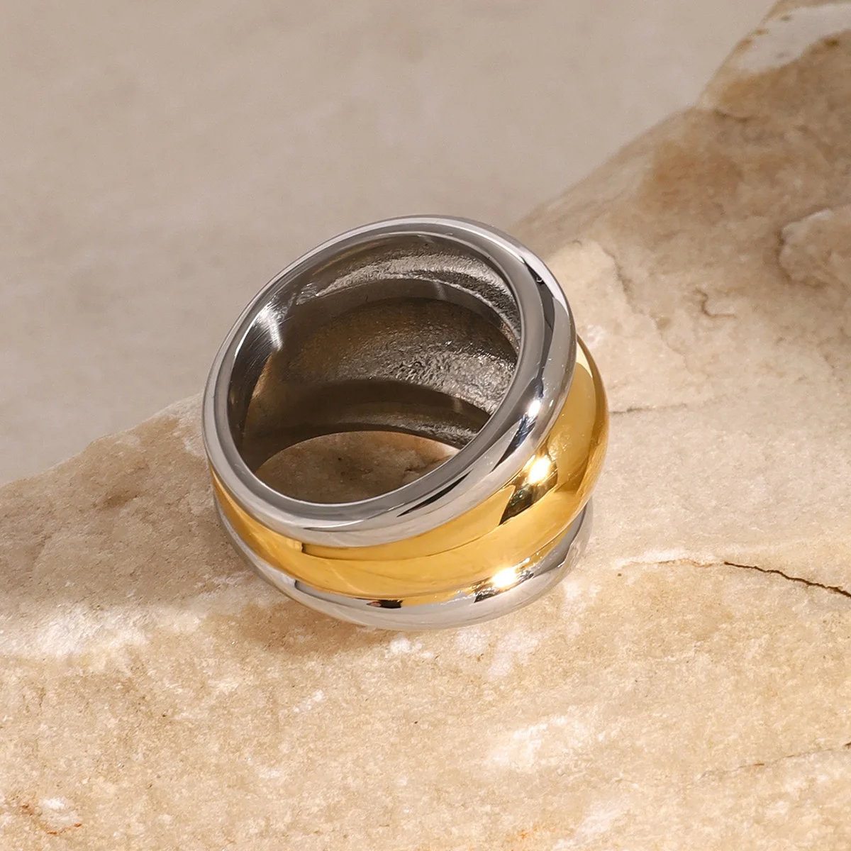 MW Women's Modern Fashionable 18K Gold-Plated Stainless Steel Geometric Two-Tone Three-Layer Ring-Waterproof Light Luxury