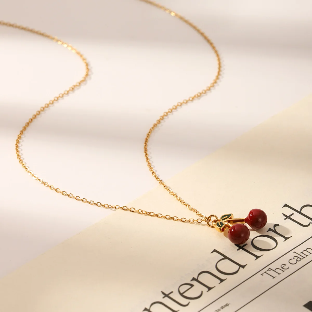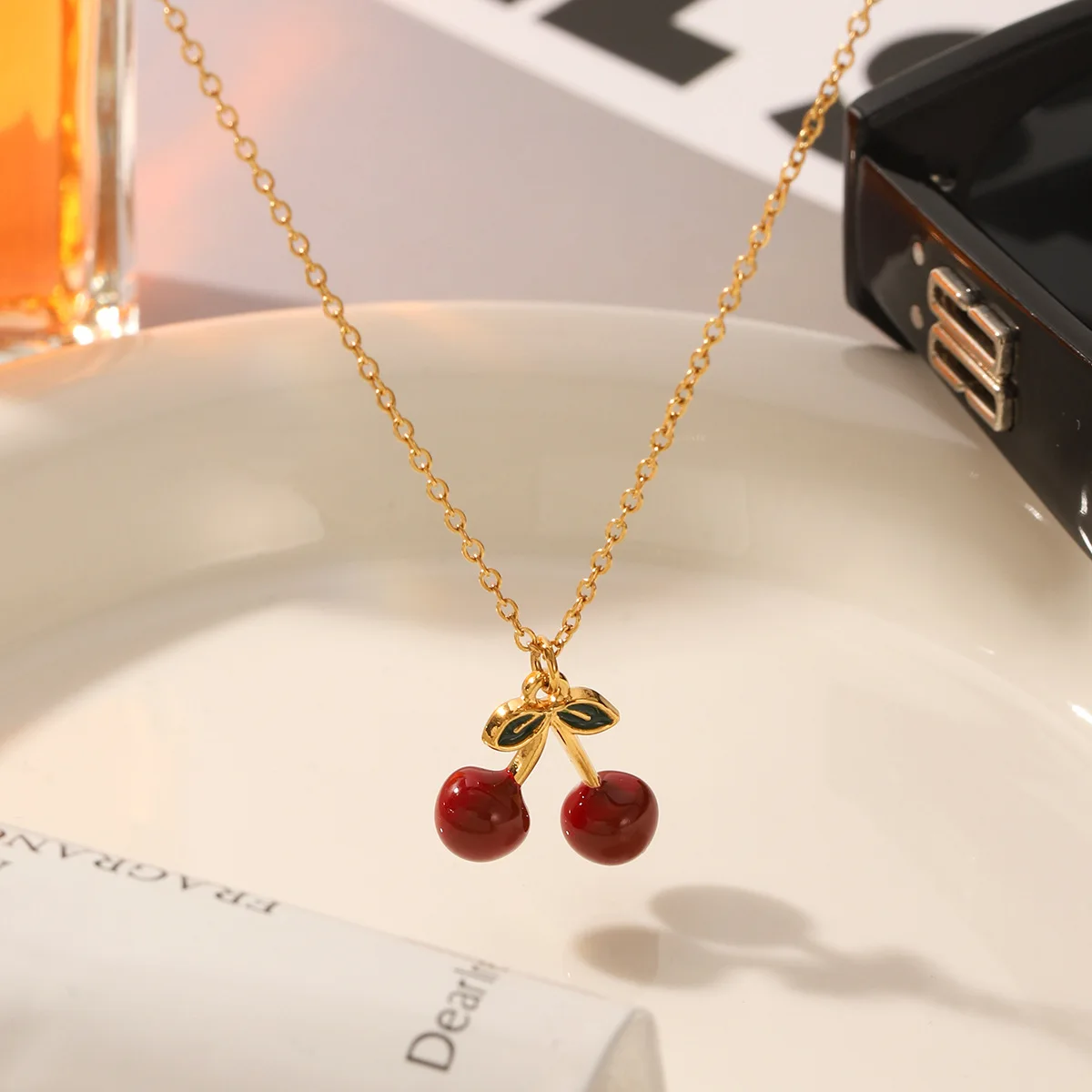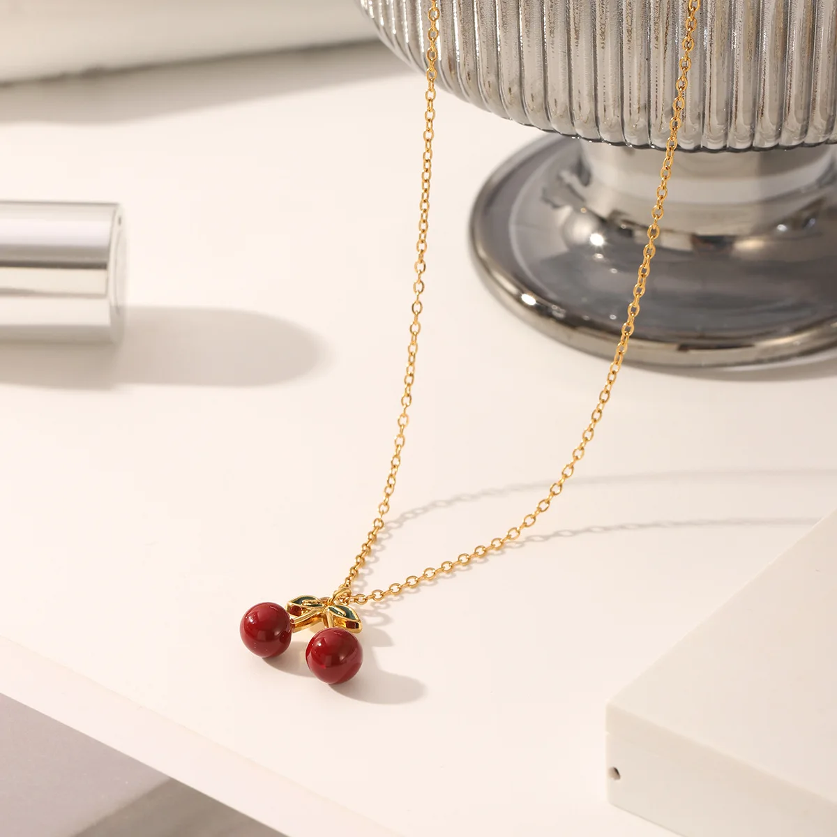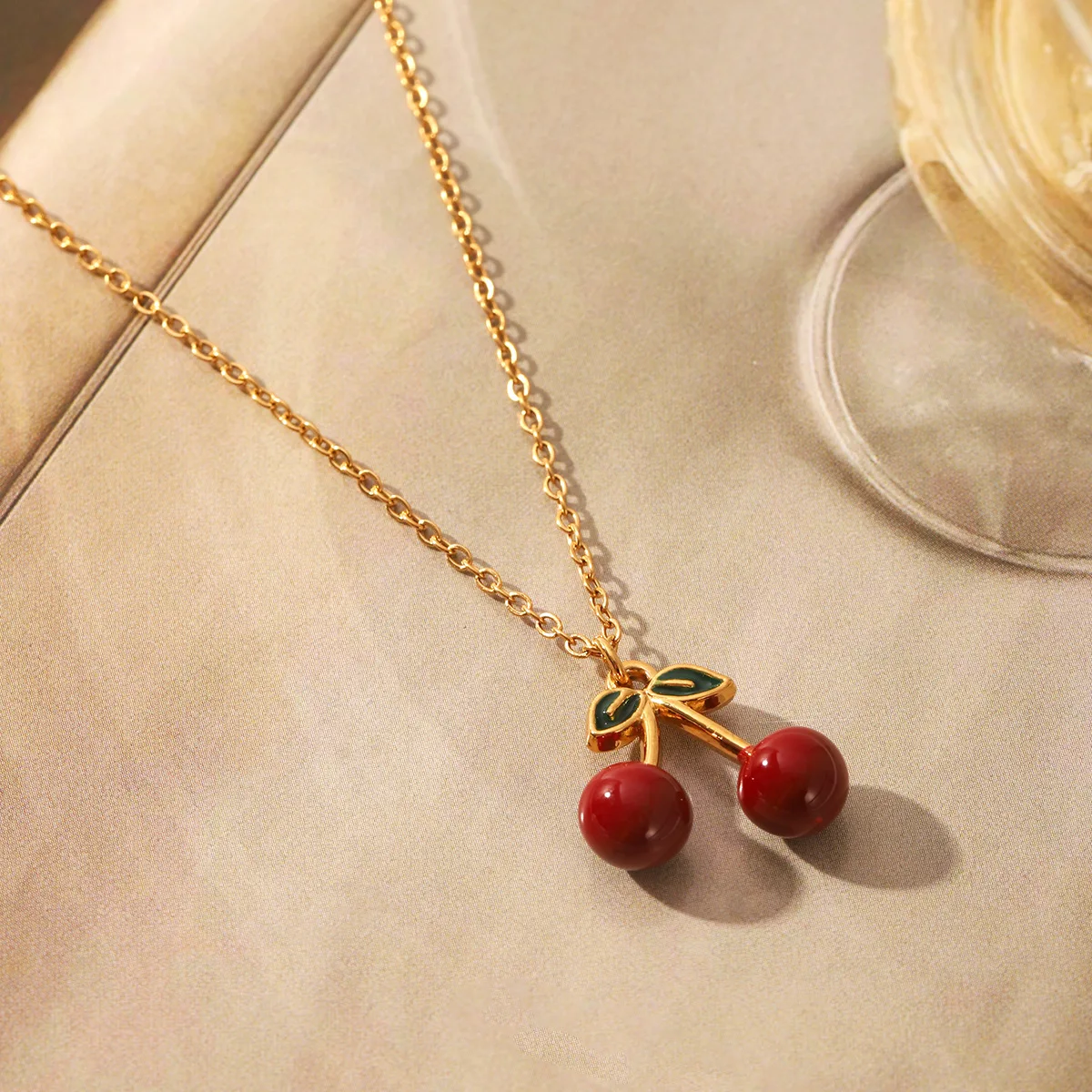 MW New Trendy 18K Gold Plated Stainless Steel Christian Waterproof Pendant Necklace Elegant Fruit Red Cherry Long Chains Women