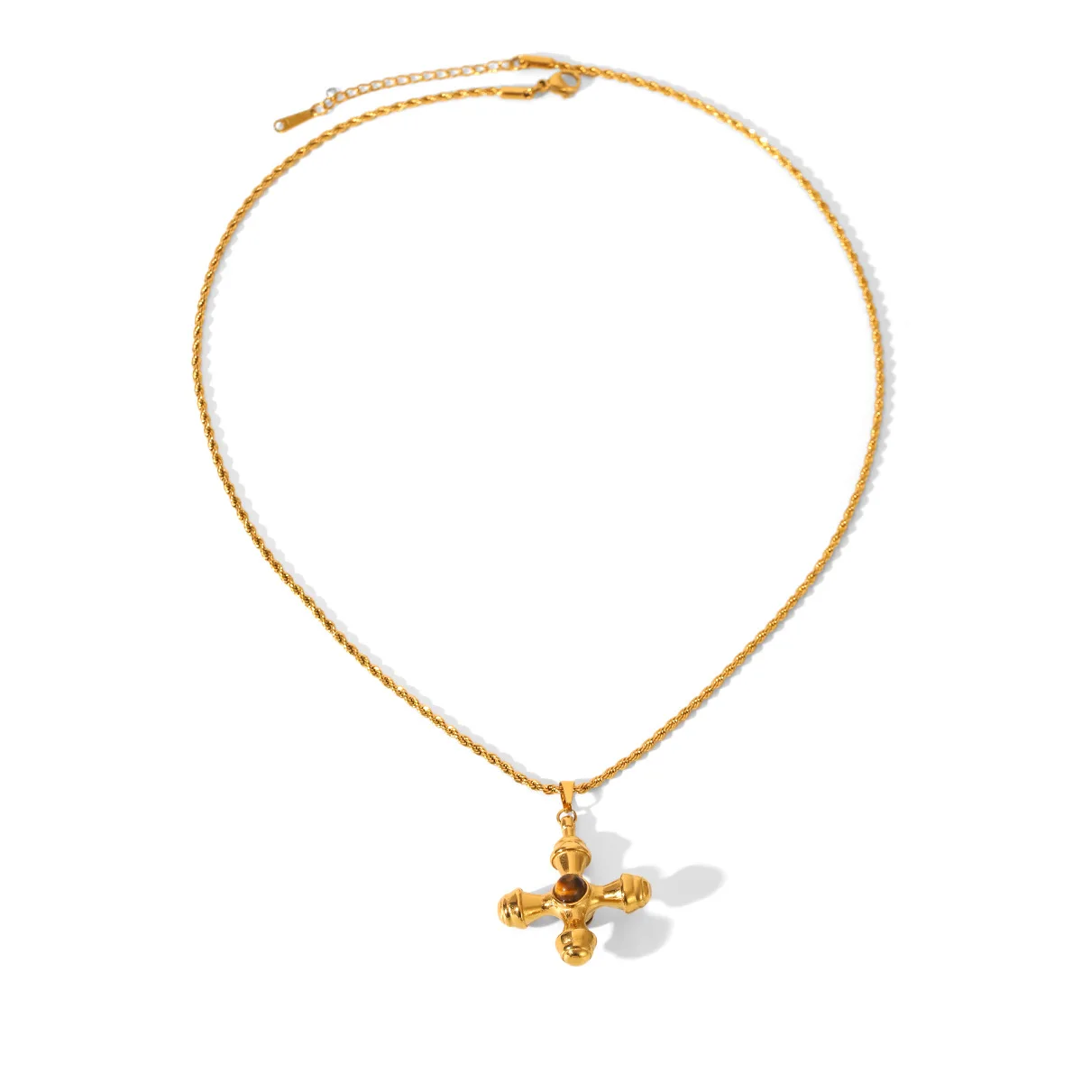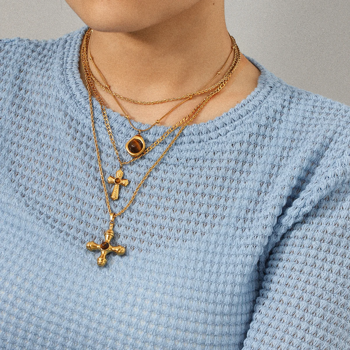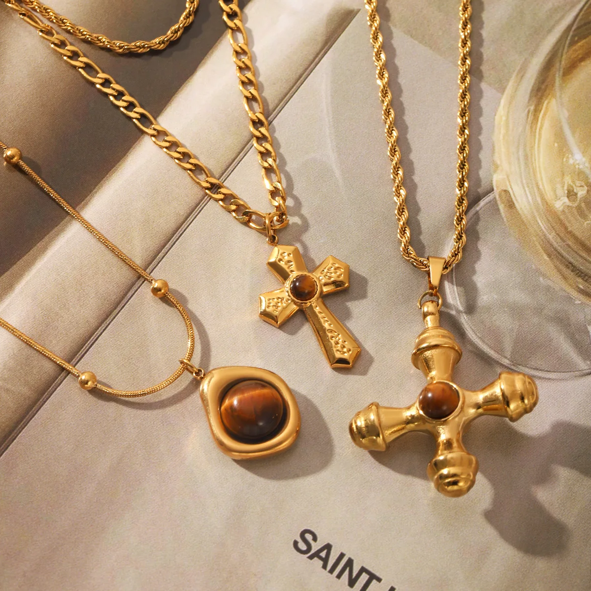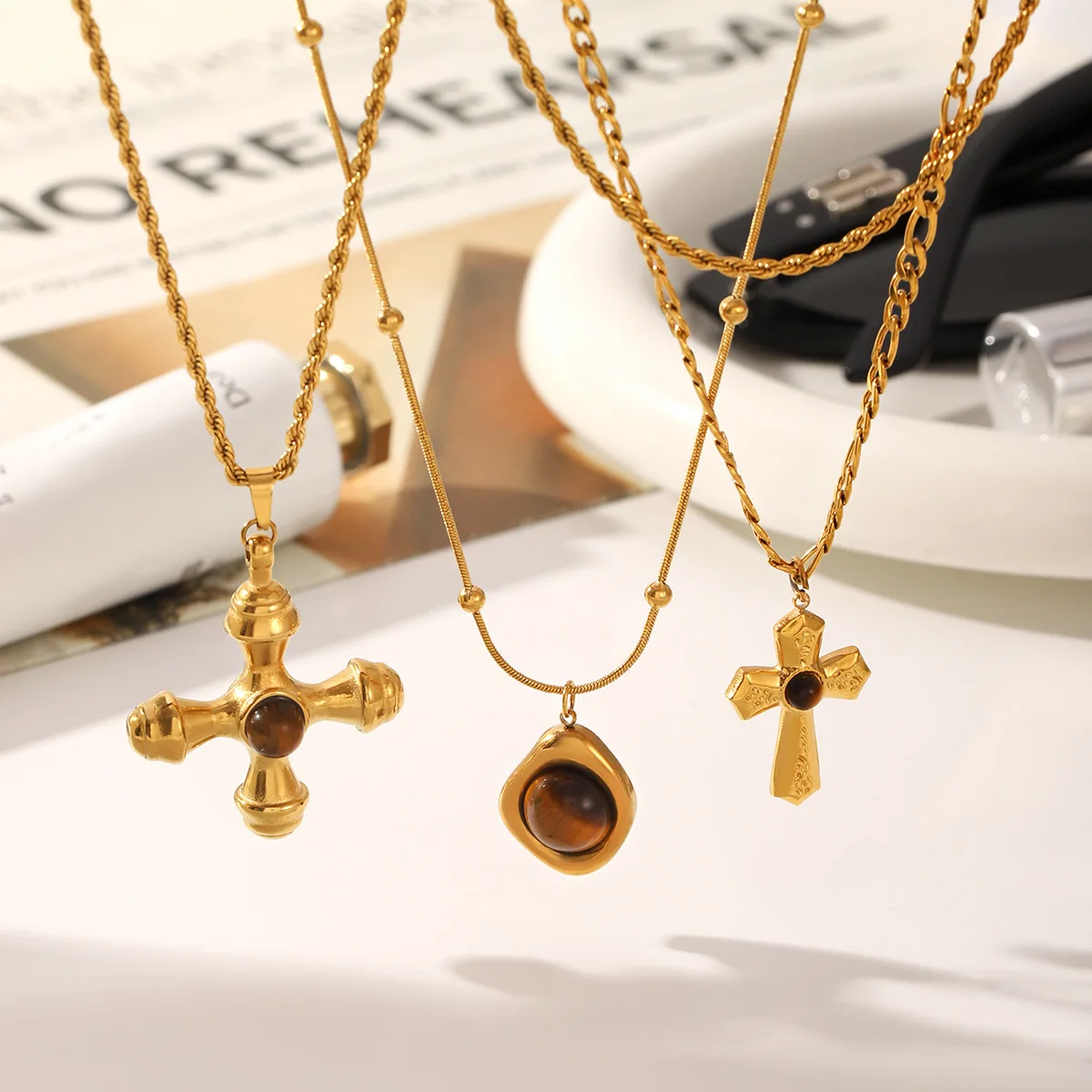 MW Retro 18K PVD Gold Plated Crossed Green Agate Tiger Eye Necklace Natural Stone Cross Pendant Necklace for Women Girls