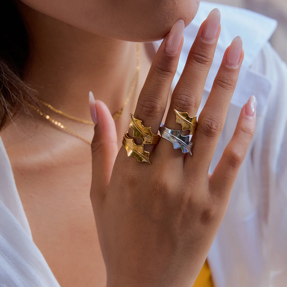 MW Women's Trendy European and American Style 18K Gold-Plated Stainless Steel Two-Tone Leaf-Shaped Open Adjustable Daily Ring